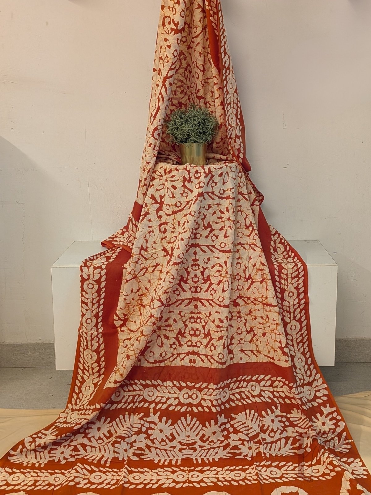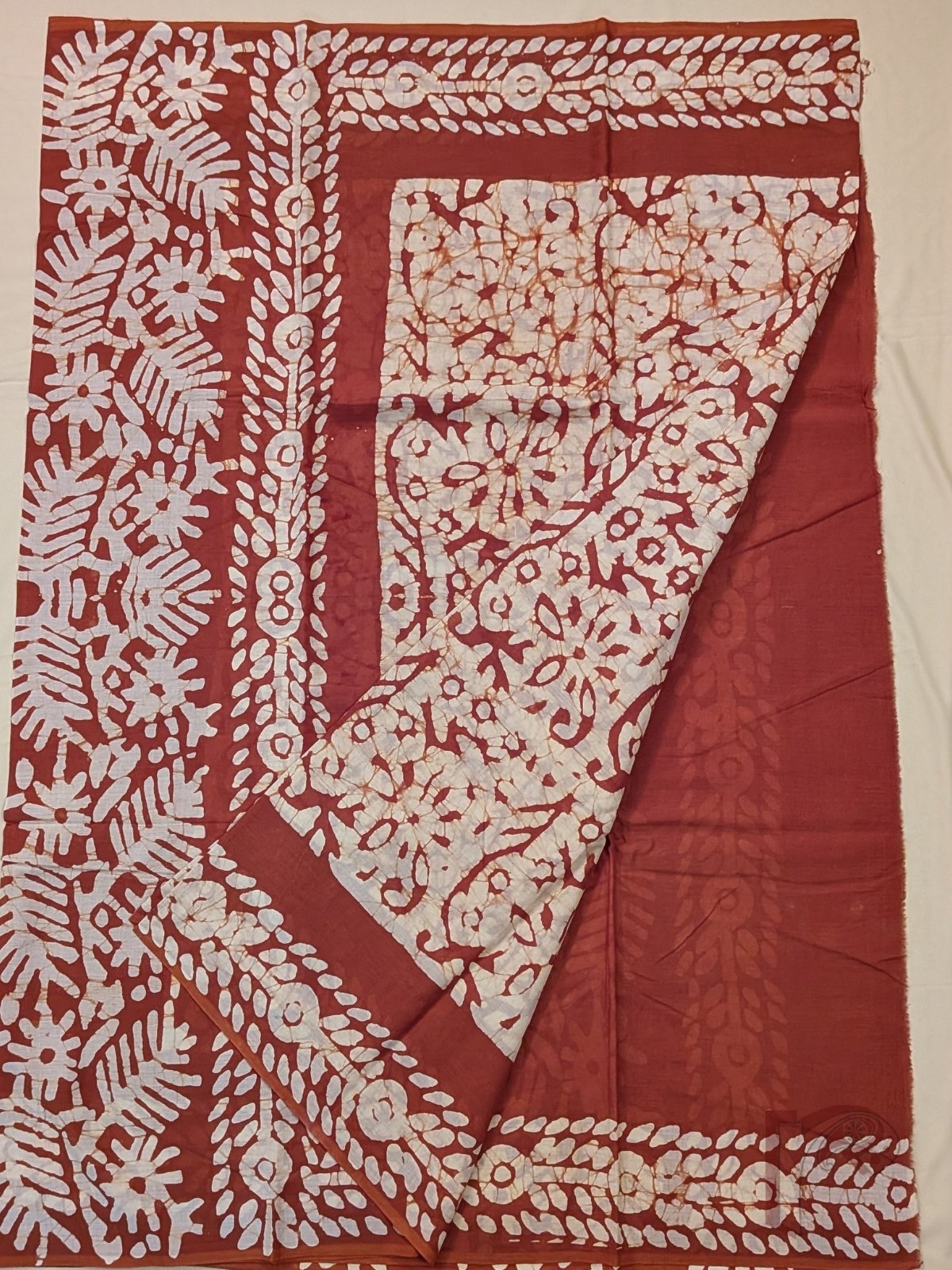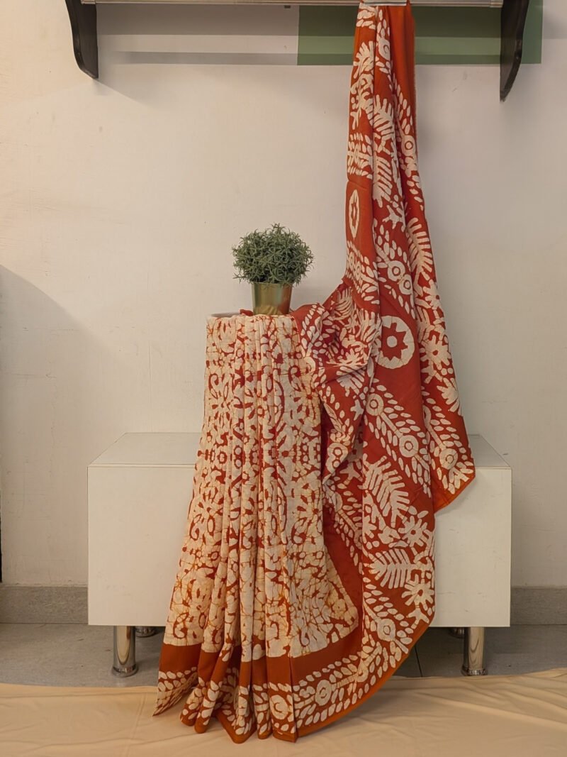 Warm and artisanal, this cream and rusty brown mul cotton saree highlights traditional batik-inspired detailing with a contemporary touch. The cream body carries batik-style prints in rusty brown, creating a textured handcrafted feel. The saree is framed with rusty brown borders featuring rounded floral and leaf batik motifs, adding bold contrast. The pallu in rusty brown continues with cream batik flower and leaf prints, forming a cohesive and striking finish. Crafted in soft, breathable mul cotton, this saree drapes effortlessly and is ideal for day-long wear. The look is completed with a plain rusty brown blouse accented with batik motif borders for sleeves and back, enhancing the overall coordinated design.