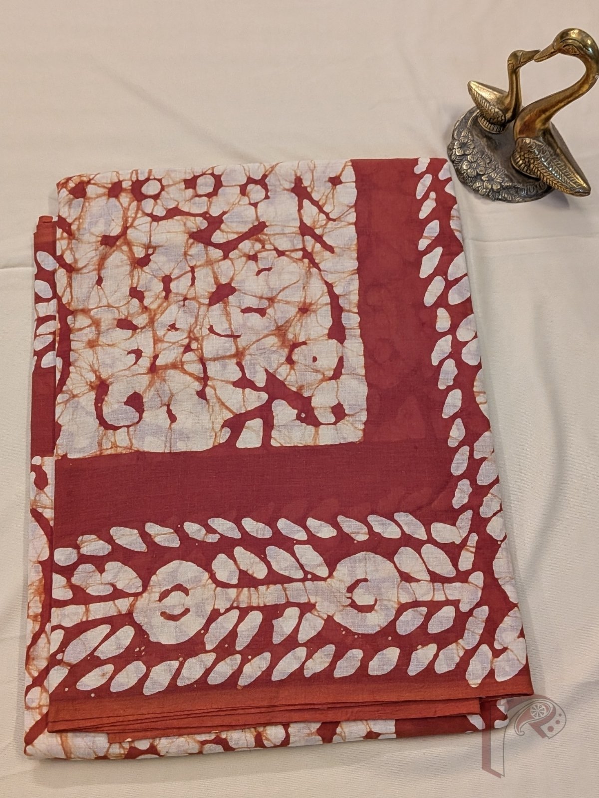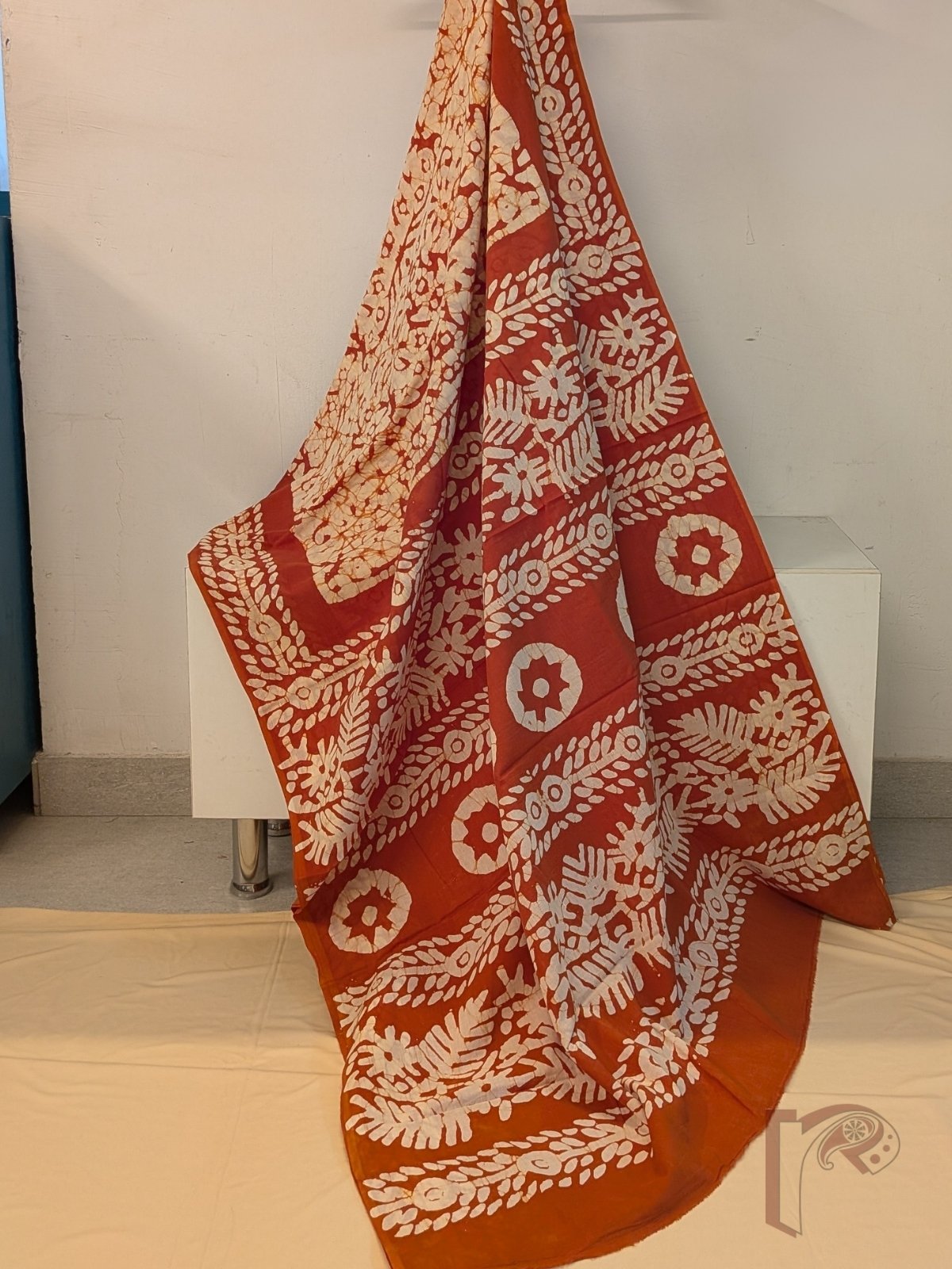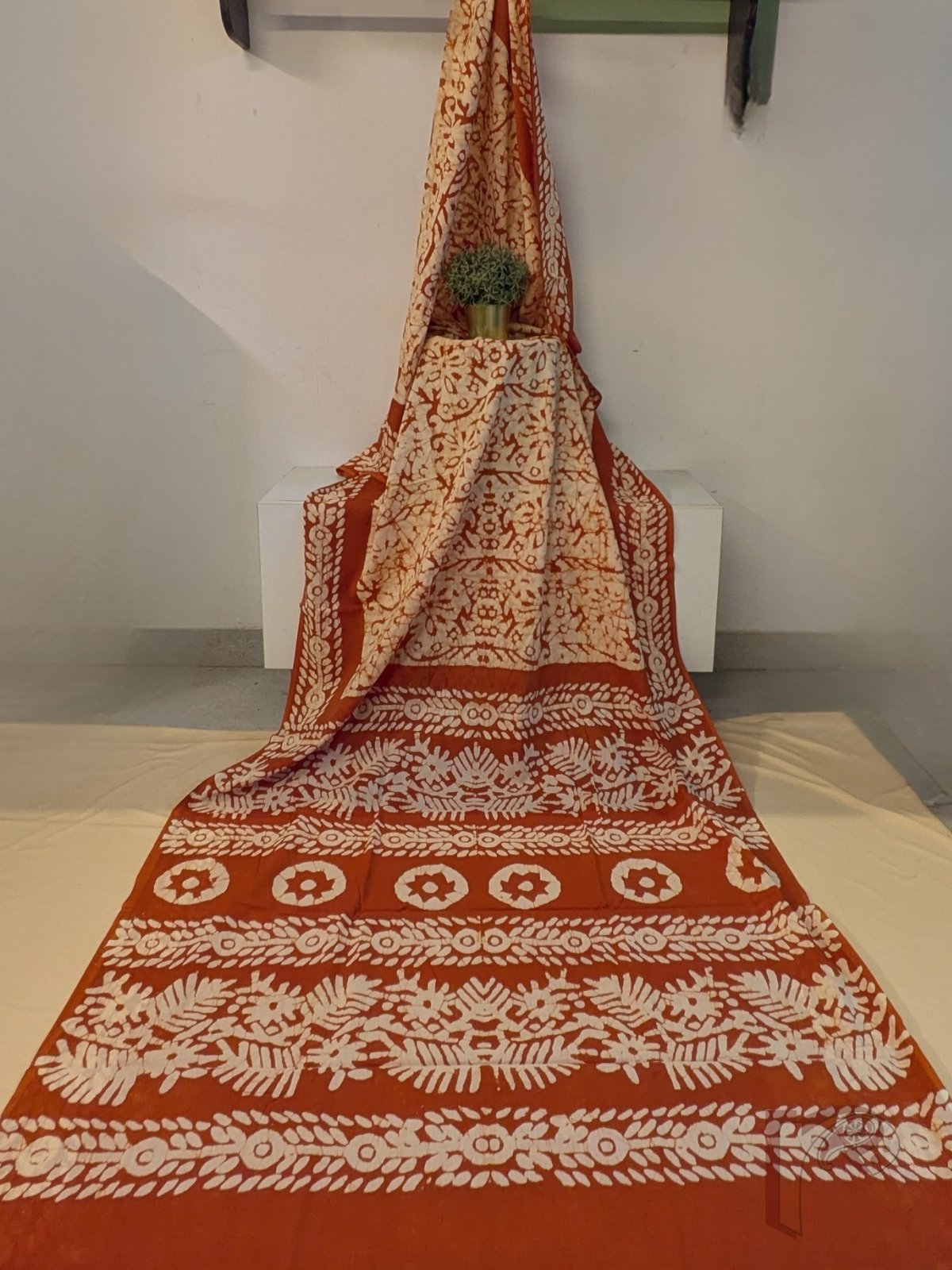 Warm and artisanal, this cream and rusty brown mul cotton saree highlights traditional batik-inspired detailing with a contemporary touch. The cream body carries batik-style prints in rusty brown, creating a textured handcrafted feel. The saree is framed with rusty brown borders featuring rounded floral and leaf batik motifs, adding bold contrast. The pallu in rusty brown continues with cream batik flower and leaf prints, forming a cohesive and striking finish. Crafted in soft, breathable mul cotton, this saree drapes effortlessly and is ideal for day-long wear. The look is completed with a plain rusty brown blouse accented with batik motif borders for sleeves and back, enhancing the overall coordinated design.