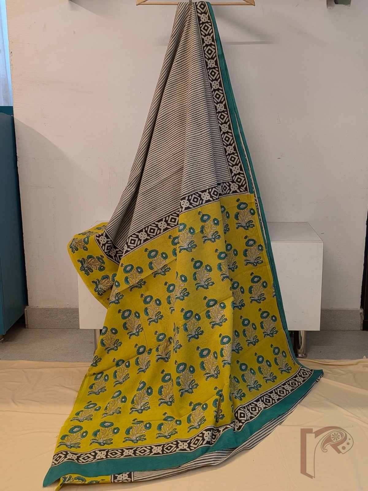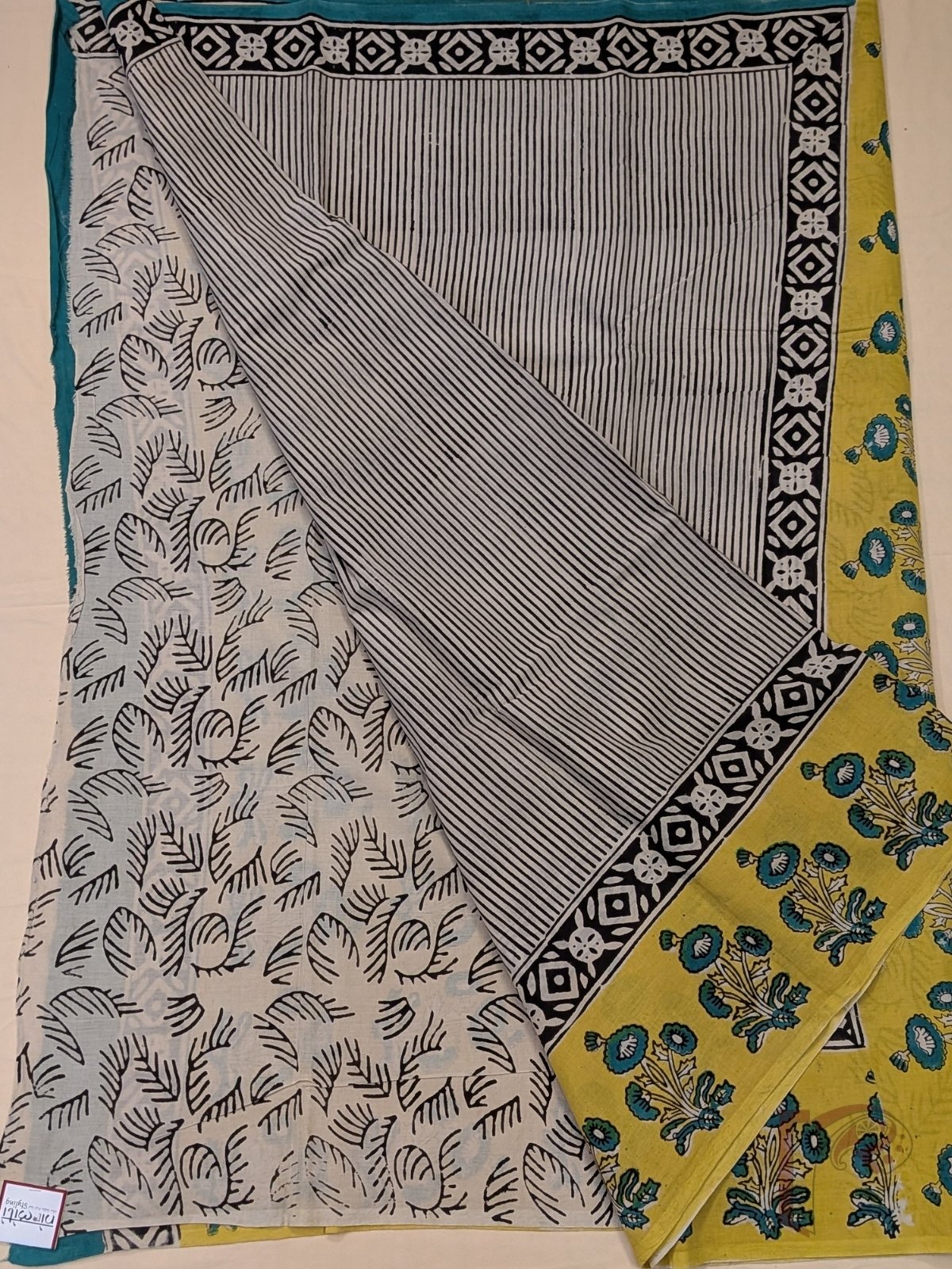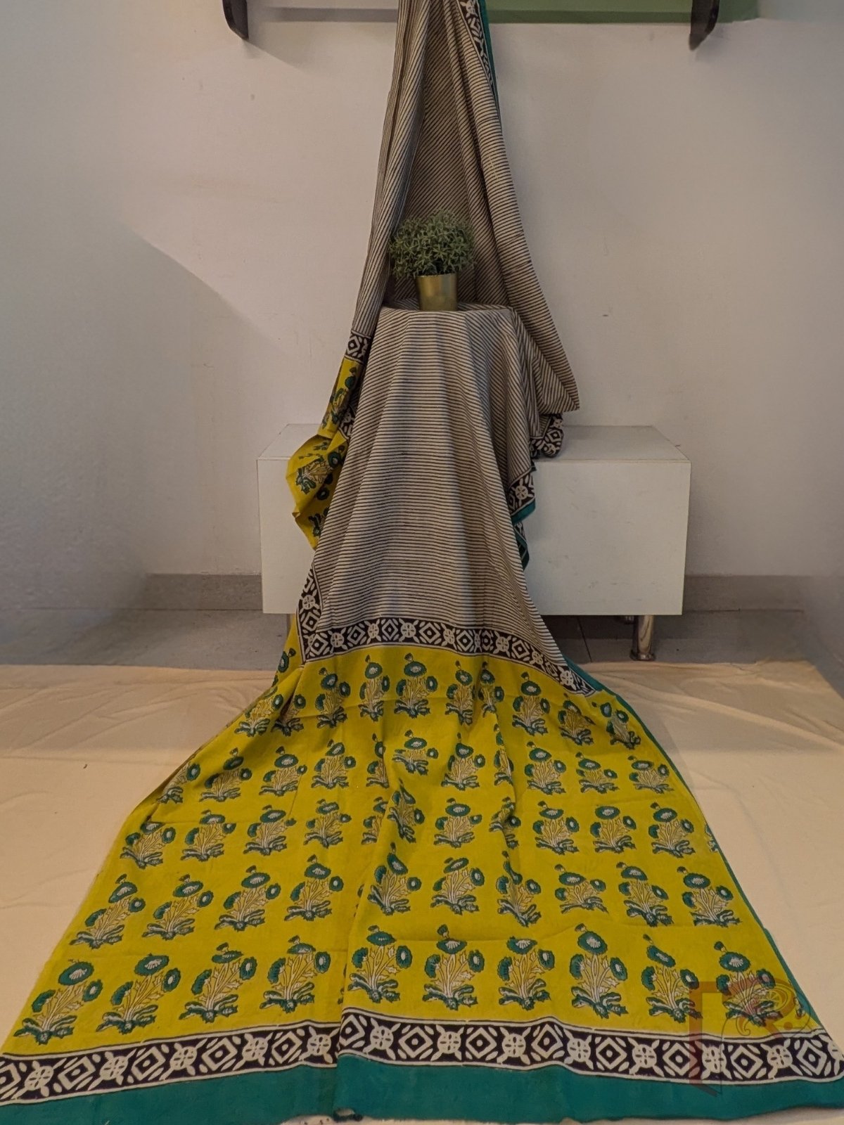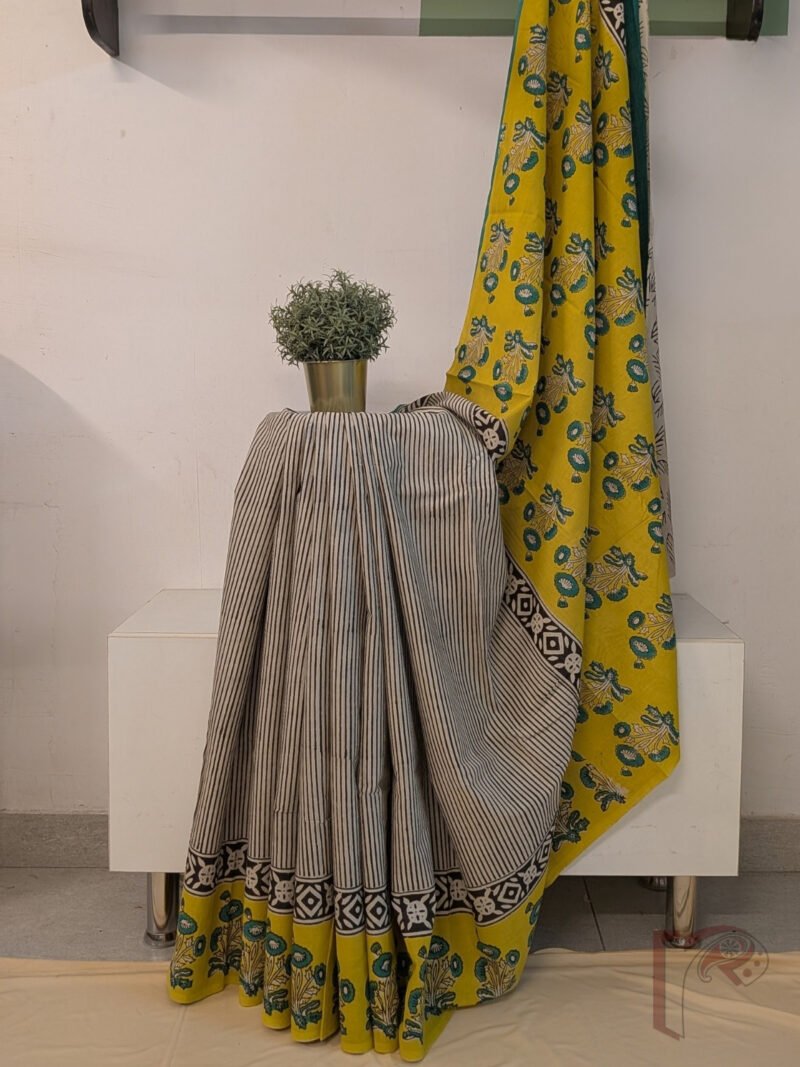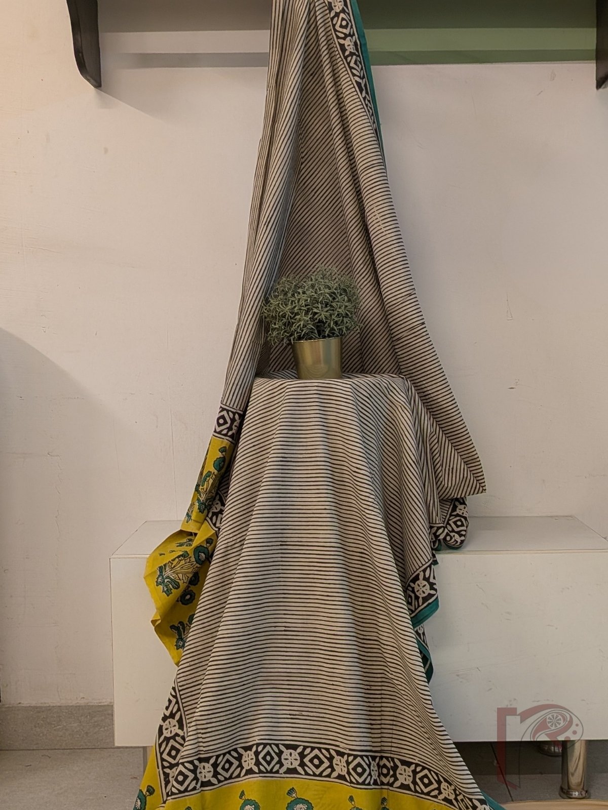 Bold yet graceful, this cream mul cotton saree blends contemporary aesthetics with traditional charm. The body features a modern black stripe print, creating a sleek, visually dynamic texture that remains subtle and elegant. Framing the saree is a 5-inch bright yellow border adorned with green and off-white floral and stem motifs, paired with a 2-inch black border above it featuring delicate cream prints, offering a layered, artisanal look. The pallu continues in golden yellow, accented with five rows of coordinated green and cream flower bunches, forming a vibrant focal point that elevates the drape. Crafted from lightweight, breathable mul cotton, this saree ensures comfort and effortless flow. The accompanying cream blouse is printed with all-over leaf stem patterns, finished with a 2-inch black border, perfectly complementing the body and border design for a cohesive, sophisticated ensemble.