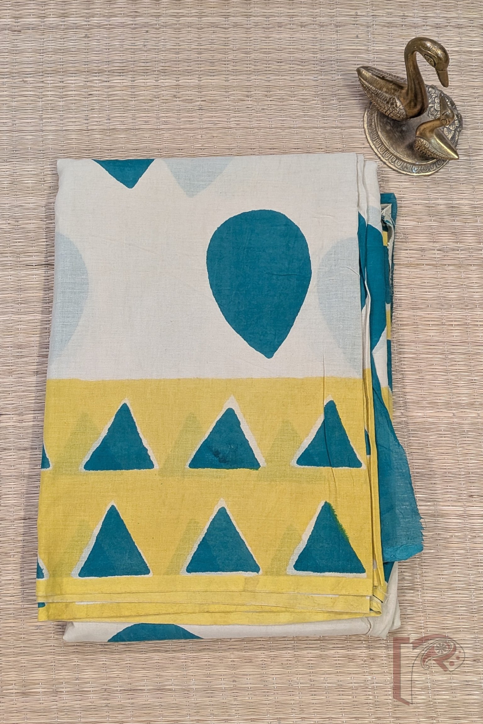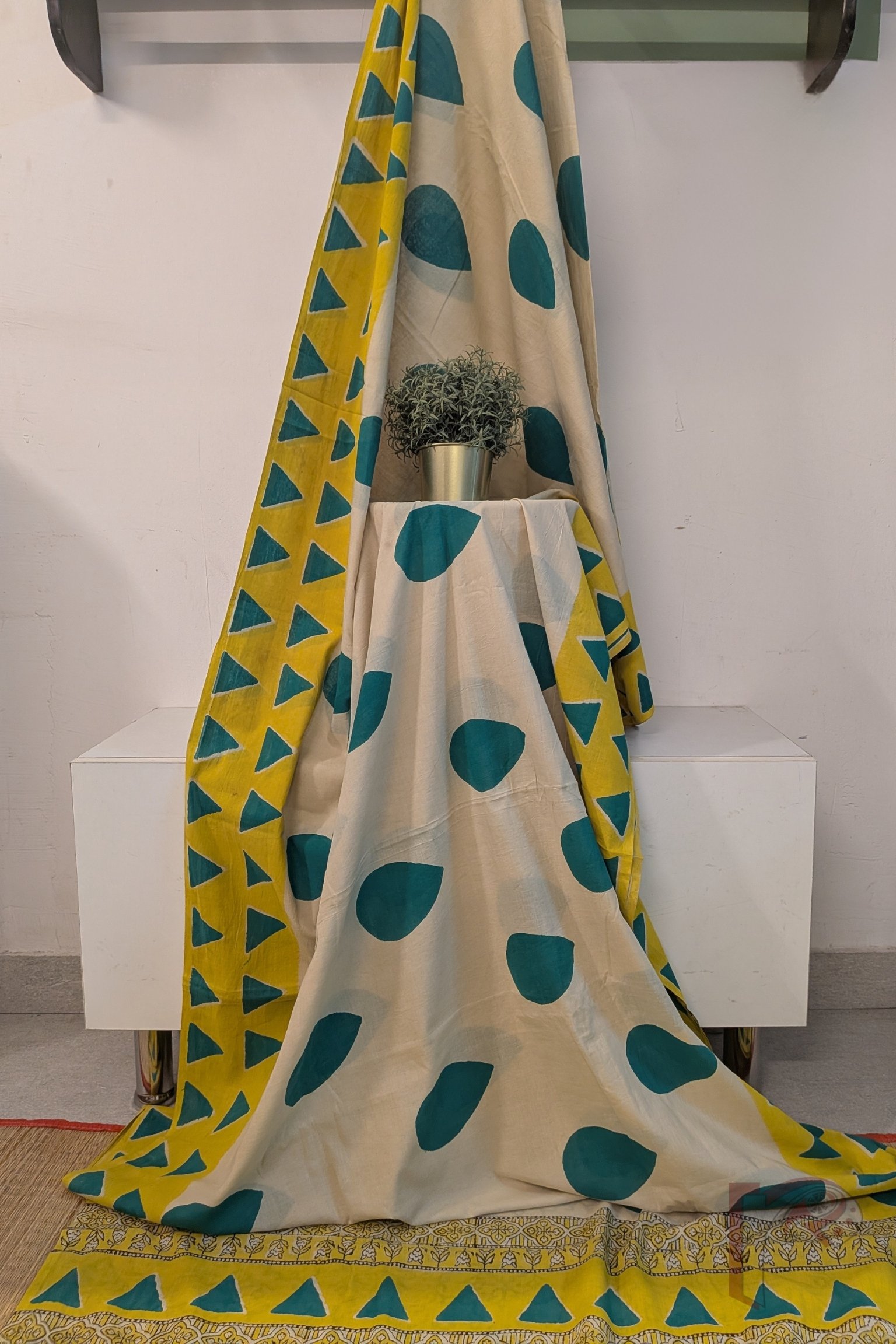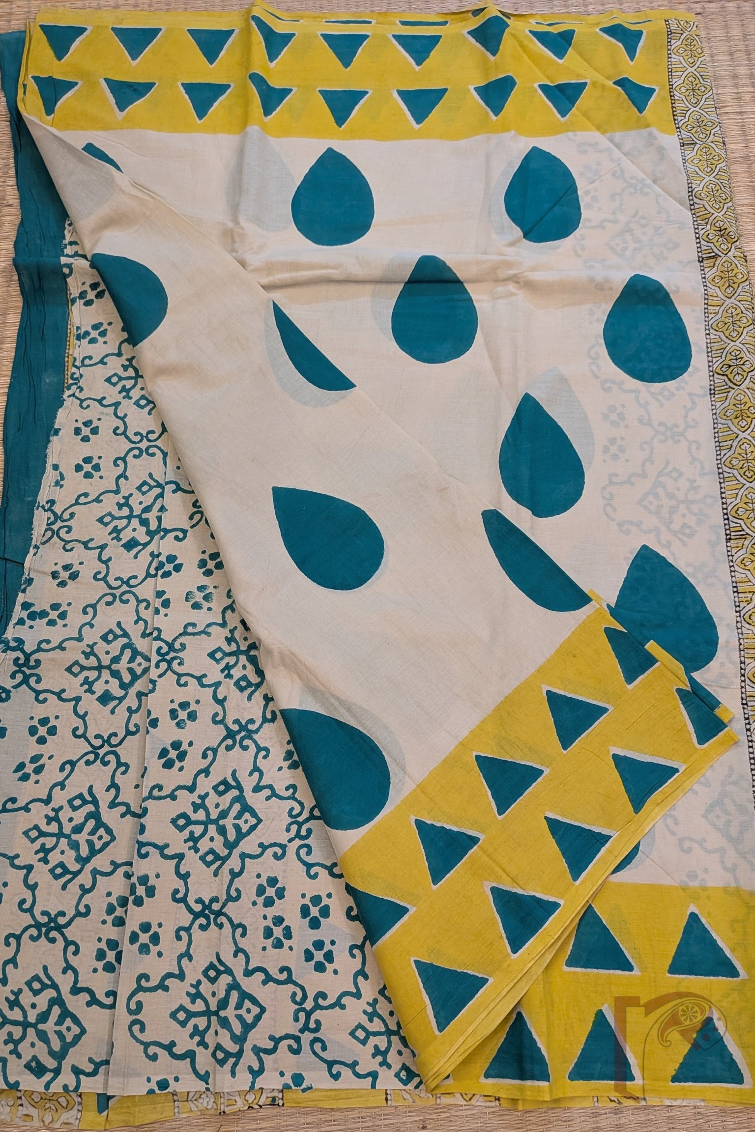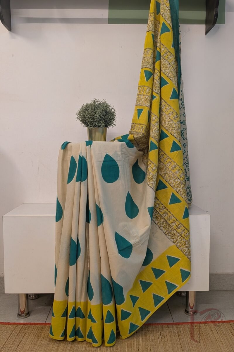 Mulmul Muse – Cream Mulmul Cotton Saree with Teal Vanaspati Teardrop Print and Bright Yellow Geometric Border