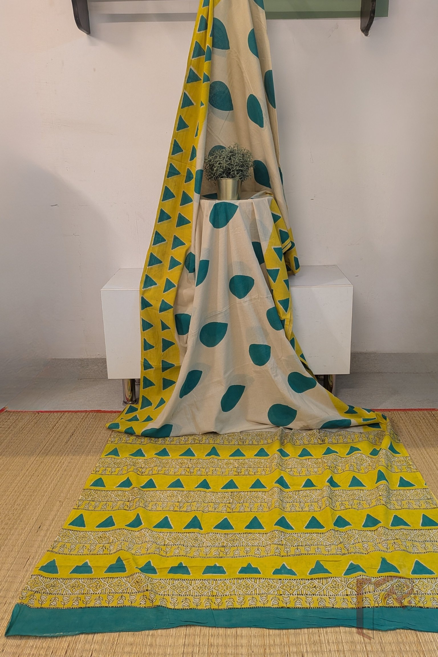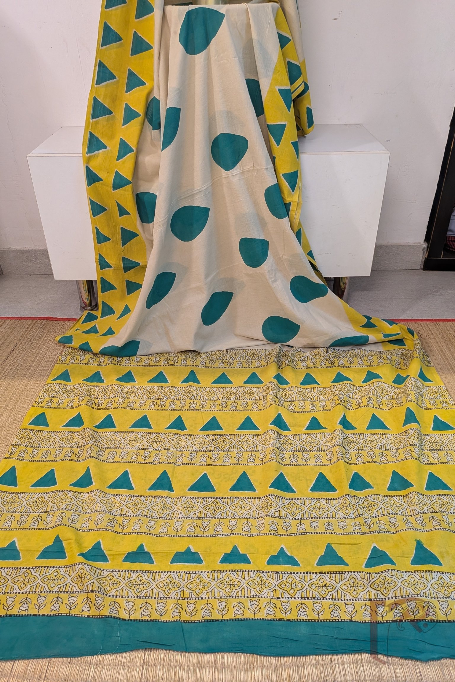 Elegant with a lively handcrafted twist, this cream mulmul cotton saree showcases a refined vanaspati hand block print that feels both rooted and contemporary. The saree body is adorned with teardrop-shaped motifs printed in soothing teal green, arranged thoughtfully to maintain a light and breathable visual flow. Adding a striking contrast is the 6.5-inch bright yellow border, detailed with two rows of teal green triangle patterns, creating a bold yet balanced frame. The pallu continues in bright yellow, beautifully printed with fine black-outlined floral and stem motifs, rhythmically alternated with sea green triangular accents for added depth. Crafted in exceptionally soft mulmul cotton, this saree drapes effortlessly and remains comfortable through long hours. It is paired with a cream blouse printed all over in sea green, completing the ensemble with understated harmony and artisanal elegance.