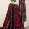 A beautiful green mulmul cotton saree with white floral and creeper batik prints and a contrasting black pallu featuring bold green and white hand motifs. The half & half layout adds a contemporary edge while keeping its roots in tradition. The soft mulmul texture makes it ideal for day-long wear with comfort and grace. The green blouse with black border finishes the look.