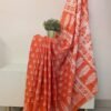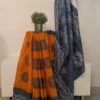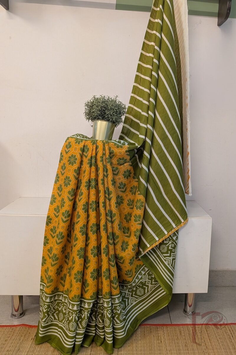 Vibrant yet thoughtfully balanced, this mango yellow and leaf green mul cotton saree is a refreshing play of colour, geometry, and florals. The golden yellow body is intricately printed with green floral motifs outlined in delicate white dots, arranged within a dotted grid of diamonds and circles that adds texture and rhythm without overwhelming the softness of the fabric. Framing the saree are 6-inch leaf green borders on both sides, detailed with white square-style floral motifs that lend a handcrafted finish. The pallu continues in leaf green, accented with soft cream stripes for a calm visual transition. Crafted in lightweight, breathable mul cotton, this saree ensures effortless drape and all-day comfort. Completing the look is a golden yellow blouse featuring a white lahariya-style print, bringing together tradition and vibrancy in perfect harmony.