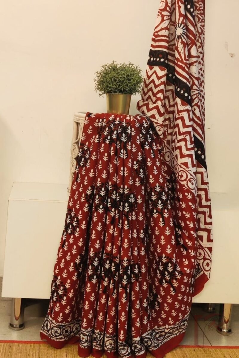 This maroon Mulmul cotton saree is rich with warmth and tradition. The body blooms with black and white block-printed floral motifs, while the pallu expands the pattern with bolder detailing. The black blouse with white flower and leaf print adds cohesion and depth. Ideal for semi-formal settings, this saree brings together Rajasthani craft and sophisticated palette.