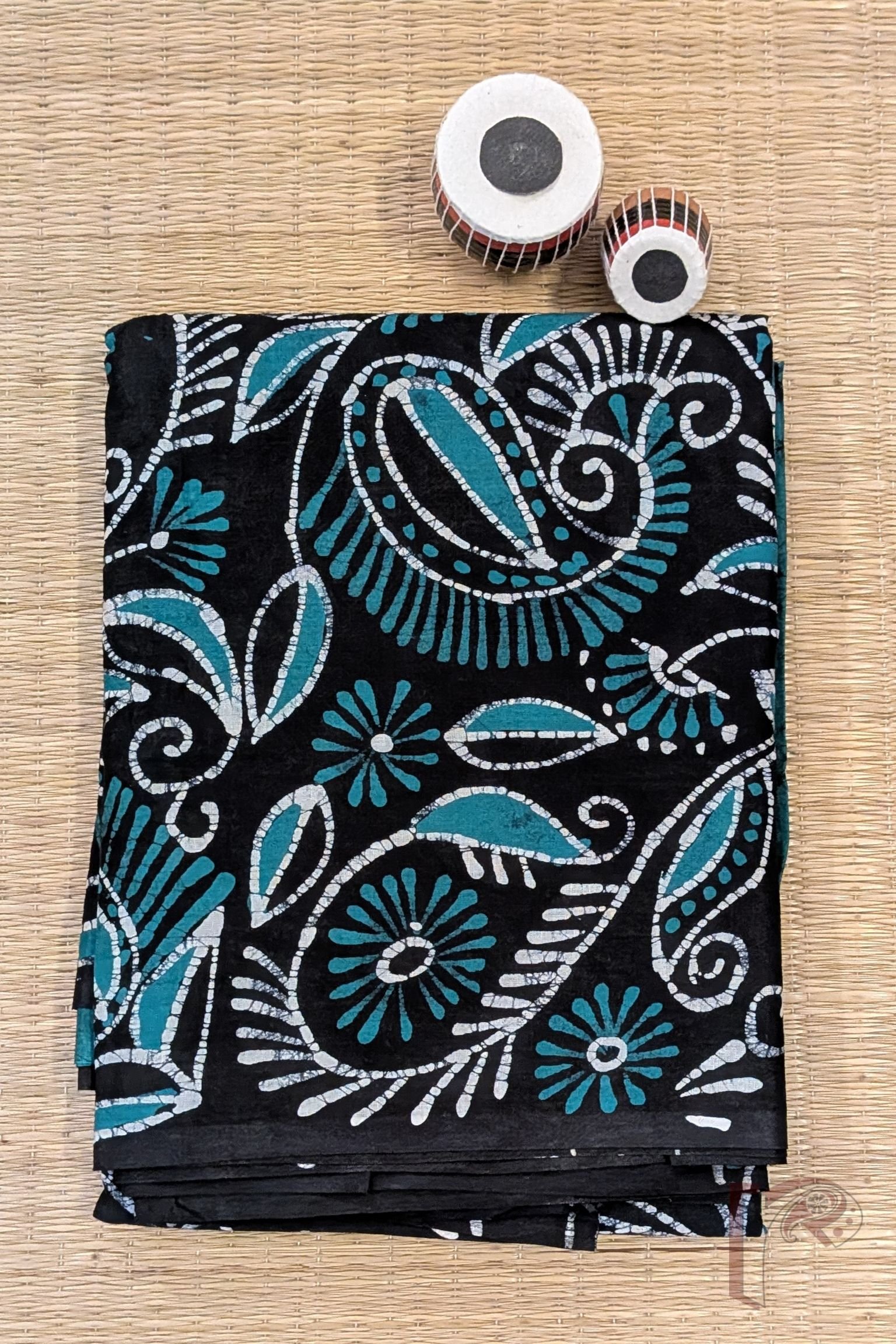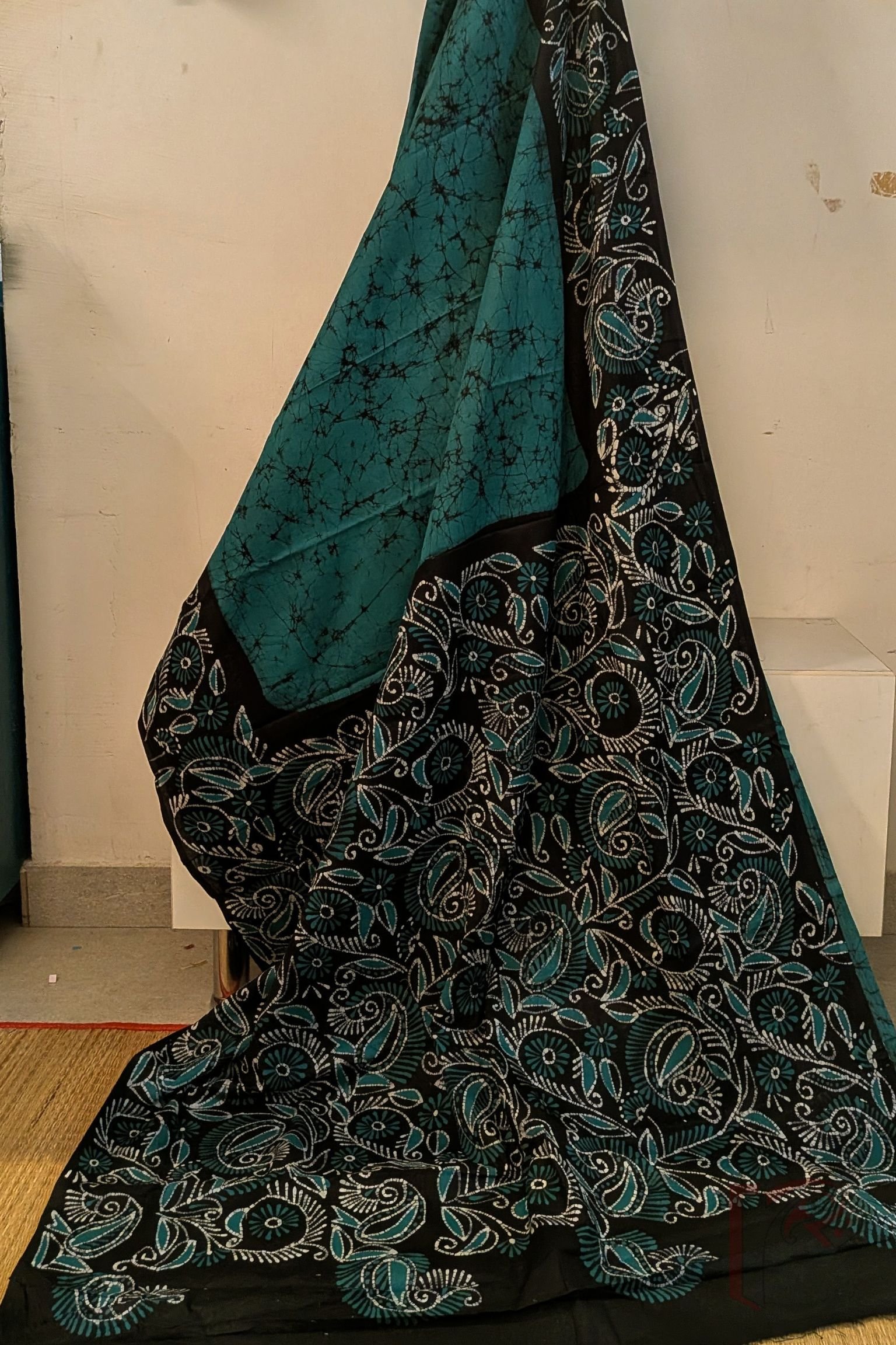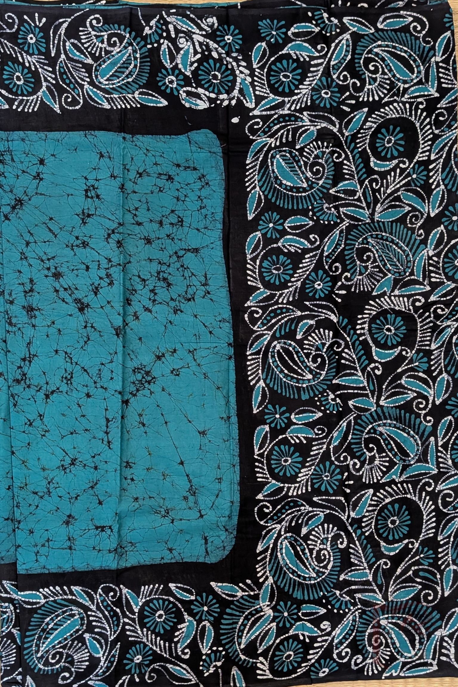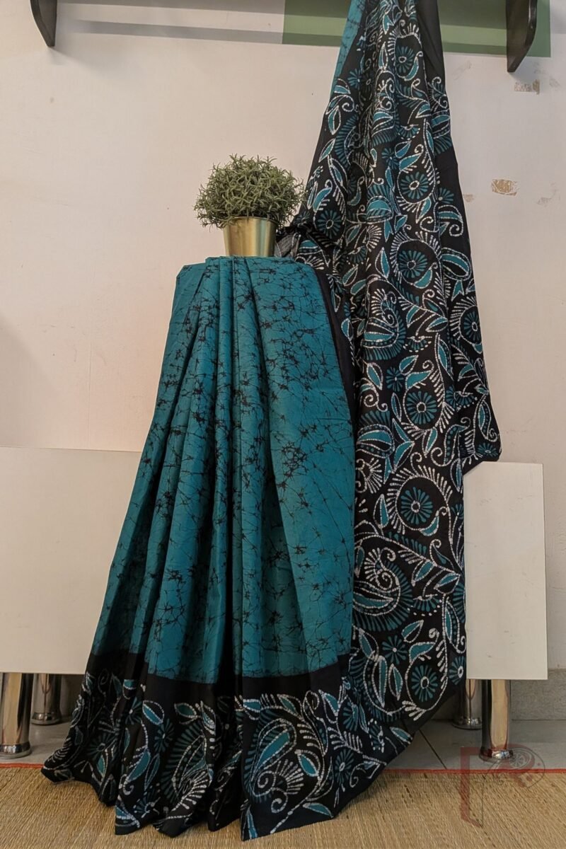 Mulmul Muse – Teal Blue and Black Hand Batik Mulmul Saree with Creeper and Cary Print