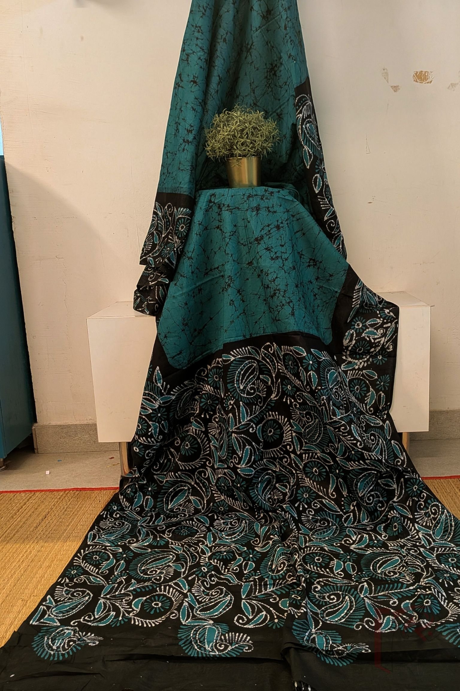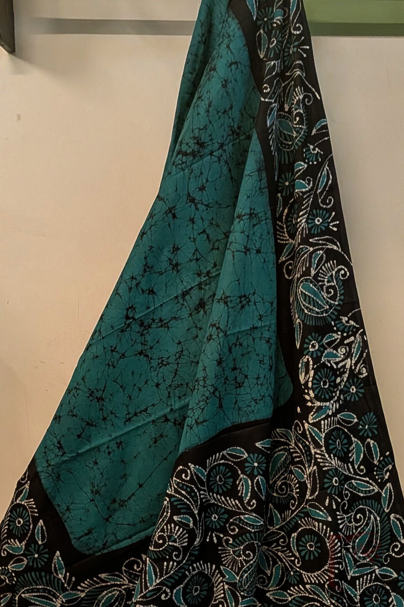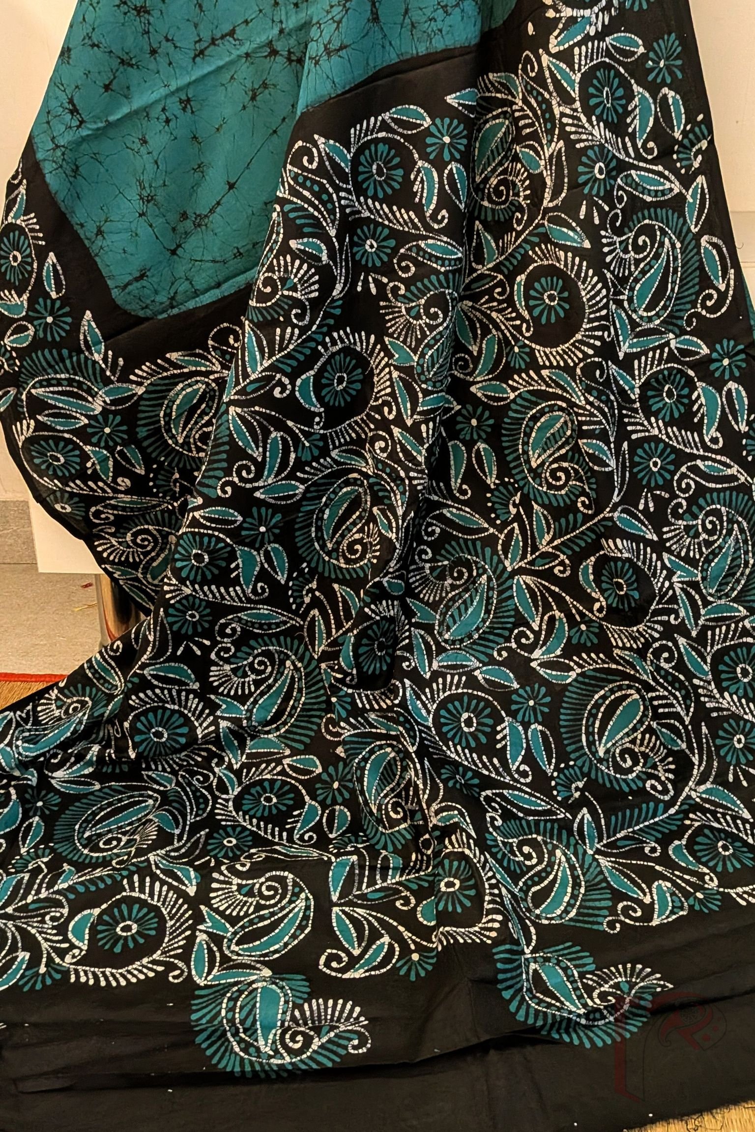 Mulmul Muse – Teal Blue and Black Hand Batik Mulmul Saree with Creeper and Cary Print