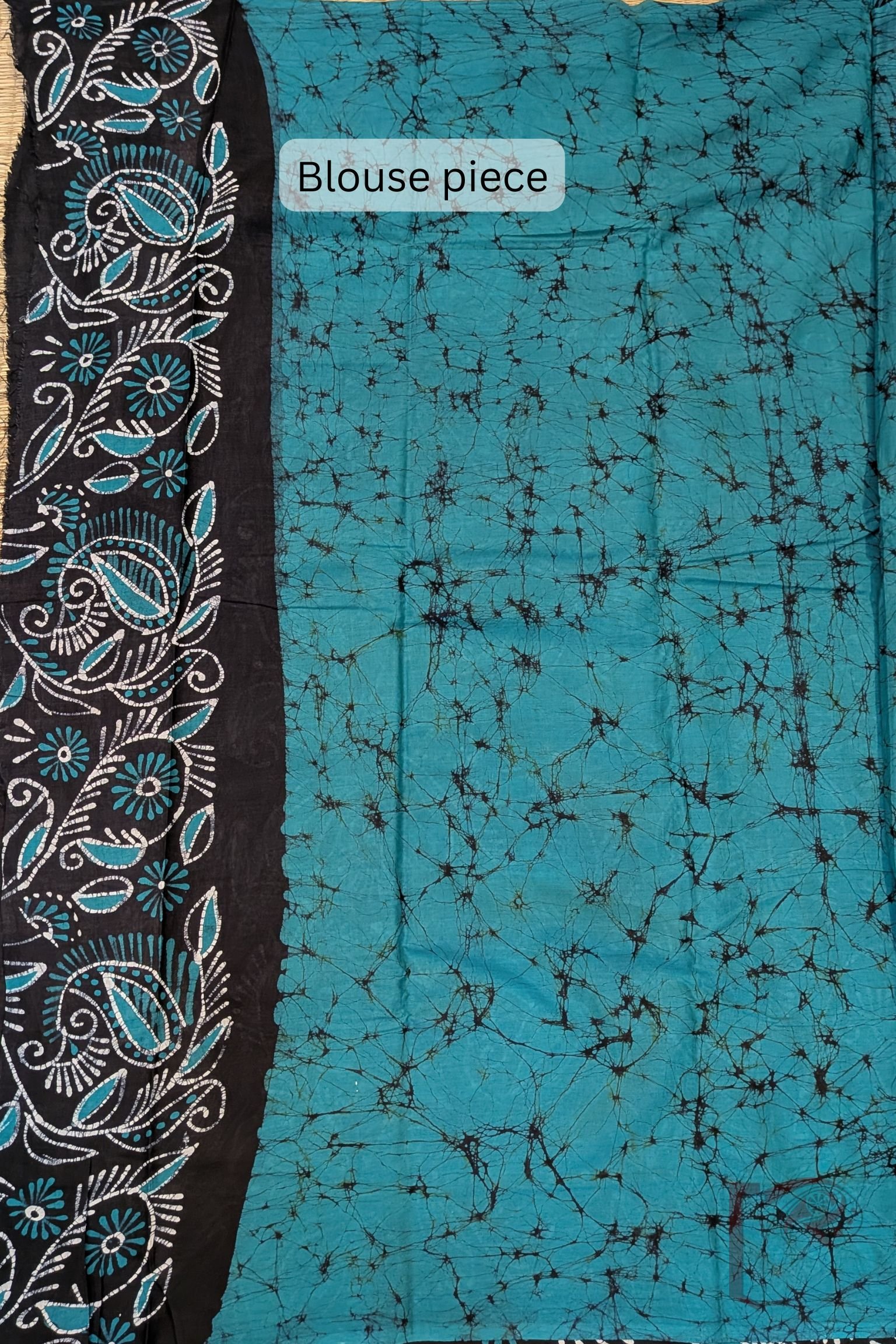 This teal blue mulmul saree with a contrasting black border and pallu displays exquisite batik creeper and cary motifs in teal and white. The black pallu with teal hand prints enhances its artisanal appeal. Soft, breathable, and elegant, this saree is ideal for those who love cool tones and handcrafted textures. The matching teal blouse adds to its serene sophistication.