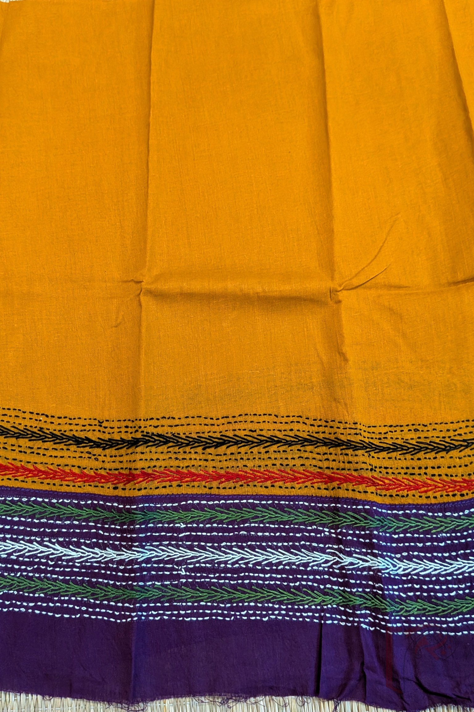 Warm and striking, this mustard orange cotton unstitched blouse piece is paired with a contrasting purple cotton attached border for a bold finish. Enhanced with multicolour hand embroidery, it brings together festive colour and artisanal detail. Lightweight cotton and expressive hues make it ideal for pairing with earthy handloom sarees. A perfect blend of traditional vibrance and modern styling.