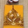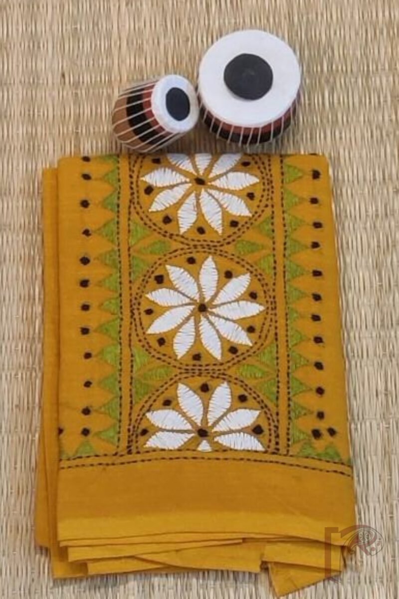 Mustard Yellow Cotton Blouse with Green, White, and Black Long Border Kantha Embroidery – Unstitched Fabric