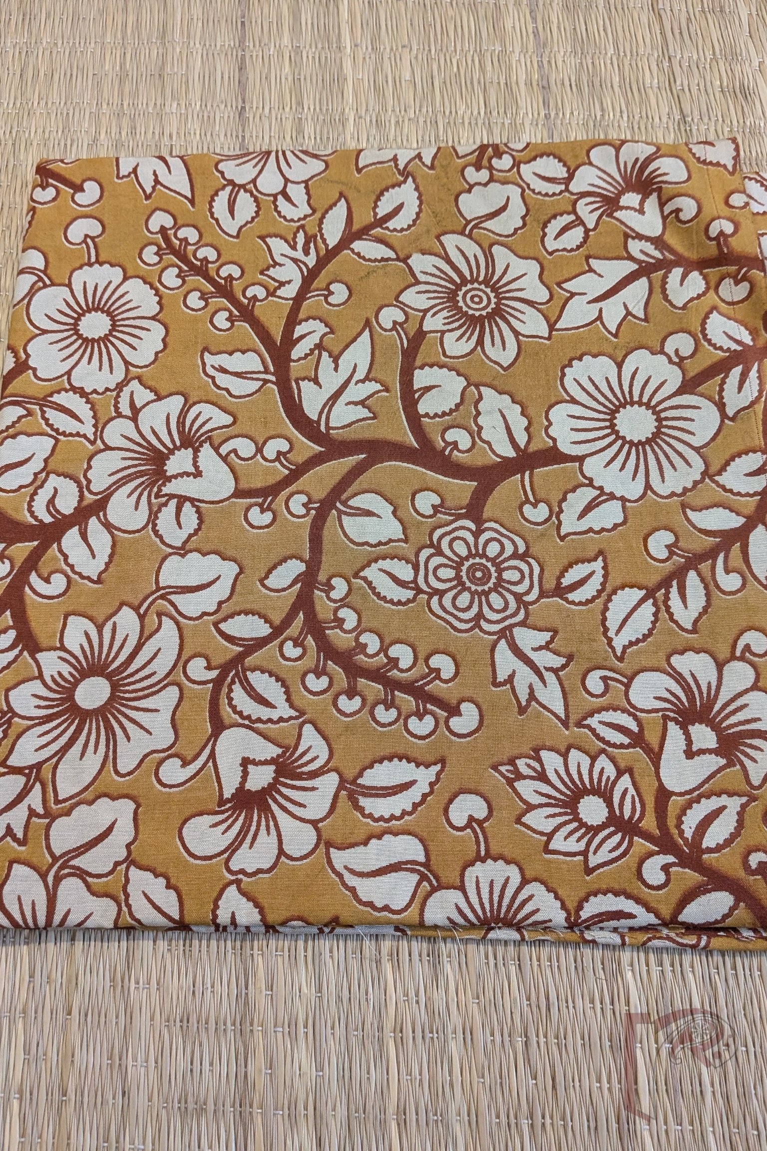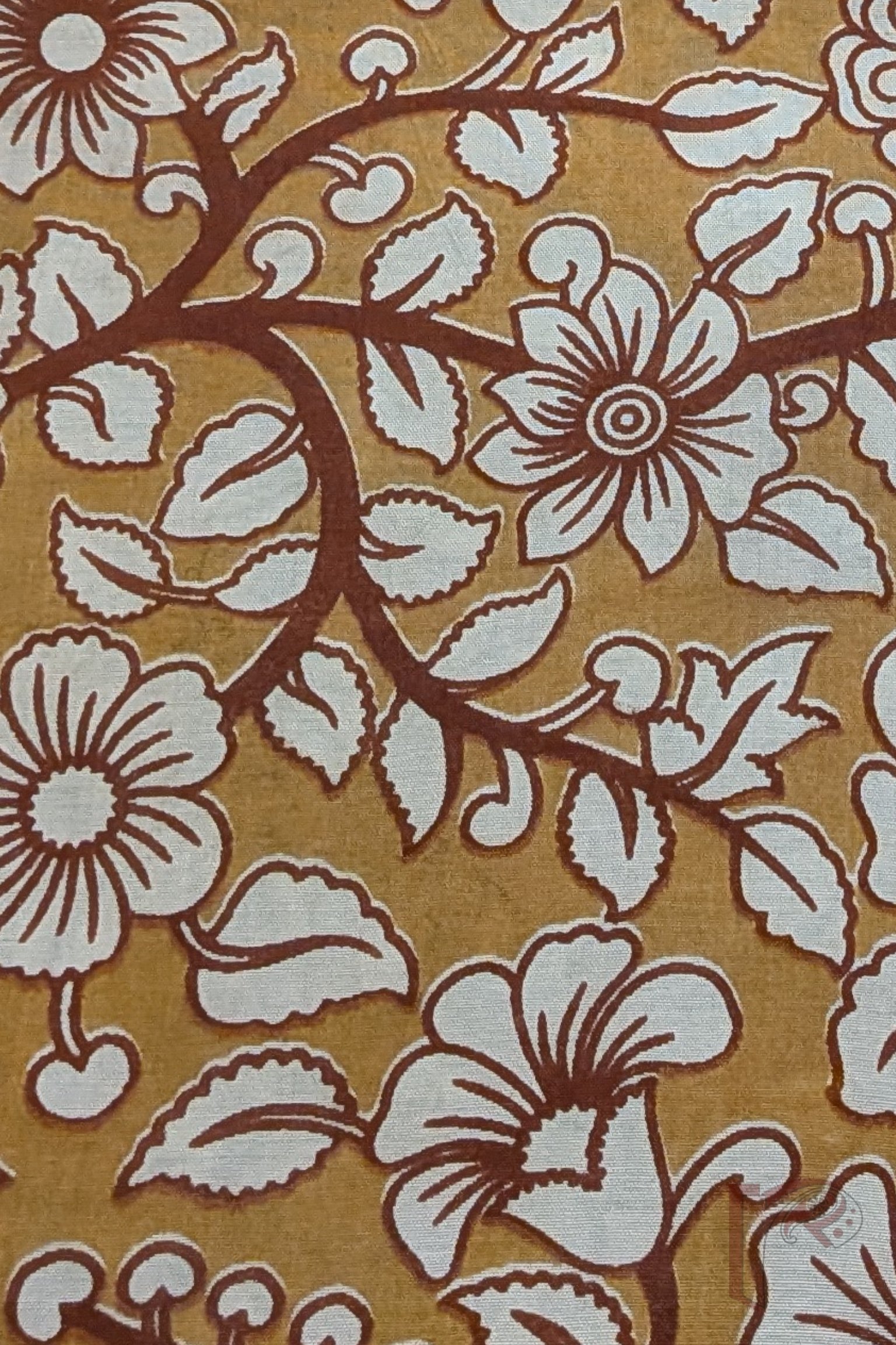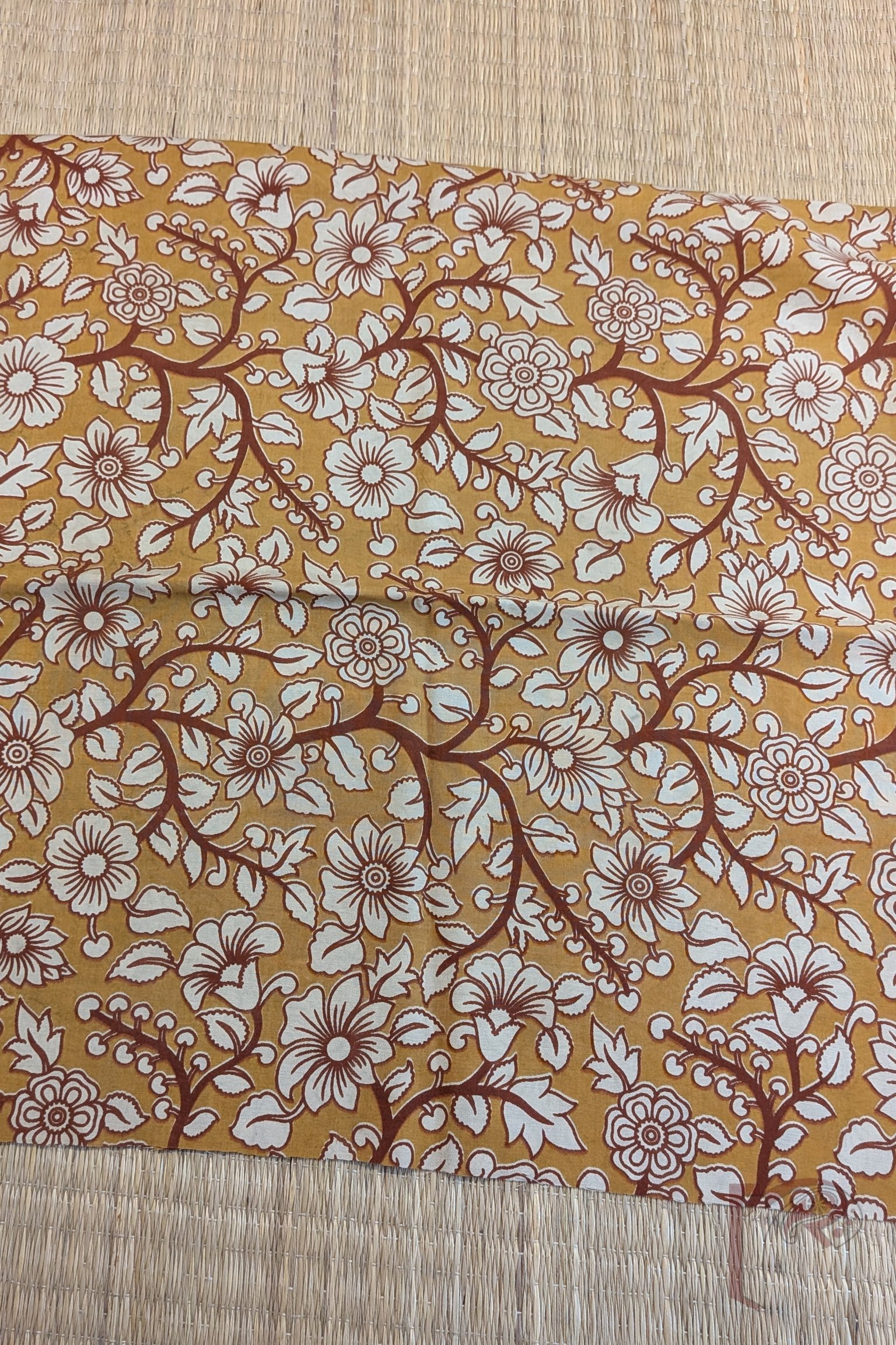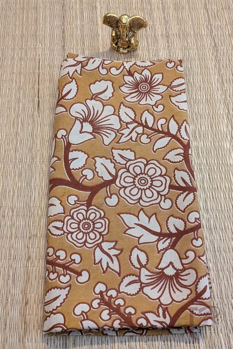 This mustard yellow Dupion silk blouse piece features a charming flower and leaf vine pattern, with motifs in cream outlined in brown and fully brown stems. The earthy palette enhances the folk-art appeal of Kalamkari, while the silk base adds structure and sheen. A warm, heritage-inspired design perfect for festive sarees.