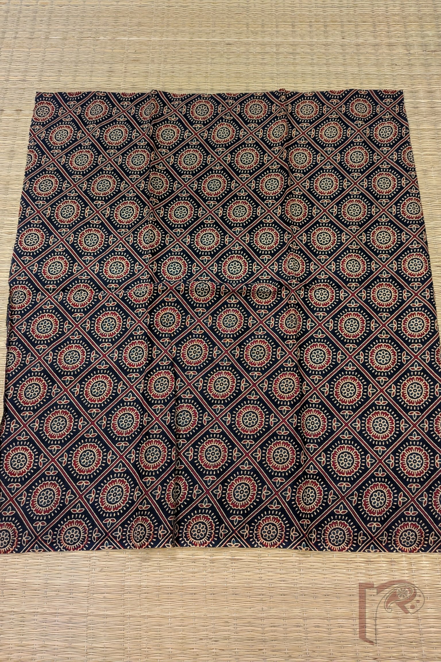 Navy Blue Cotton Bandhej Blouse Piece with Red Diamond Grid and Ajrakh Inspired Motifs in Red & Cream