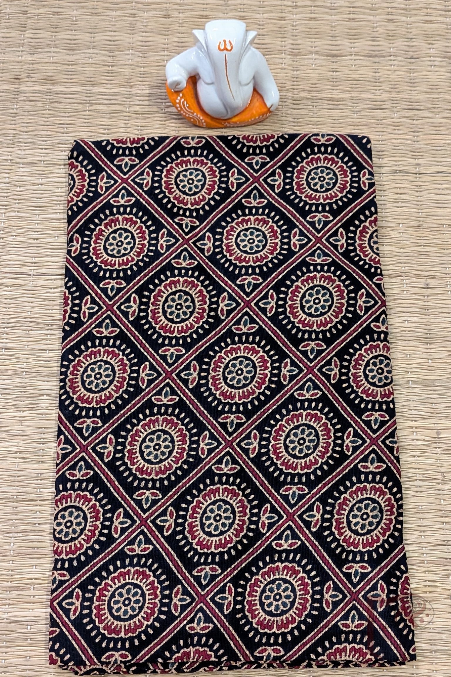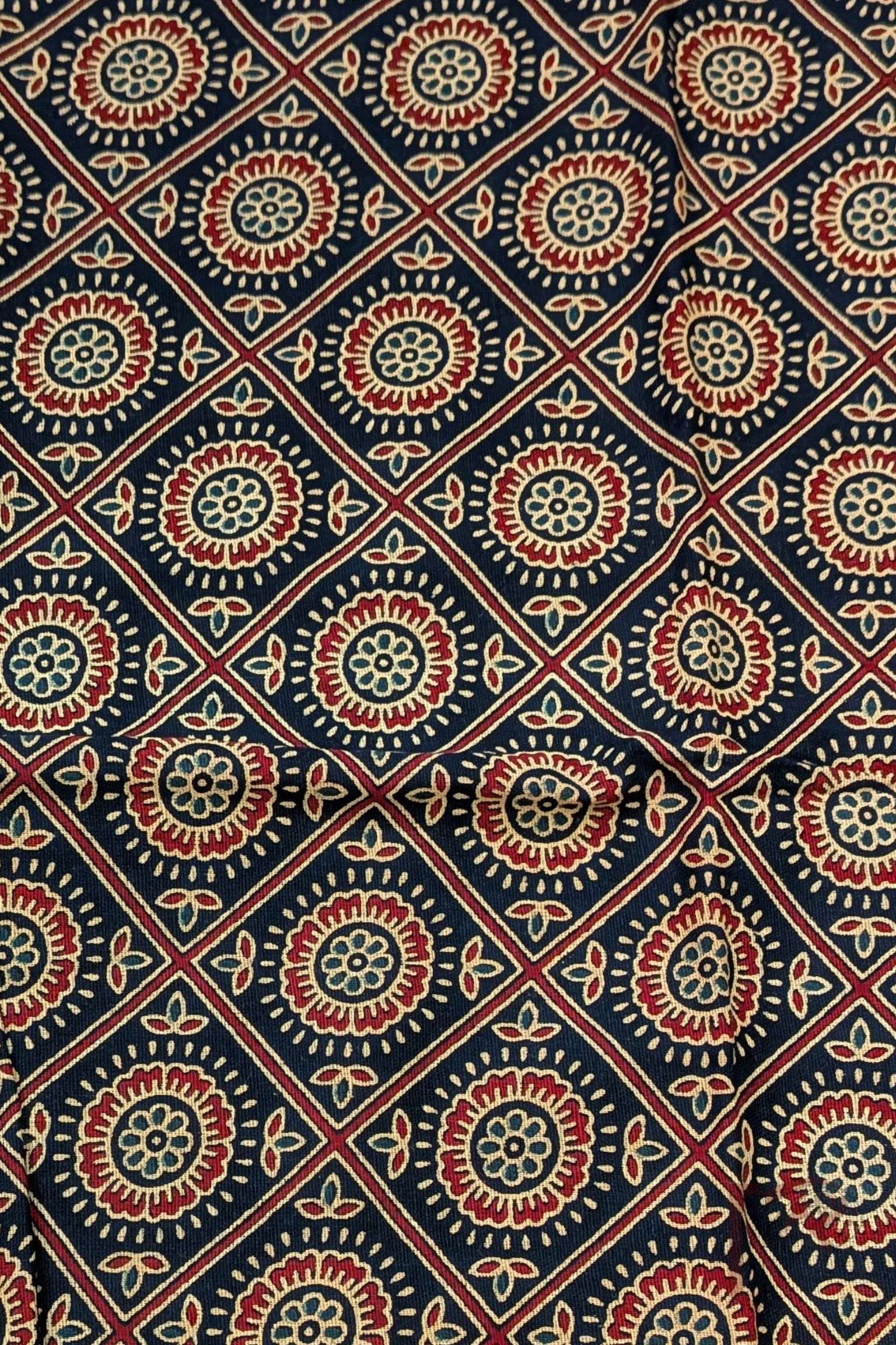 A striking navy blue blouse piece featuring red diamond grid lines with traditional Ajrakh-inspired motifs filling the spaces between in red and cream. The geometric precision combined with heritage detailing creates a bold ethnic statement. Crafted in premium breathable cotton, it offers comfort with rich traditional aesthetics.