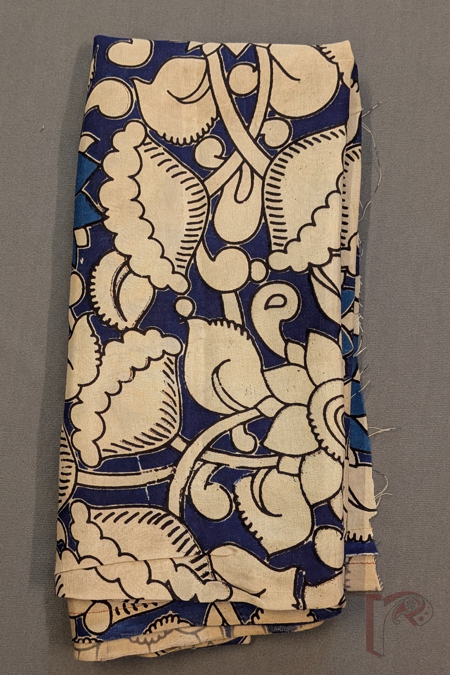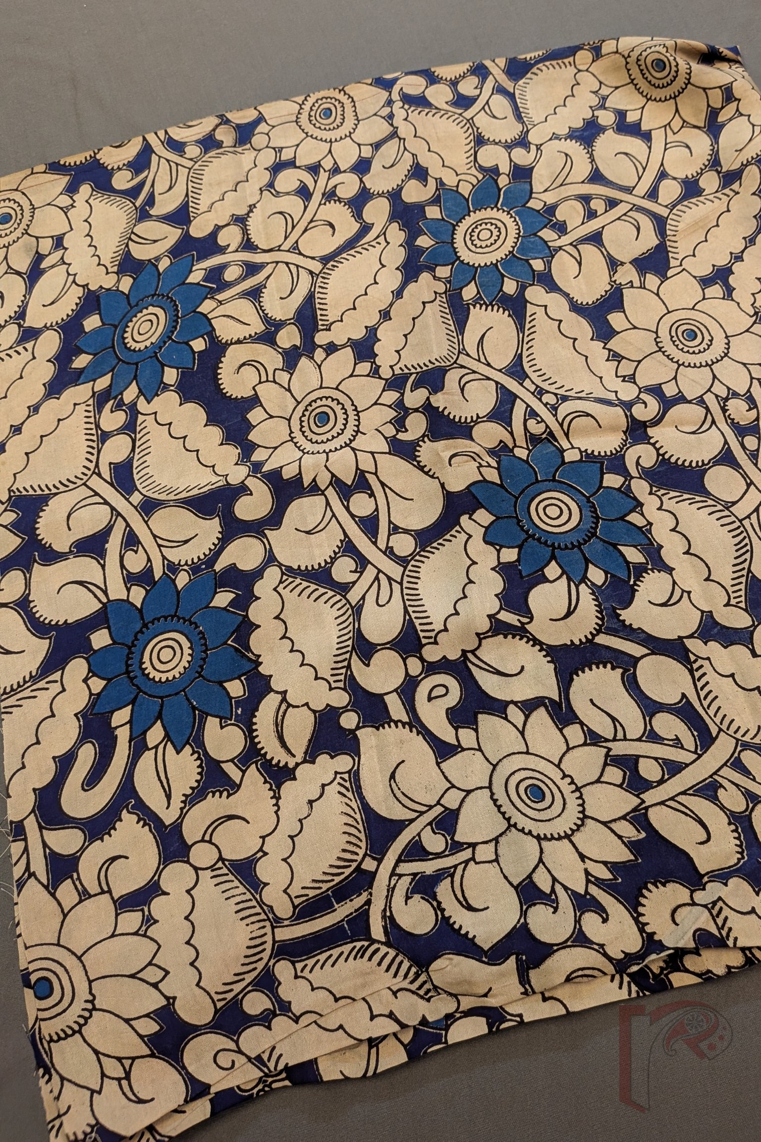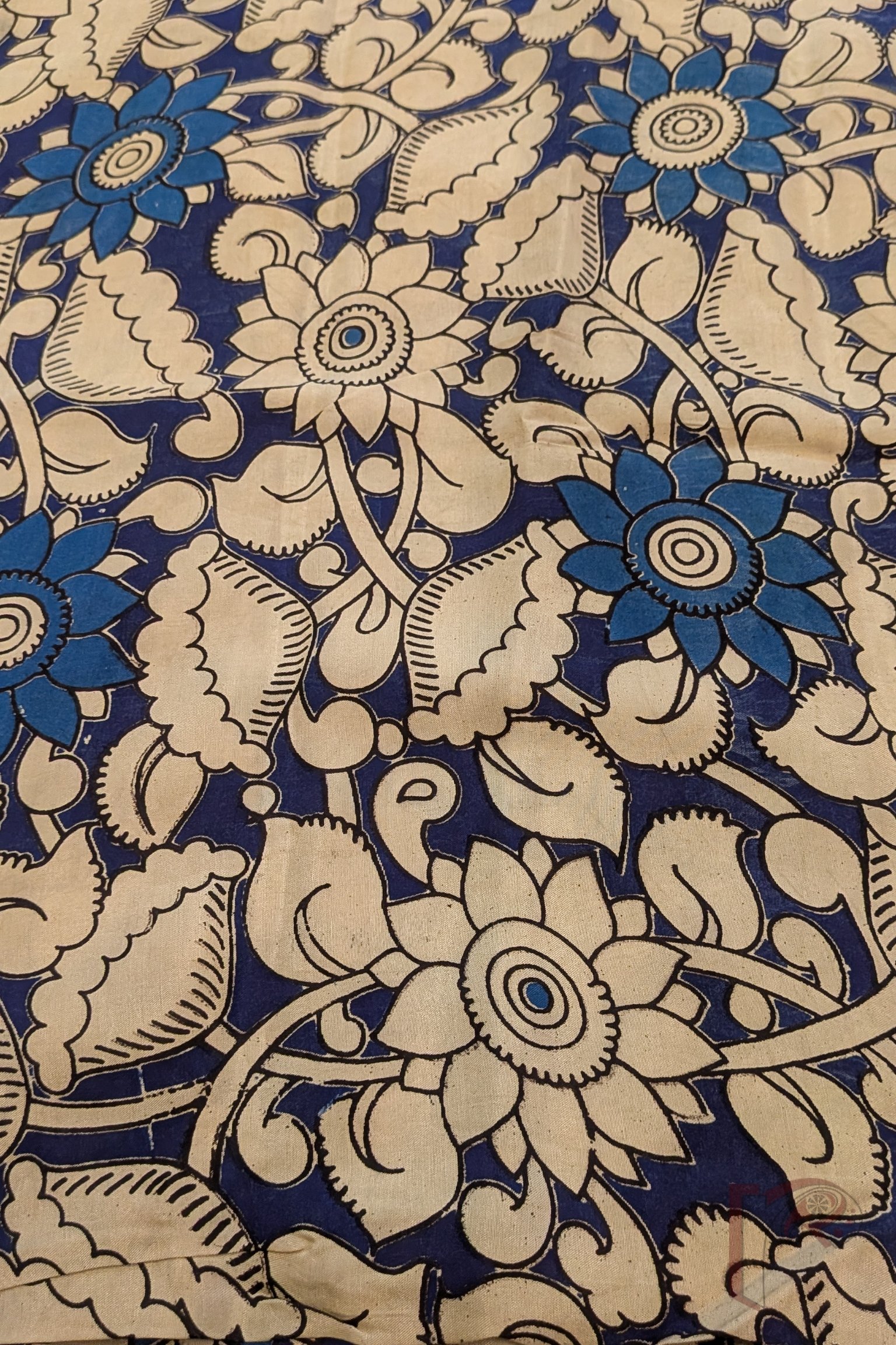 Navy Blue Cotton Silk Kalamkari Blouse with Big Floral and Leaf Motifs in Cream and Cobalt Blue