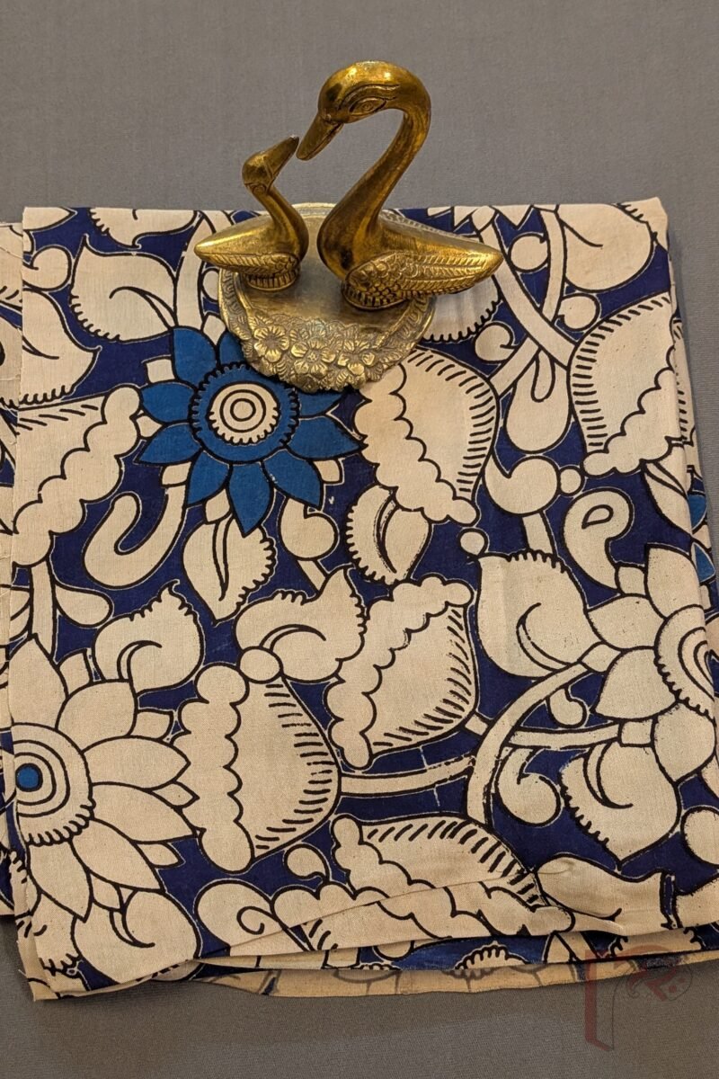 A striking navy blue soft cotton silk blouse piece adorned with large Kalamkari floral and leaf motifs, filled in cream and cobalt blue for added depth and dimension. The bold motifs contrast beautifully against the rich navy base, highlighting the intricate artistry of traditional Kalamkari printing. Crafted from soft cotton silk, this blouse combines comfort, subtle sheen, and a graceful drape, making it perfect for pairing with both solid and patterned sarees. An elegant statement piece that merges heritage craftsmanship with contemporary styling.
