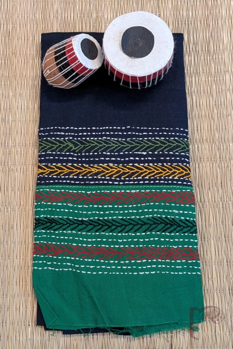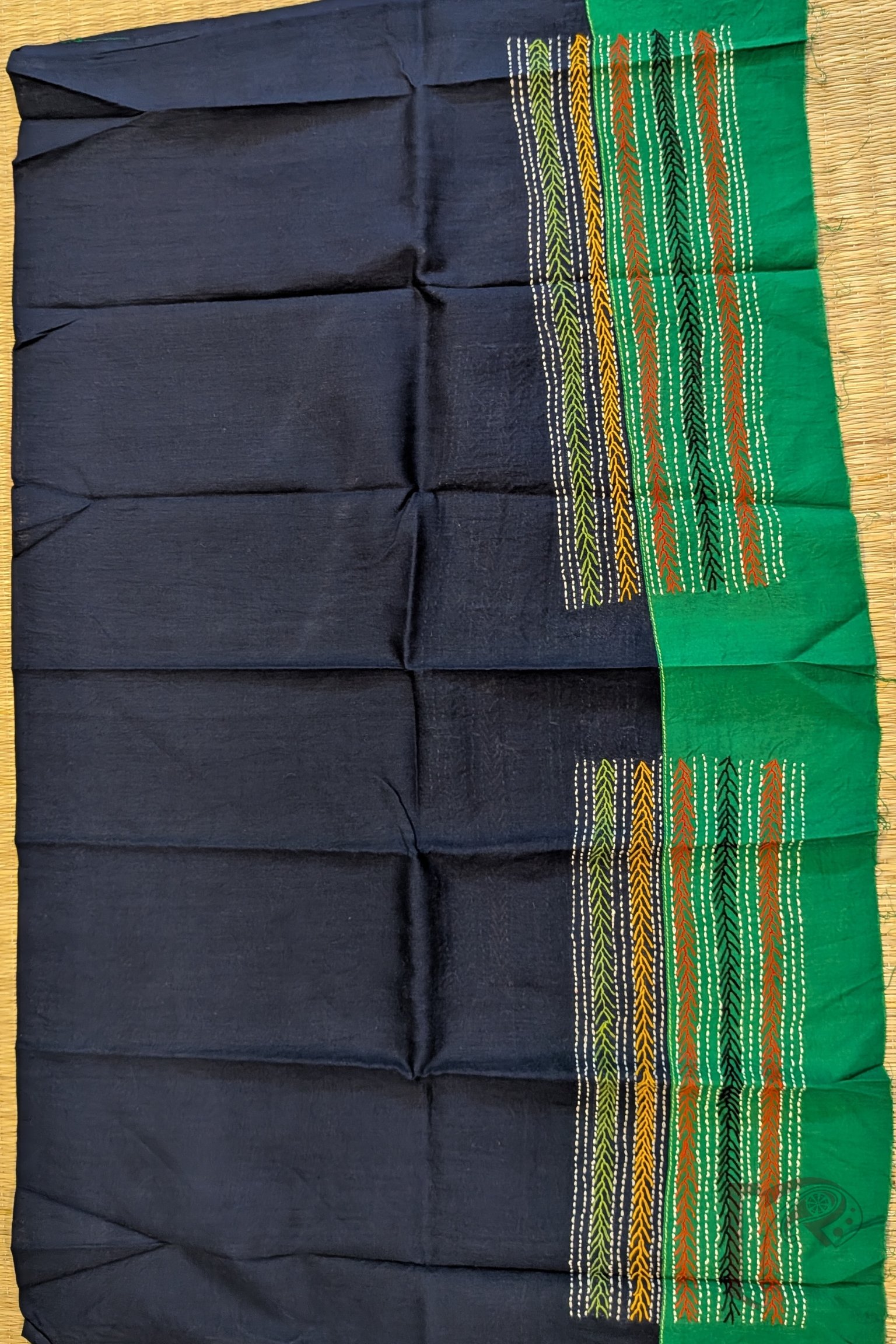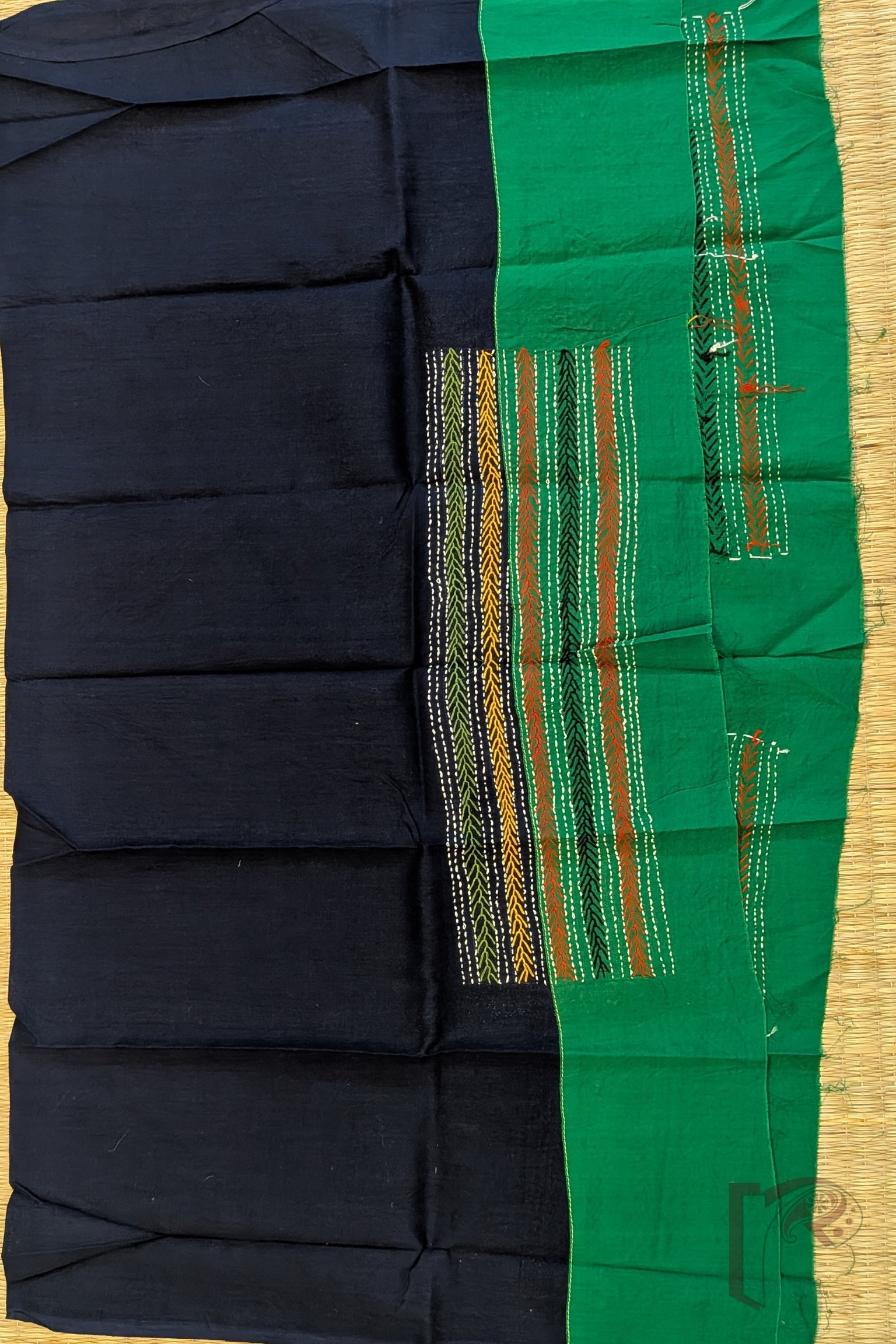 A deep navy blue cotton unstitched blouse piece highlighted with a refreshing green cotton attached border, this design brings balance and contrast together. The multicolour hand embroidery adds character and handcrafted appeal to the fabric. Breathable, soft cotton ensures comfort while making it a versatile match for both bright and muted sarees. A blouse that speaks of quiet elegance with vibrant accents.