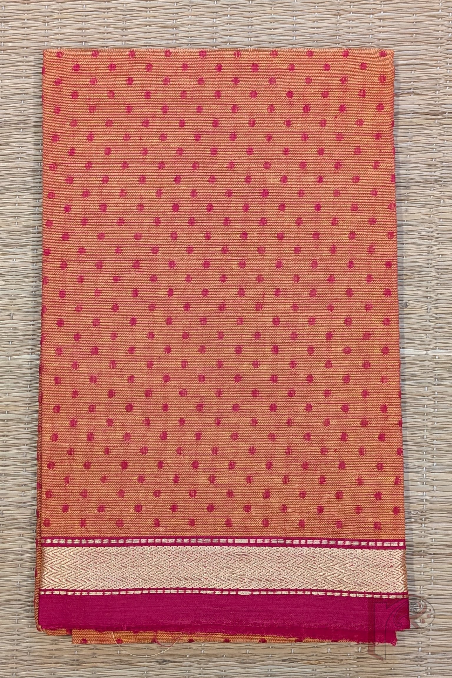 Bold and cheerful, this orange south cotton blouse piece is decorated with hot pink booties that create a striking contrast. The luminous gold thread border and pink selvage enhance its celebratory charm. Soft yet structured, this handloom cotton fabric offers breathable comfort with vibrant character. Ideal for pairing with bright silk sarees, it makes a confident festive statement.