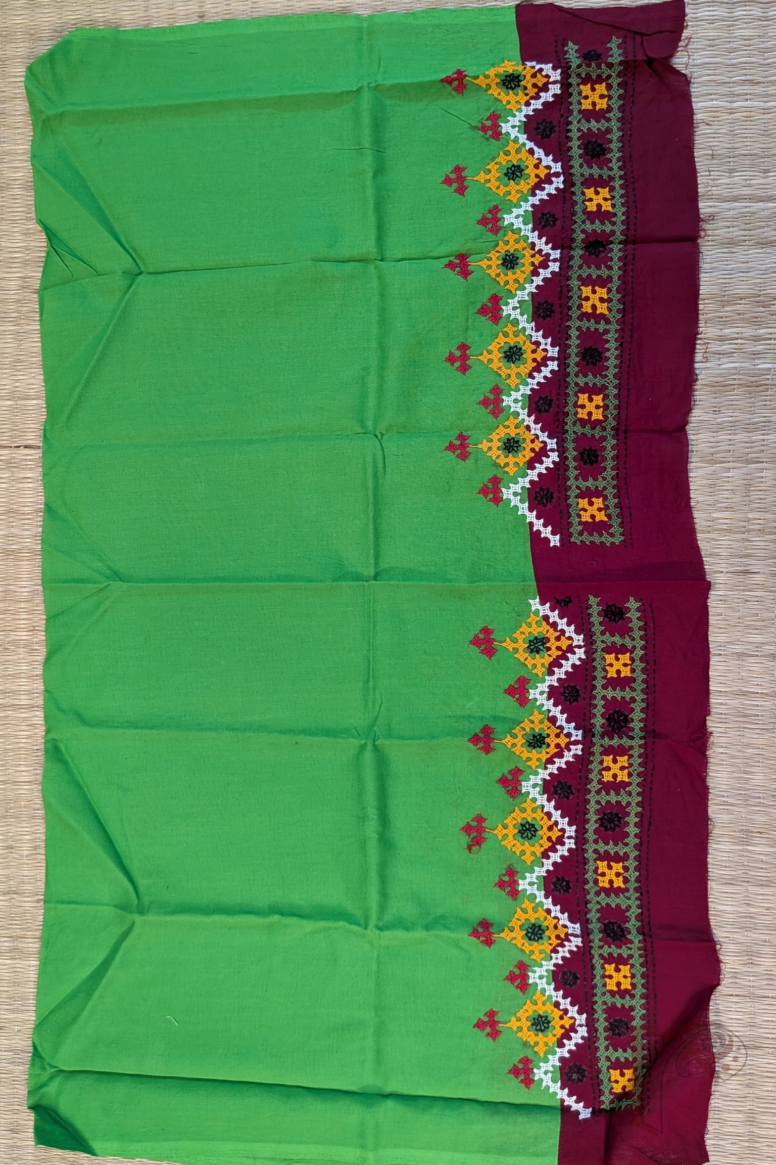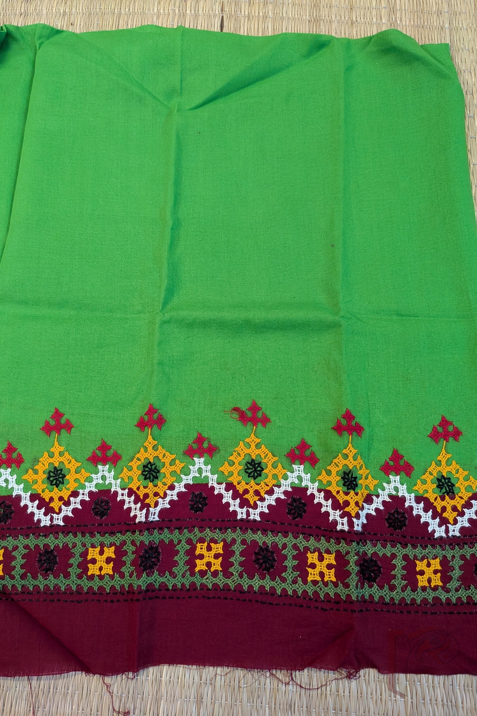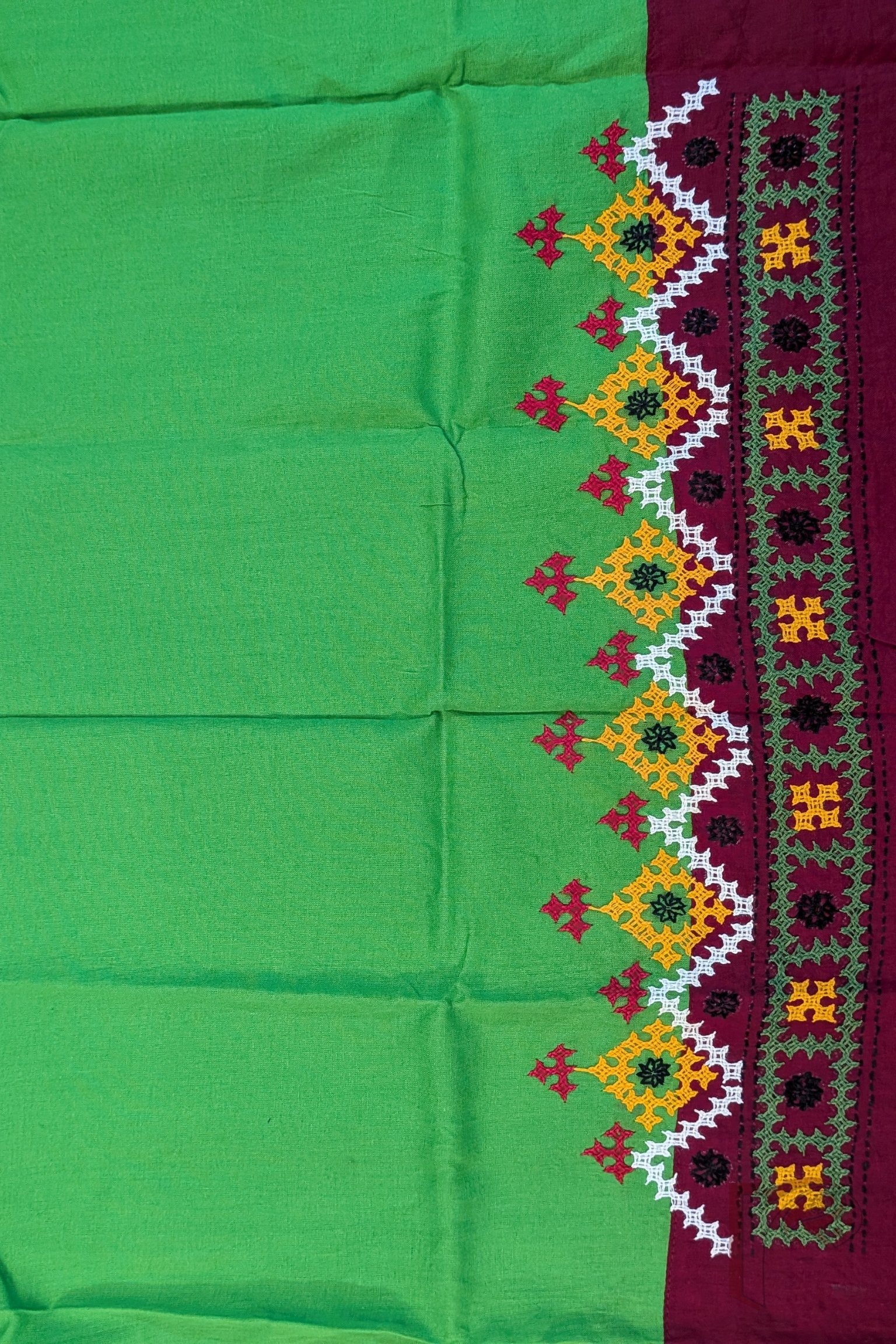 Parrot Green Cotton Blouse with Maroon Border and Multicolour Diamond–Square Kutch Embroidery