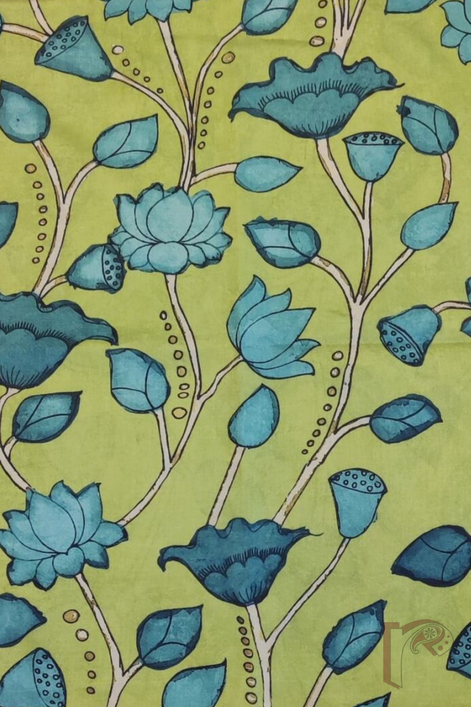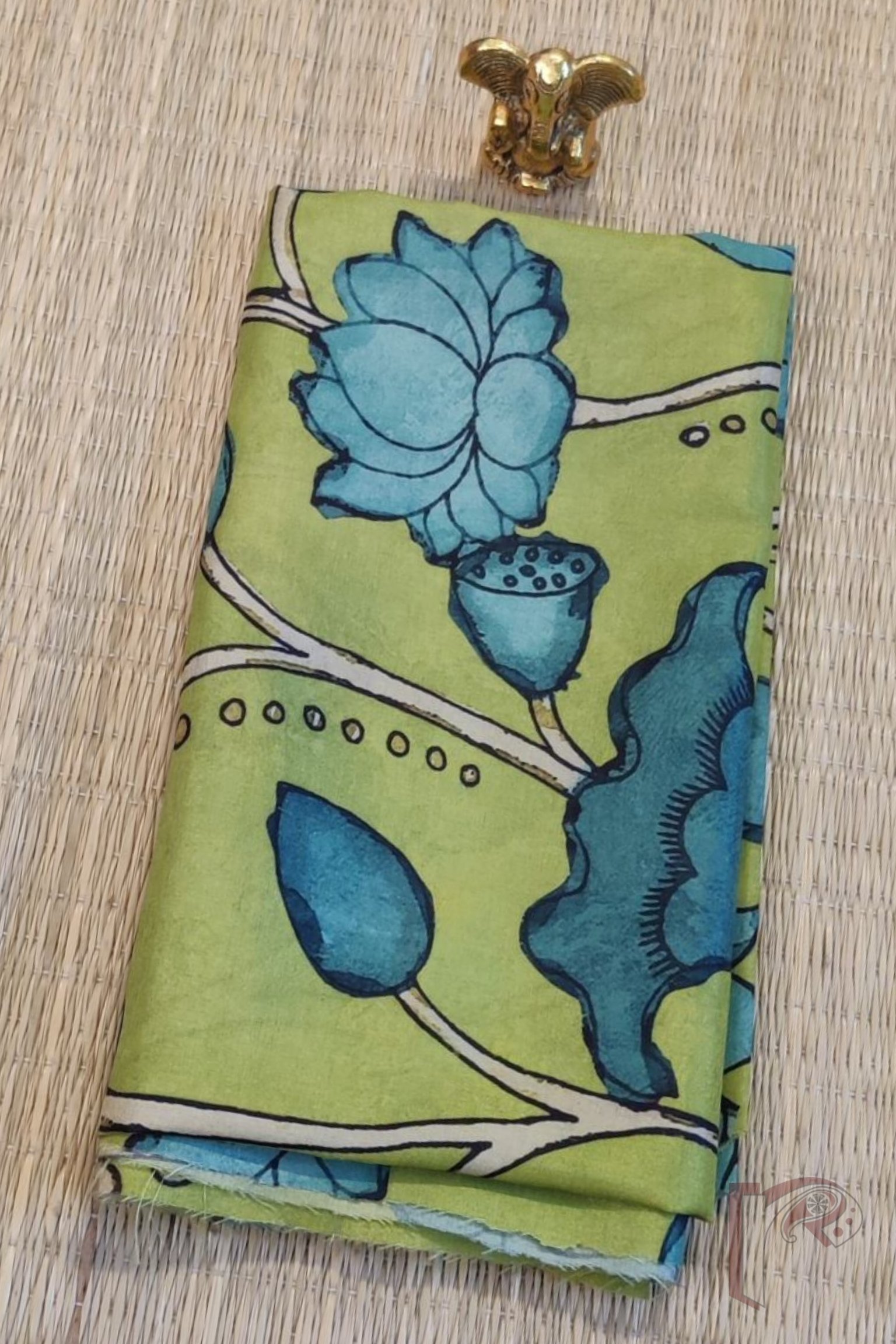 Parrot Green Dupion Silk Blouse with Emerald Lotus Buds and Cream Stems