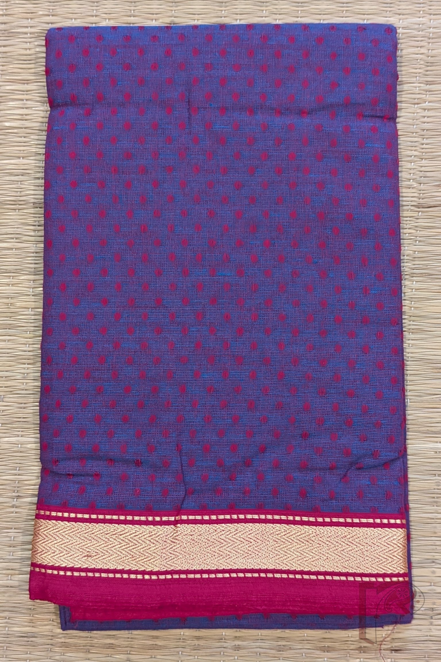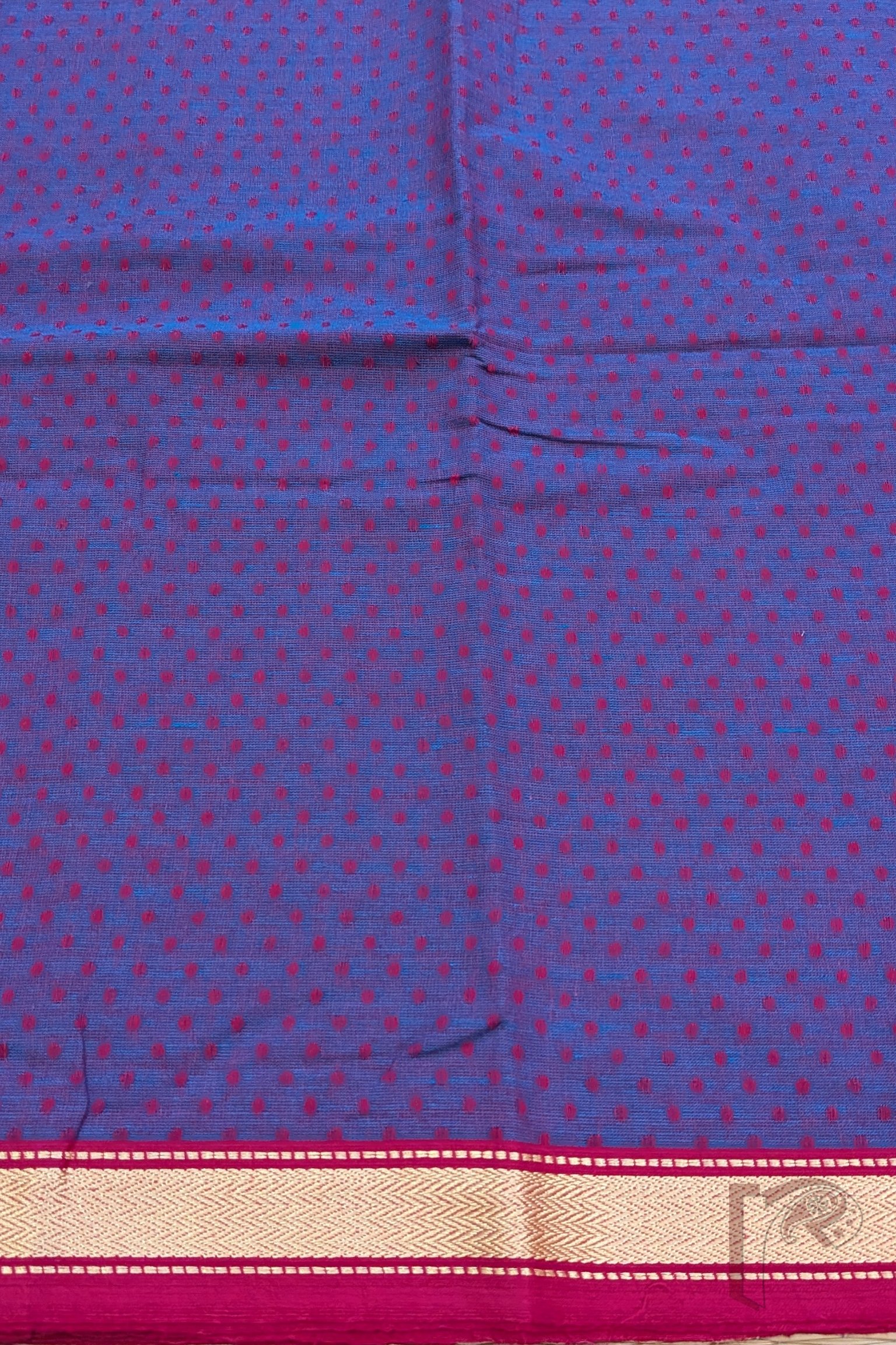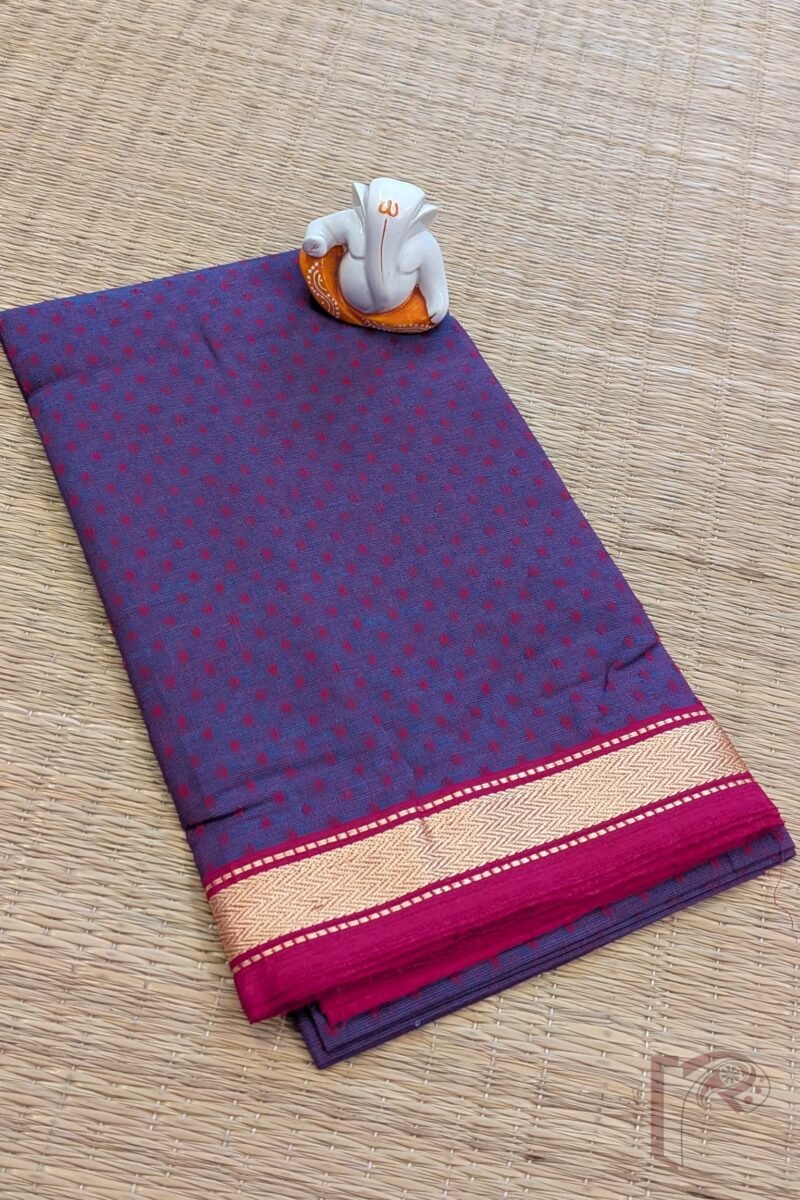 A rich purple south cotton blouse piece featuring delicate hot pink booties that add a playful contrast to the royal base. Finished with a classic gold thread woven border and a matching pink selvage, this piece beautifully blends boldness with grace. The breathable cotton weave ensures comfort while the jewel-toned pairing enhances festive appeal. Perfect for wedding sarees or celebratory drapes, this blouse material radiates vibrancy and elegance.