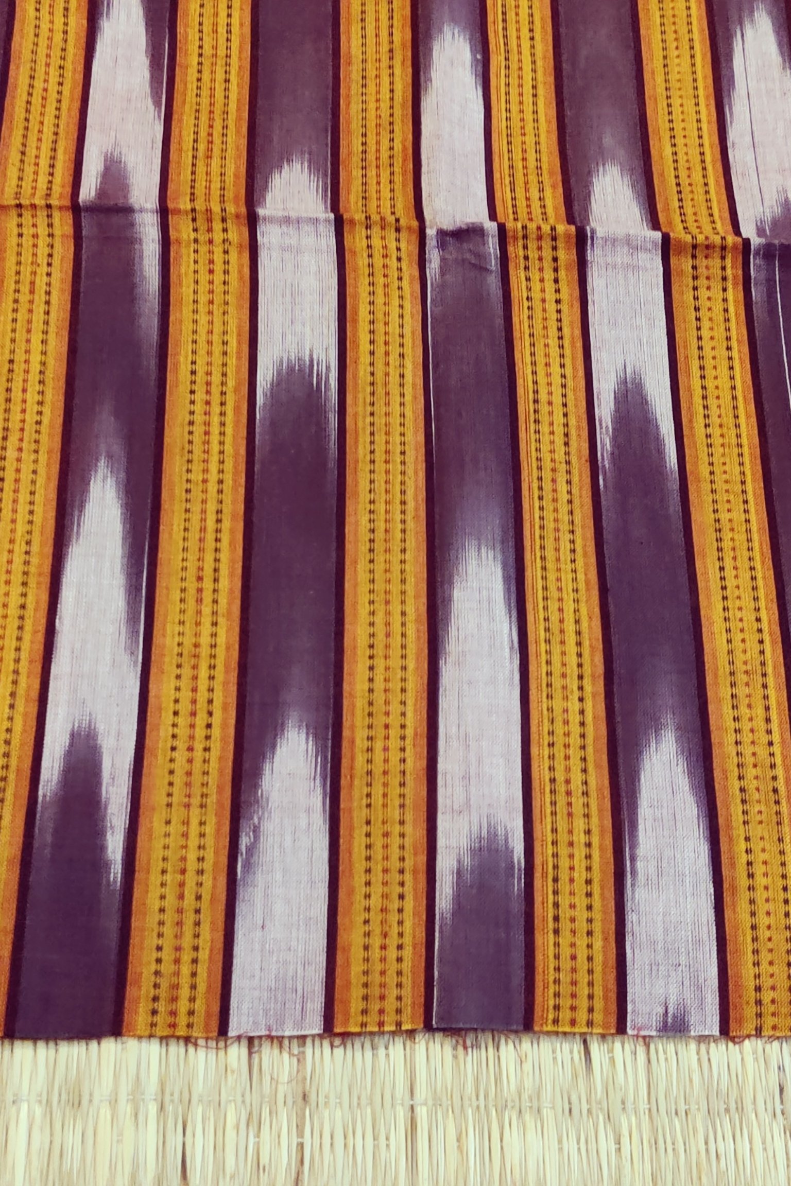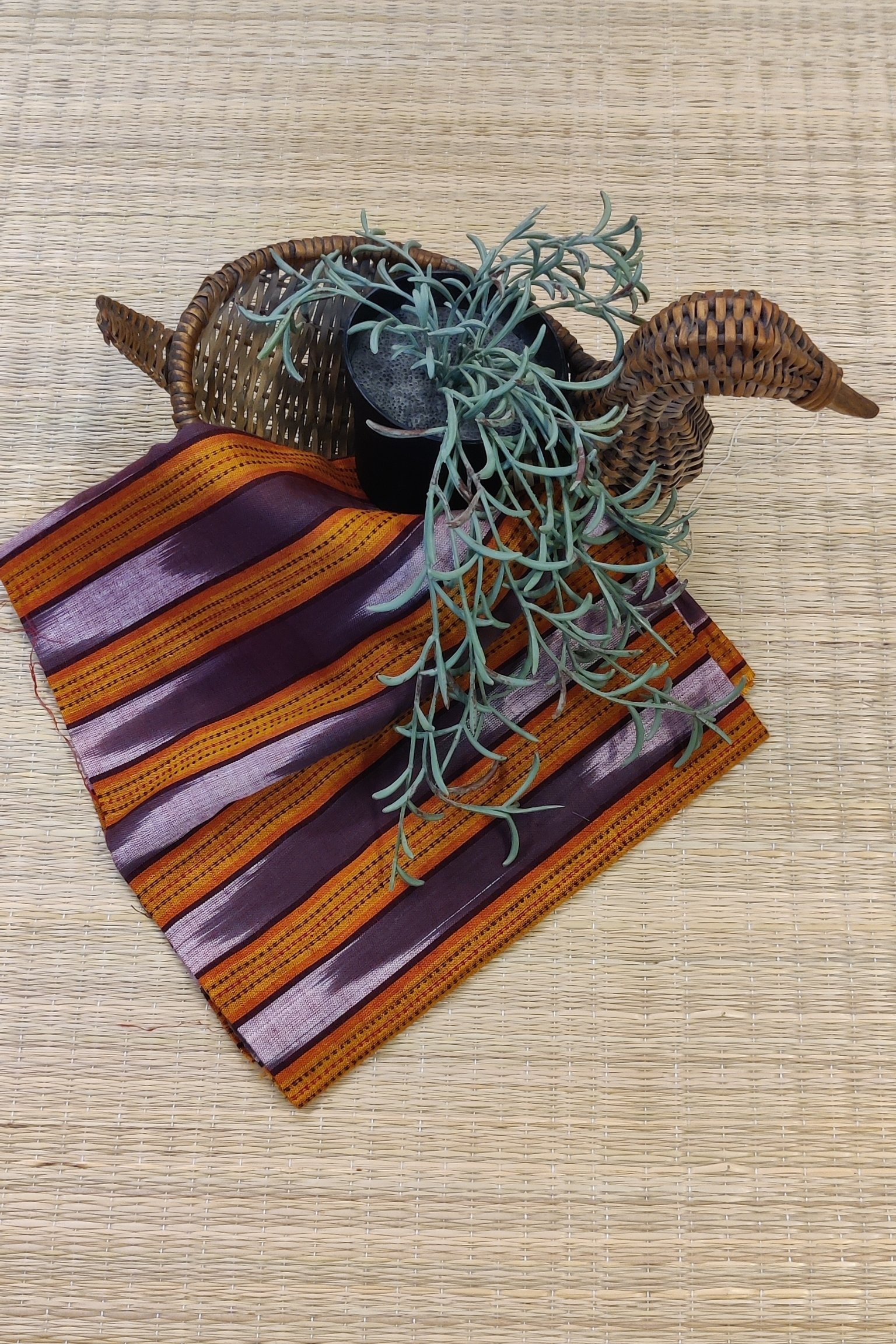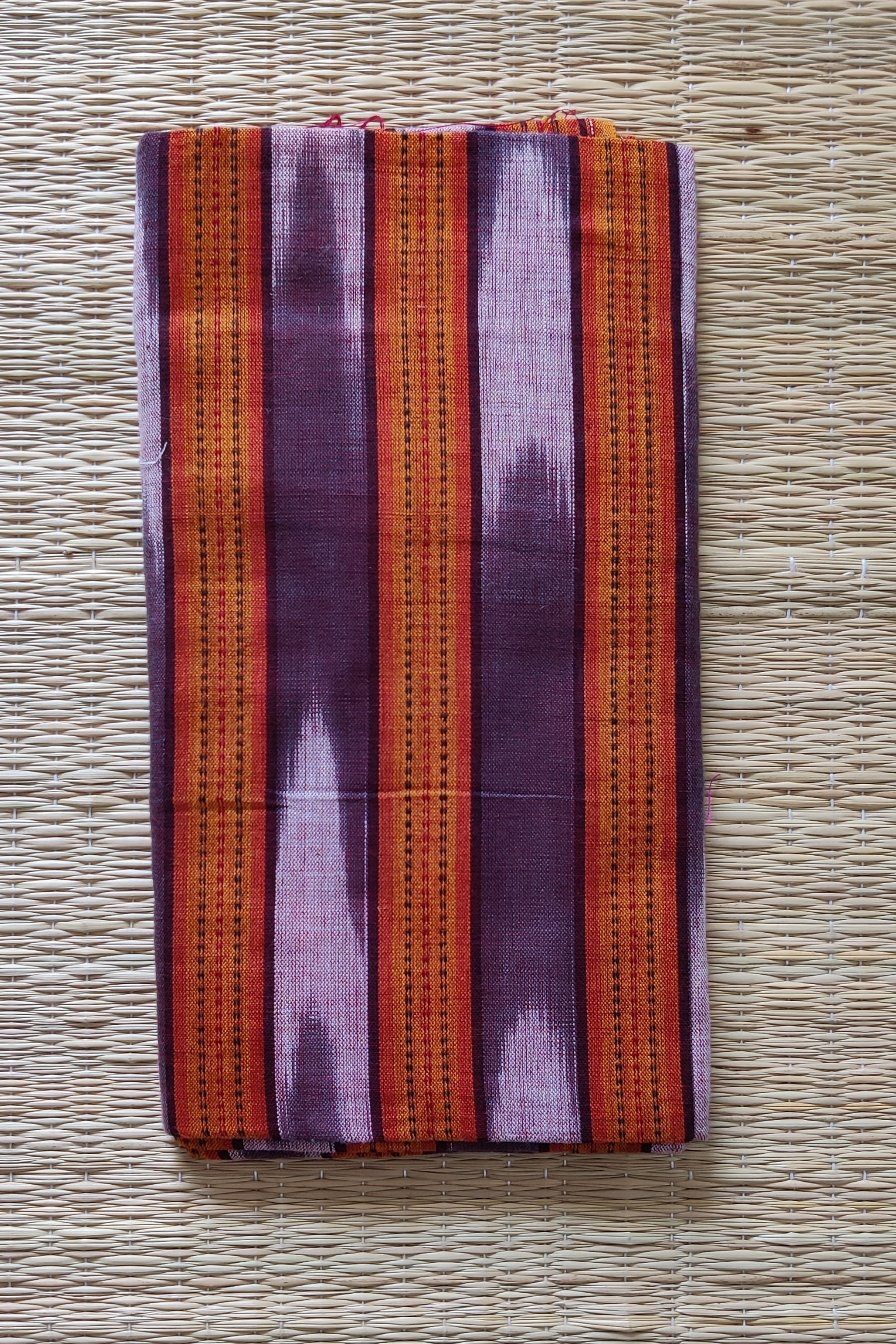 This beautiful purple and pinkish grey Sambalpuri cotton blouse piece is highlighted by bold orange stripes with black and red pin line detailing. The contrast between muted base tones and vibrant accents gives the fabric a graceful yet eye catching appeal. The soft cotton weave ensures comfort while maintaining structure for tailored blouse designs. Elegant color blending, fine stripe detailing and authentic ikkat weaving make it ideal for versatile styling.