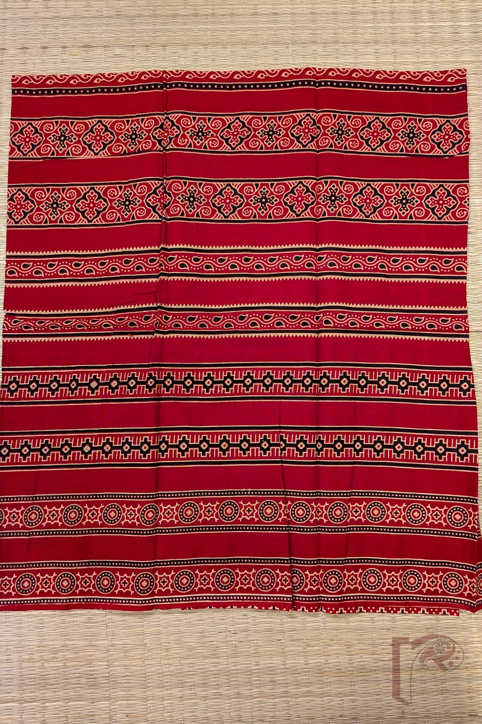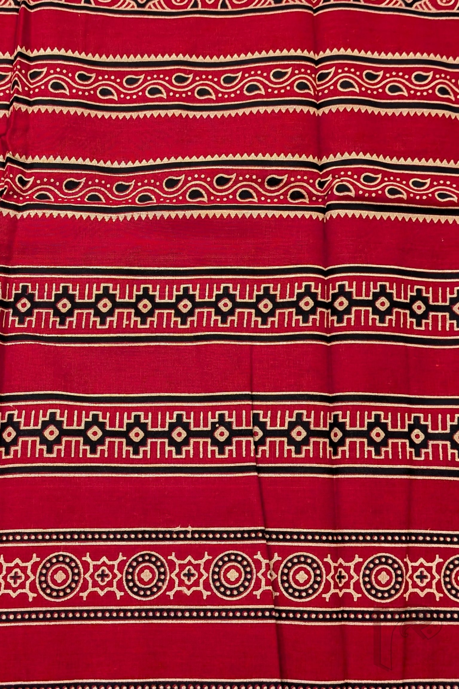 A vibrant red cotton blouse piece adorned with parallel bands of circle and square-like motifs contrasted beautifully with abstract diamond patterns in black and cream. The bold geometry gives this blouse piece a strong visual appeal while retaining traditional elegance. Made from lightweight breathable cotton, it offers comfort with statement styling, ideal for festive sarees and classic drapes.