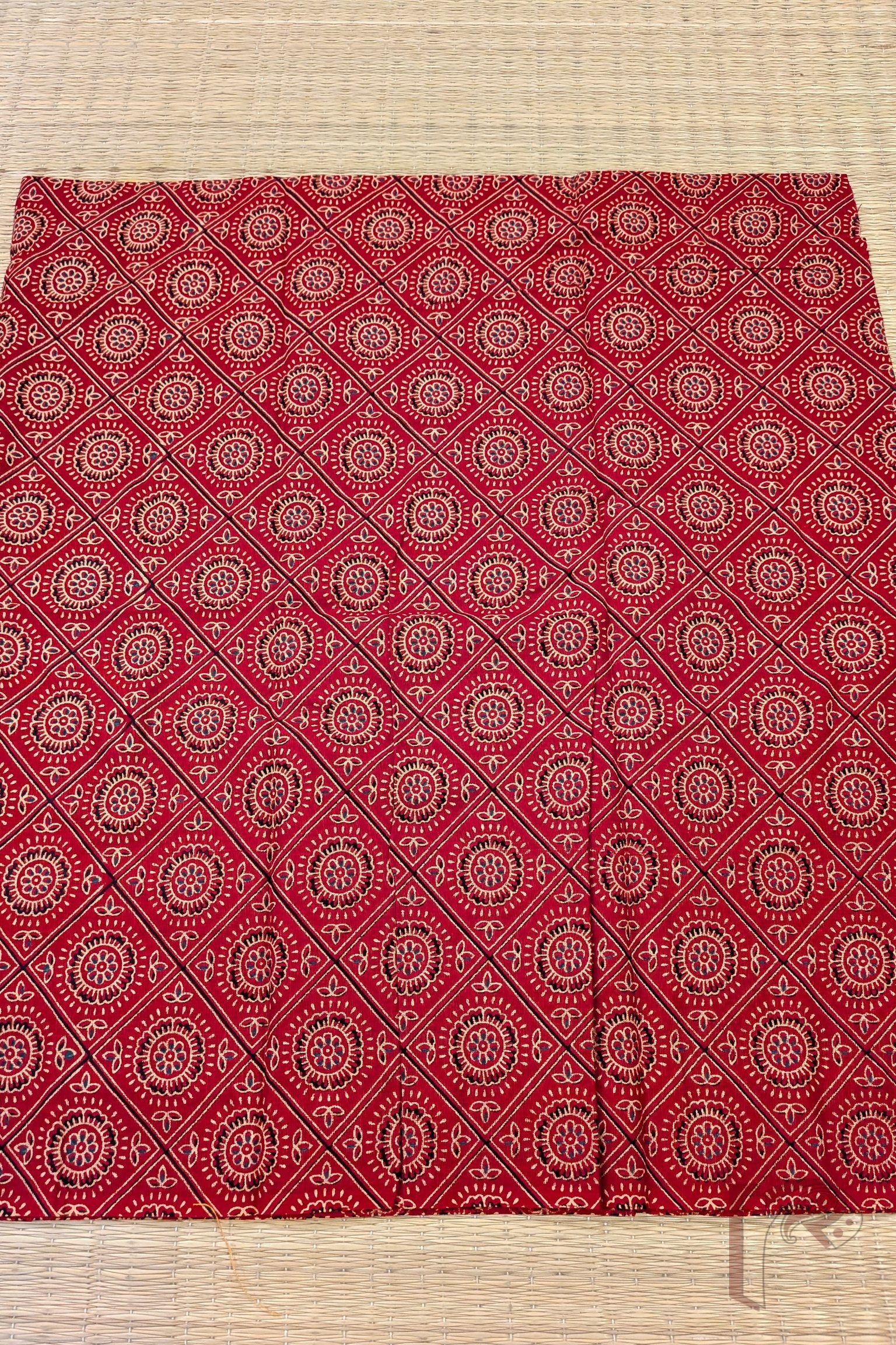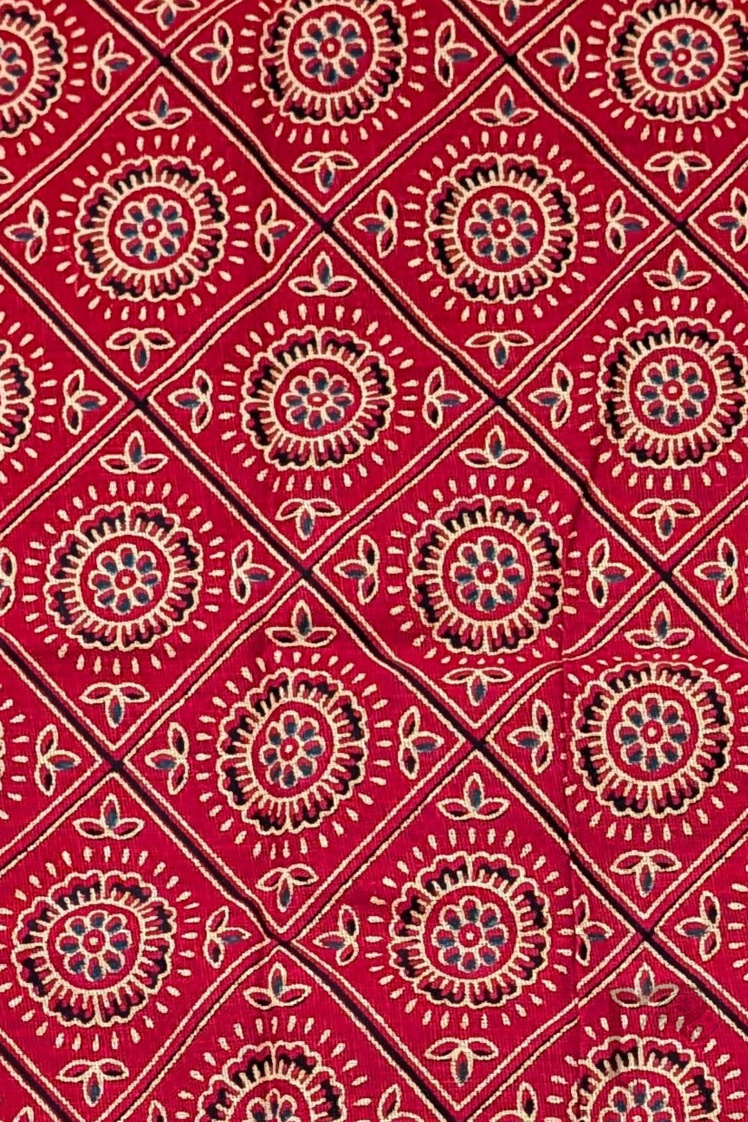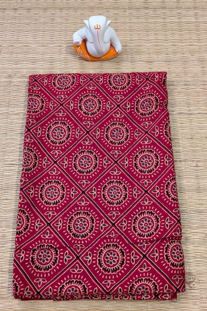 This vibrant red cotton blouse piece features bold black diamond grid lines filled with traditional Ajrakh motifs in black and cream. The contrast enhances the detailed craftsmanship, giving it a dramatic festive appeal. Made from lightweight breathable cotton, it ensures ease and elegance in every stitch.