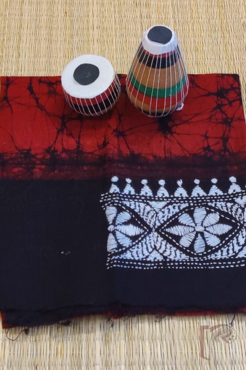 Red Cotton Batik Blouse Piece with Elegant White Kantha Embroidery