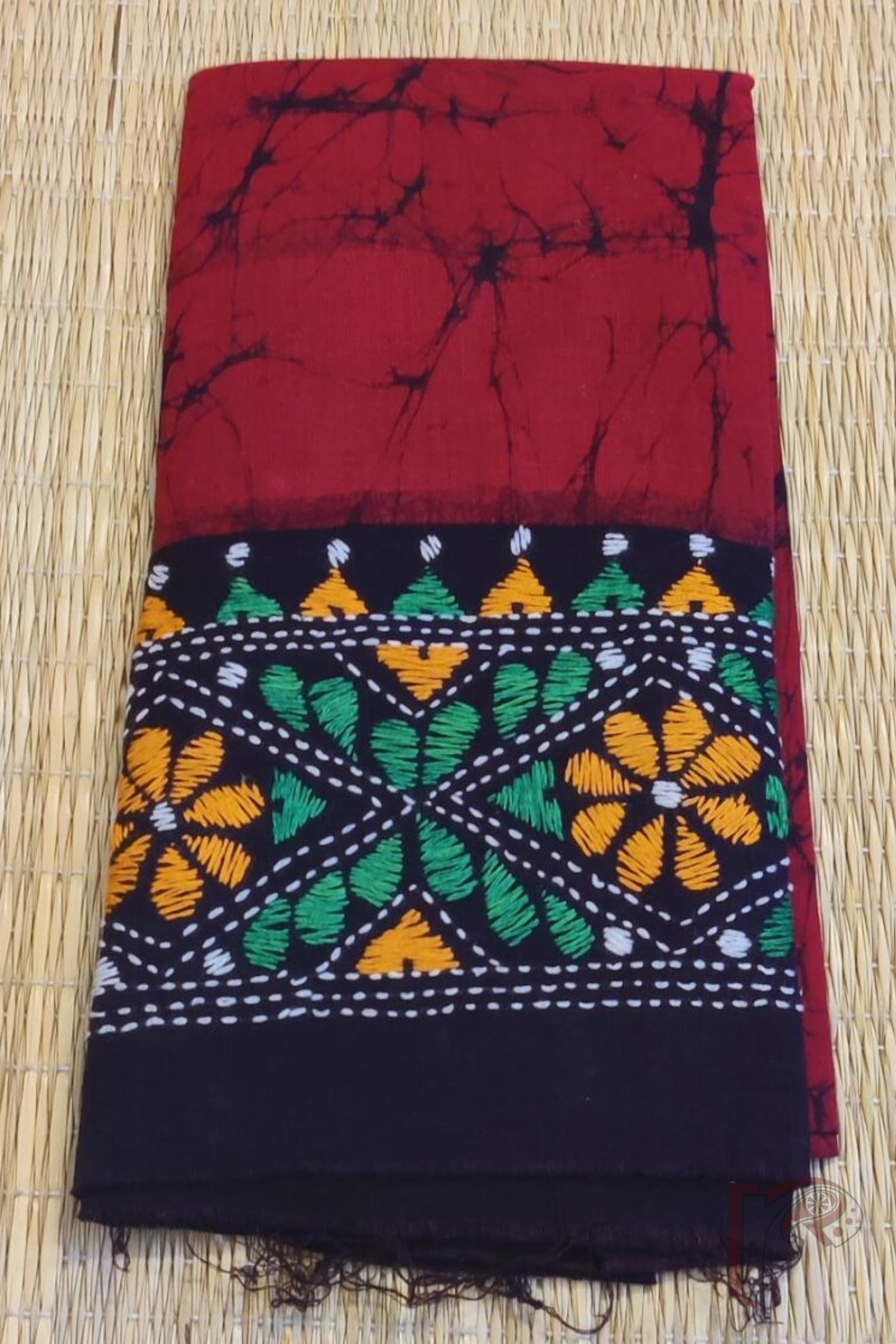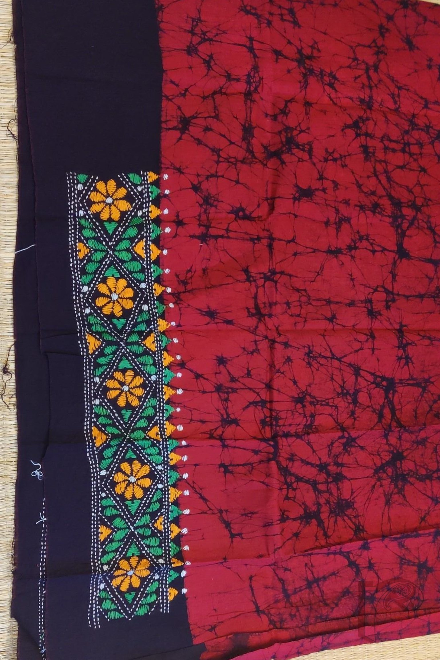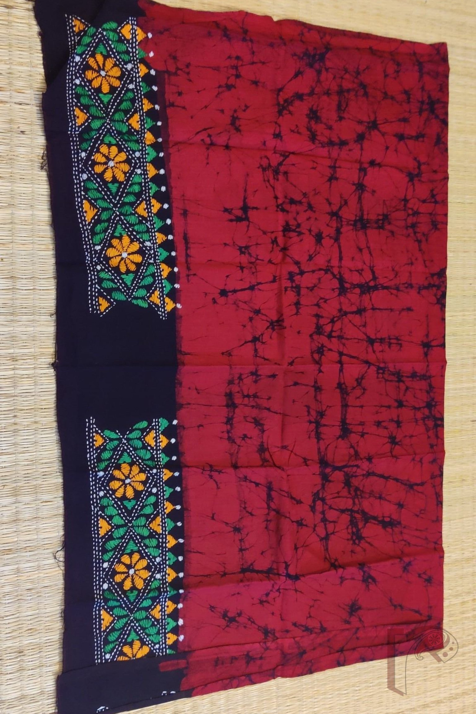 Red Cotton Batik Blouse Piece with Green, Orange, and White Kantha Embroidery