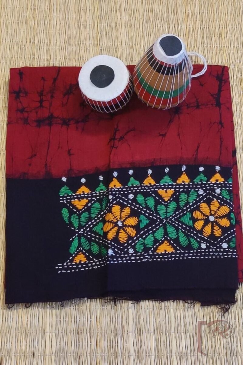 This deep red cotton batik blouse piece is a head-turner with its vivid tricolored Kantha embroidery. Green, orange, and white threads come together to create an eye-catching contrast, lending a festive feel to your ensemble. The textural richness of Kantha against batik makes this a unique addition to any saree lover’s wardrobe.