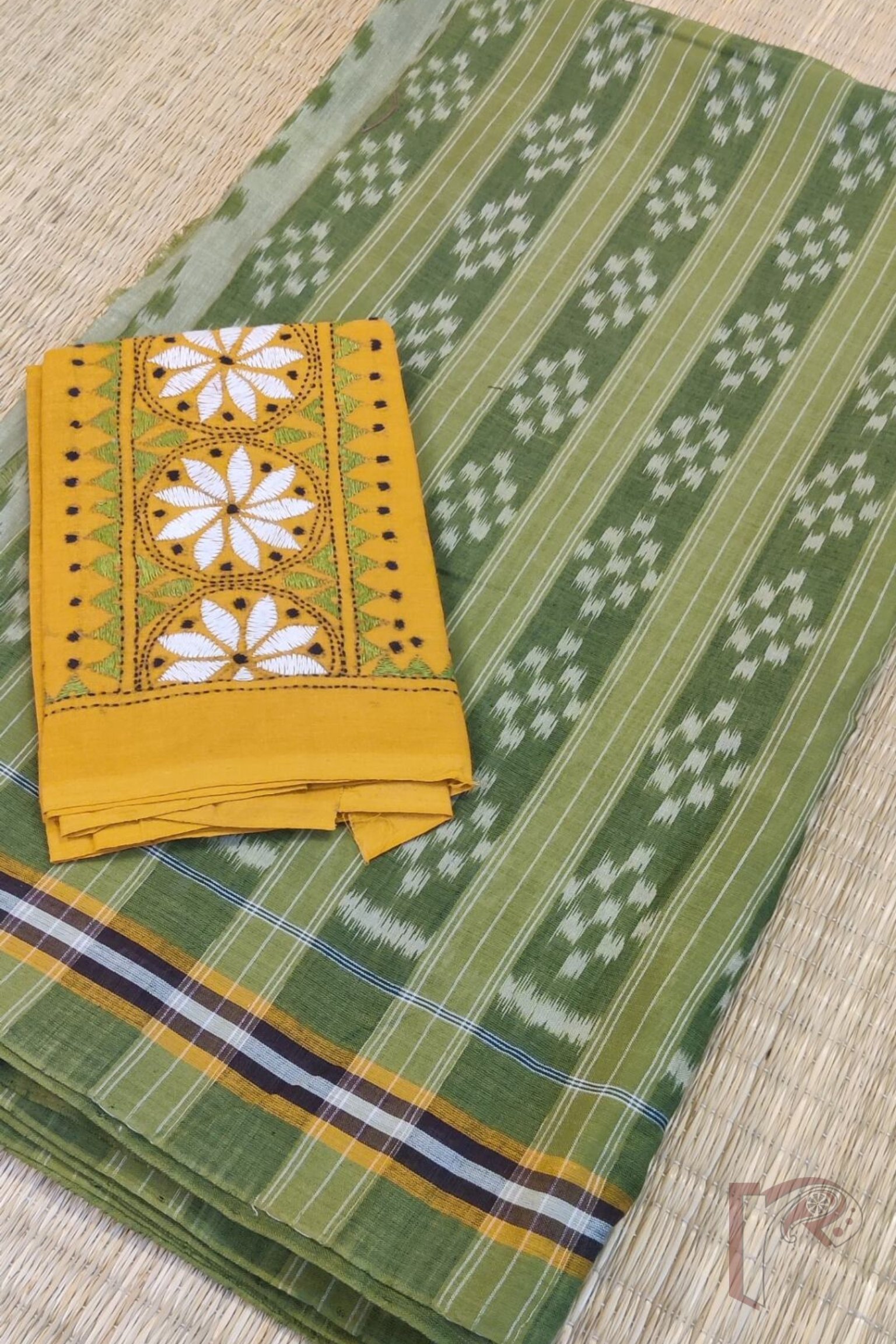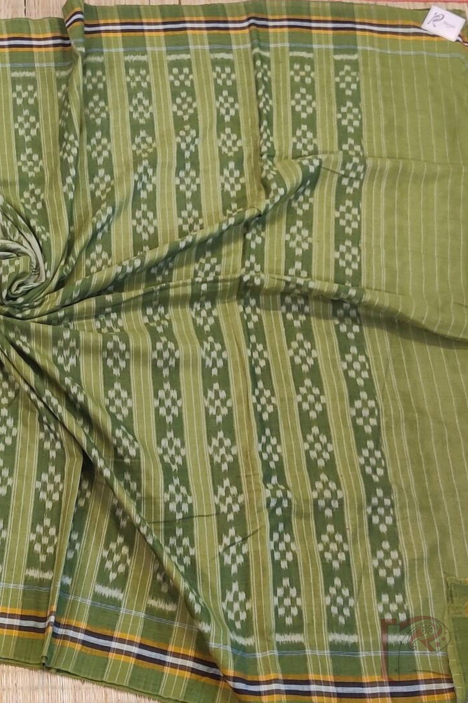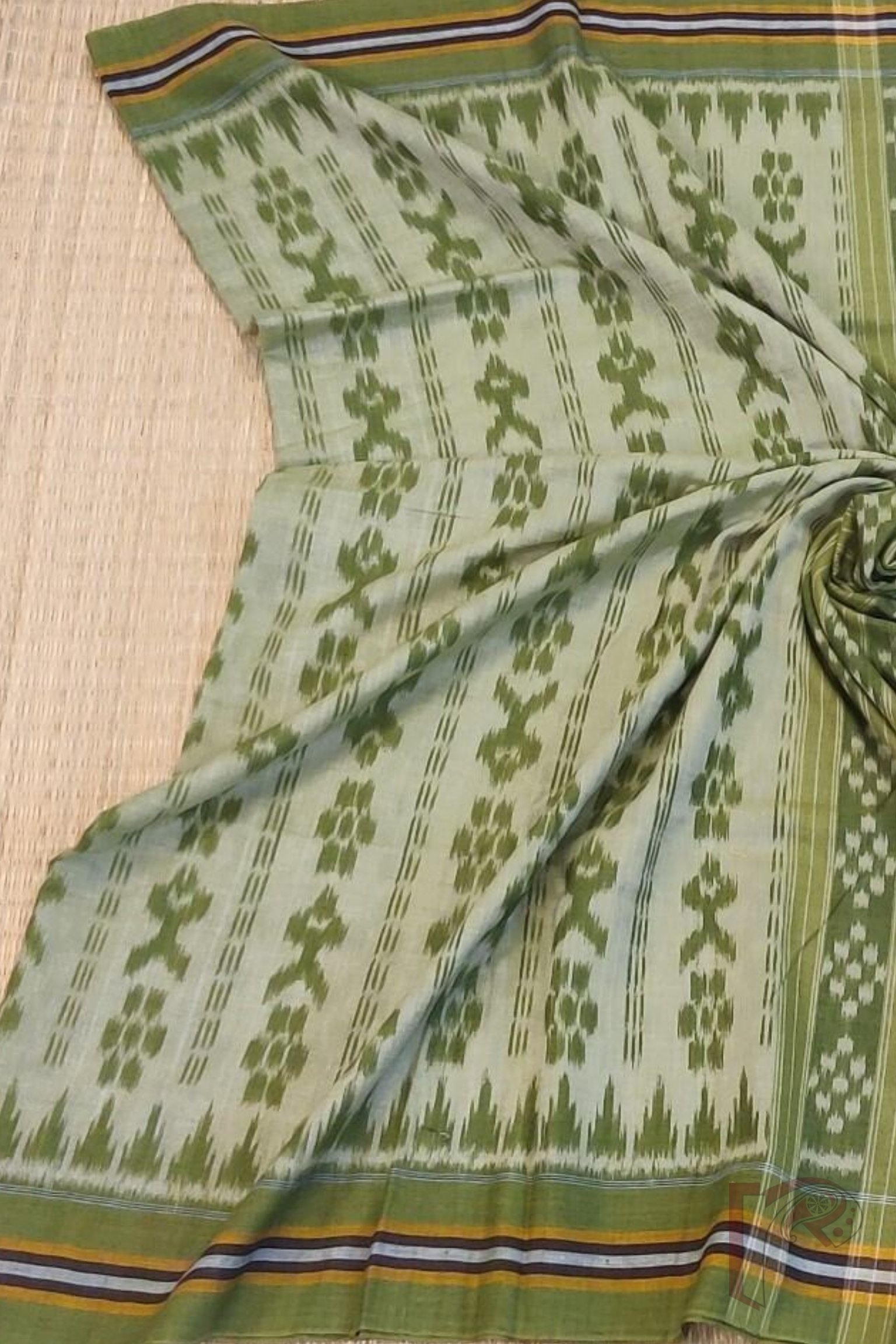 Sambhalpuri Saga – Sage Green Sambhalpuri Cotton Saree with Striped Kantha-like Weave and Yellow Accents