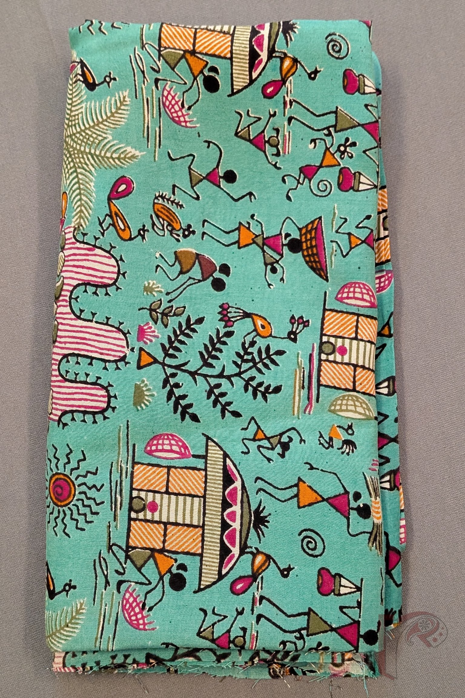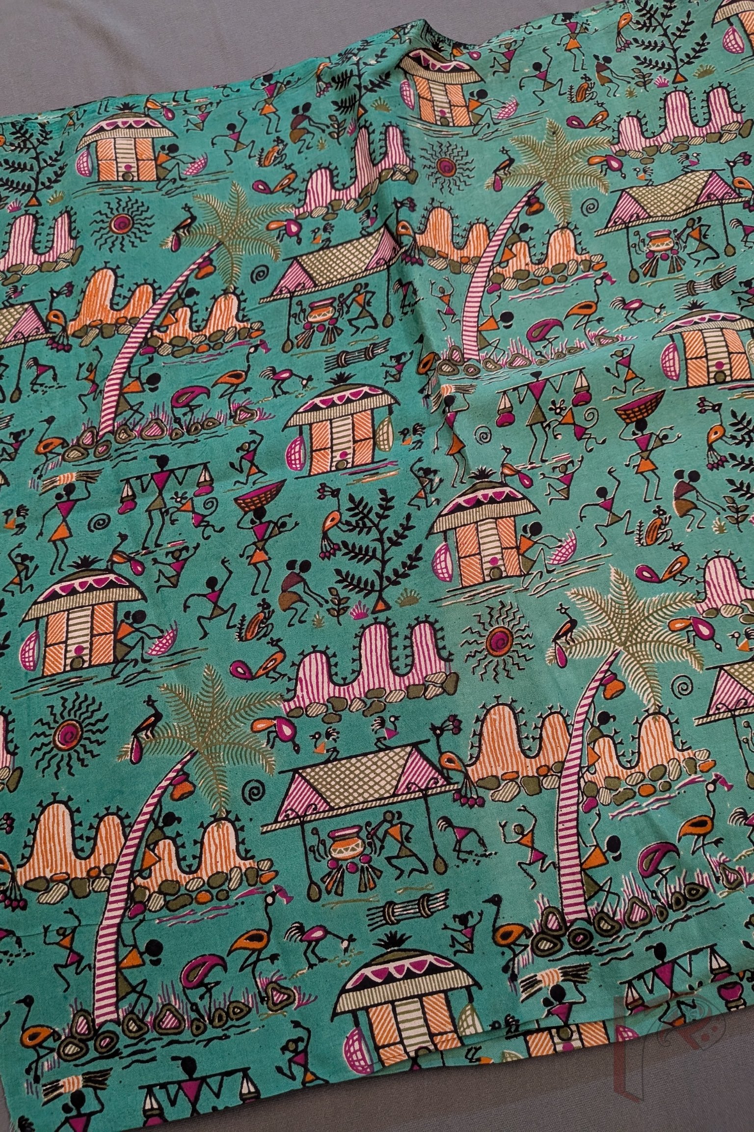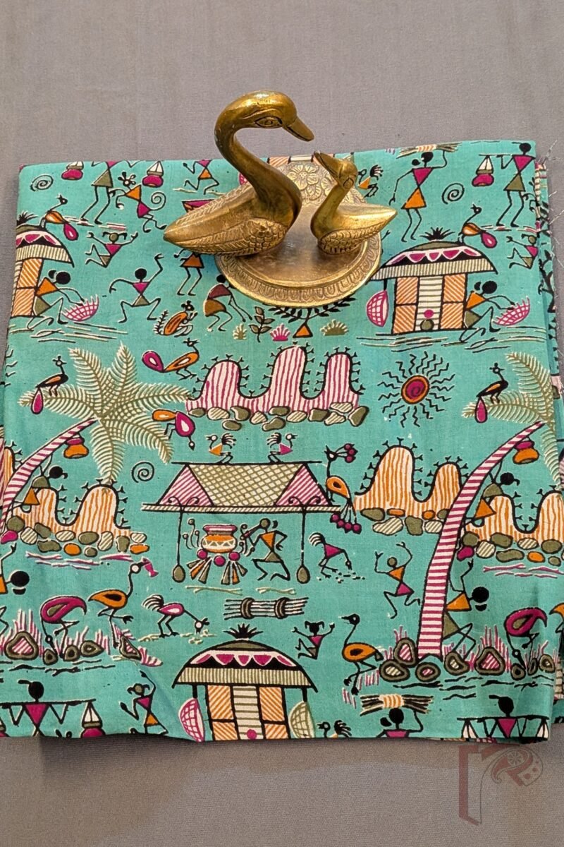 A refreshing sea green soft cotton silk blouse piece featuring screen-printed Kalamkari Worli art, illustrated with expressive human figures, sun, huts, and trees in lively shades of magenta, orange, green, and black. The cool base tone beautifully balances the vibrant palette, creating a harmonious and eye-catching composition. The soft cotton silk fabric offers breathability with a gentle sheen, making this blouse ideal for pairing with both earthy handloom sarees and contemporary drapes. An artistic piece that celebrates folk storytelling through colour and movement.