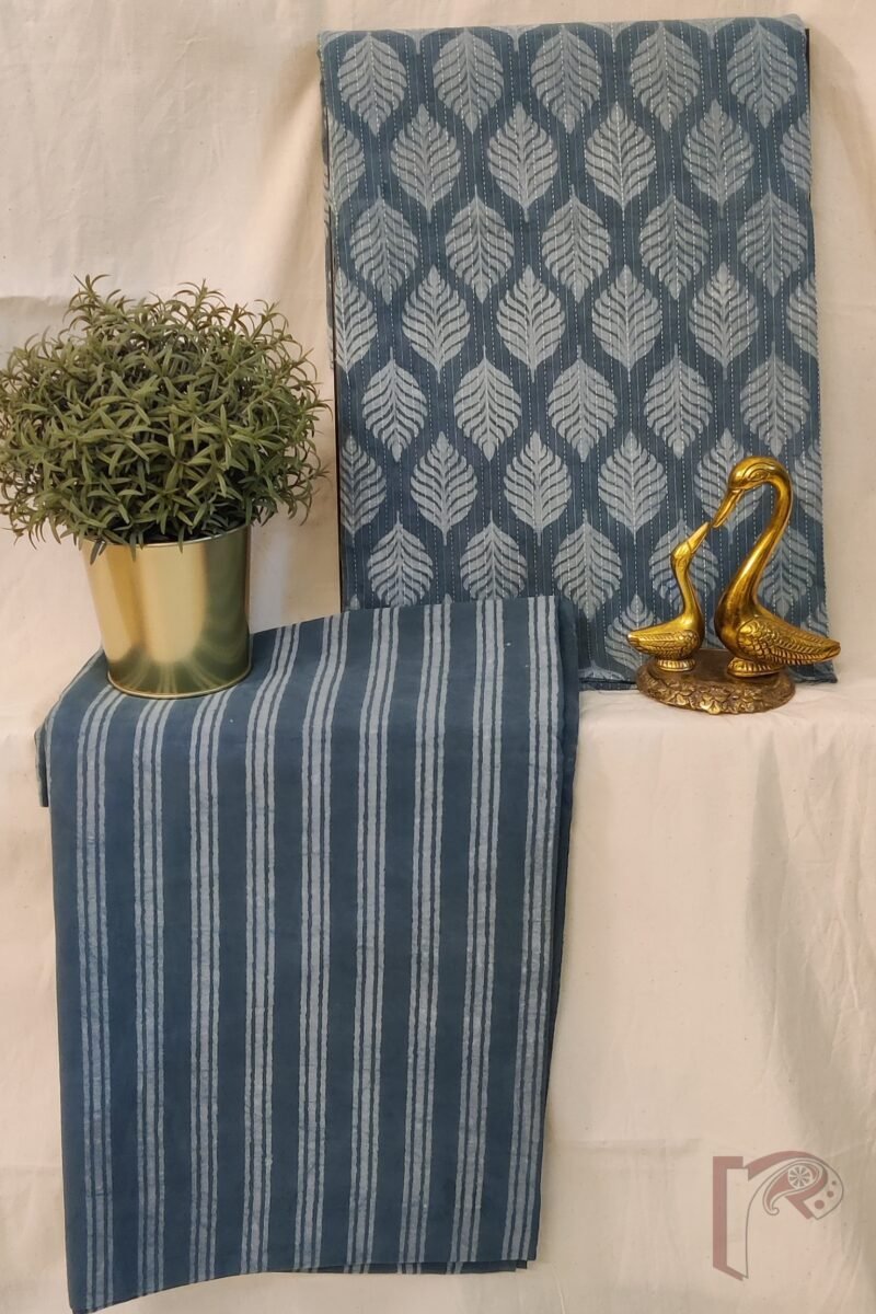 In a serene bird-blue grey shade, this mulmul suit features a delicate leaf motif block print on the kurta. The bottom stands out with its three-line pinstripe pattern, where the centre stripe is slightly thicker, adding subtle structure and interest. Soft, breathable, and soothing to the skin, this set is perfect for creating a polished everyday look with minimal effort.