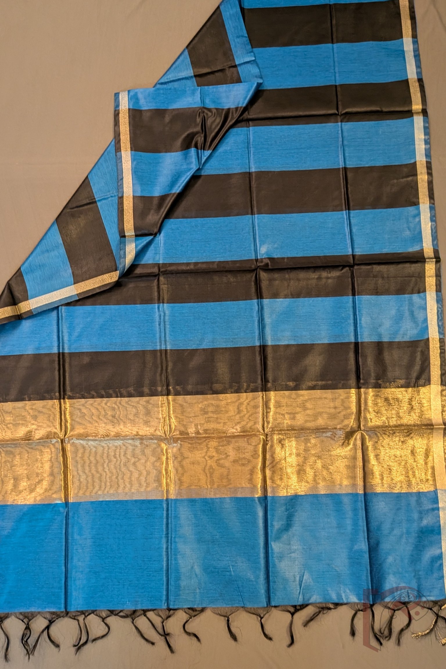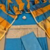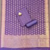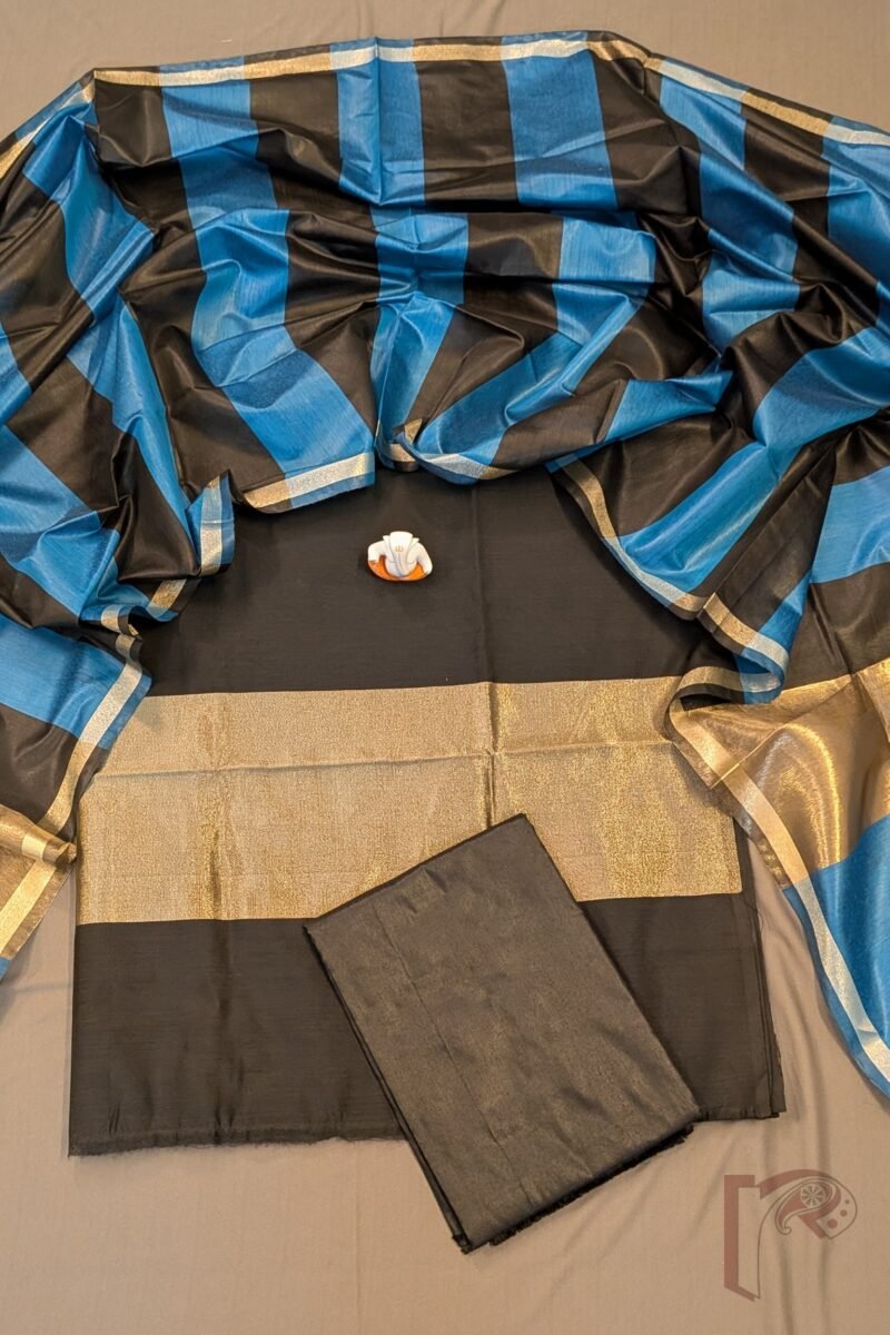 Every suit material features the classic Banarasi touch through its intricately woven zari borders—crafted using traditional looms and techniques perfected over generations. The 8-inch gold zari border on the kurta gives each piece a touch of grandeur without overwhelming the minimalist aesthetic. The dupattas, patterned in graceful vertical or panel stripes, carry Banaras’ legacy of structured weaving with subtle zari edging that adds a delicate shimmer. Lightweight, durable and visually refined, these sets offer a perfect blend of traditional craftsmanship and contemporary style. Their soft drape, rich mercerised texture, and authentic Banarasi weave identity ensure every wearer feels effortlessly graceful and beautifully adorned.