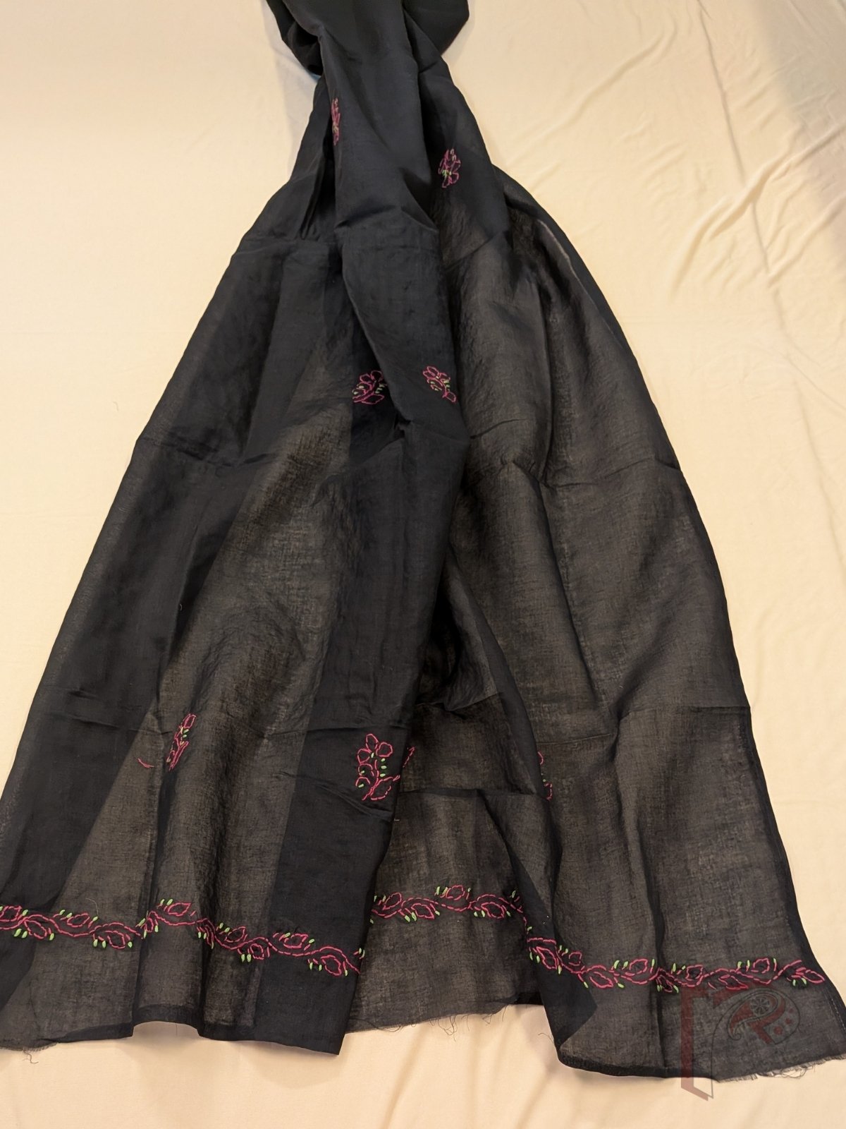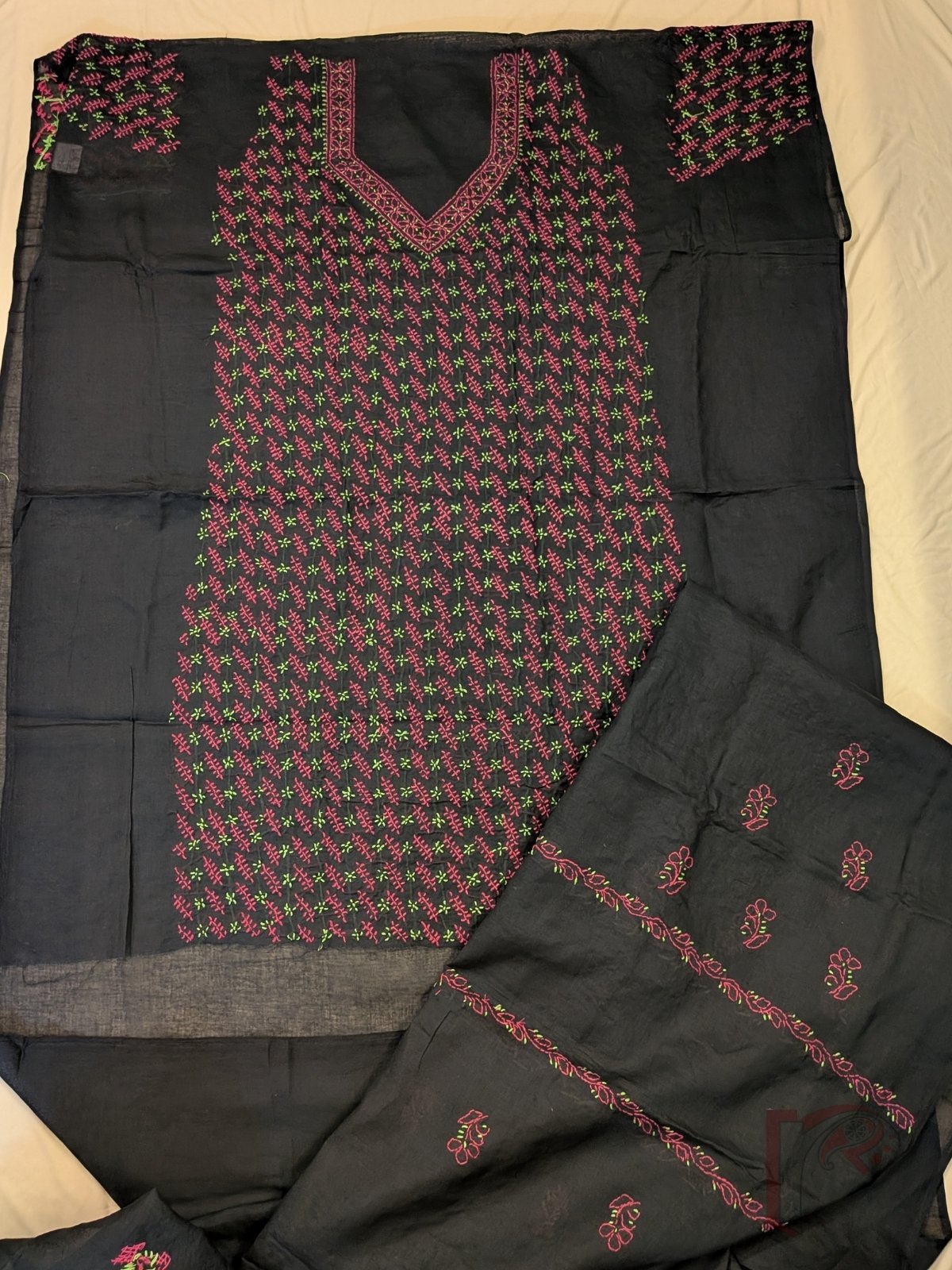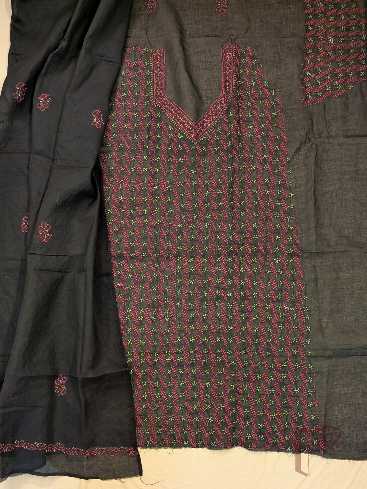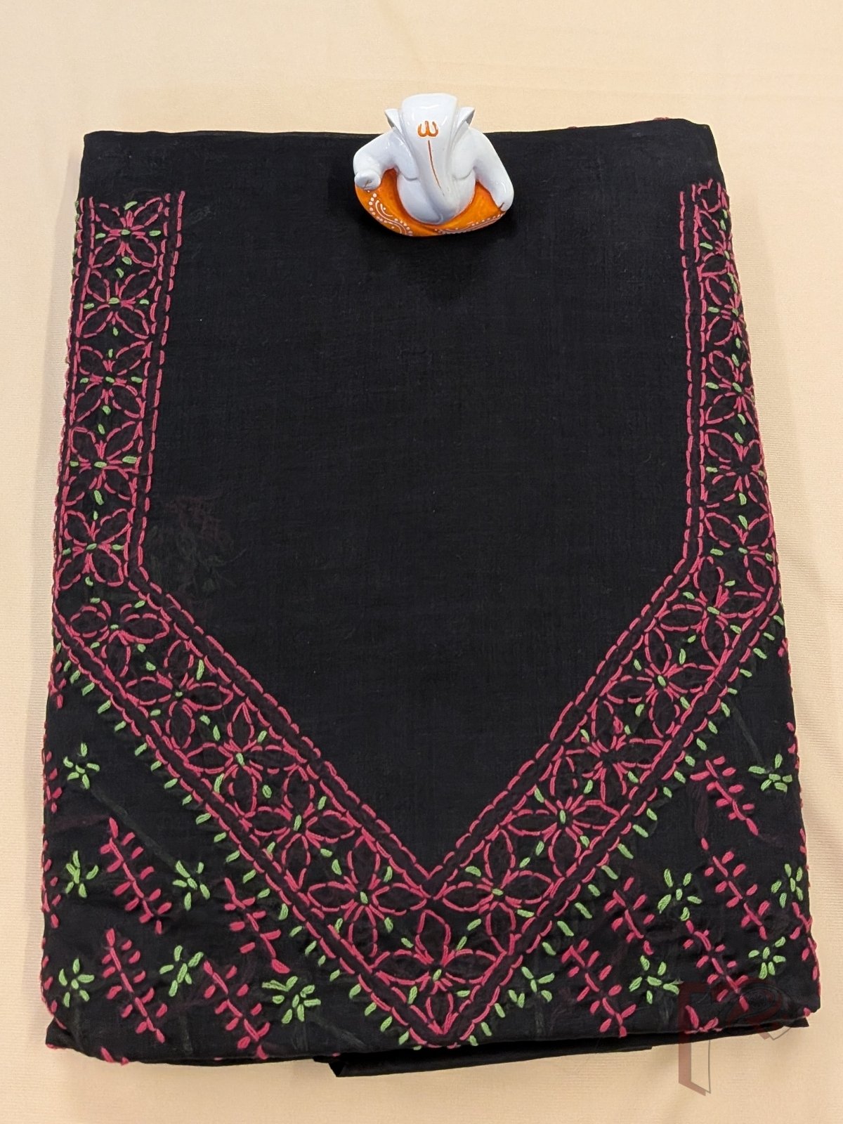 Suit Stories – Black Cotton Lucknowi Chikankari Jal Embroidered Unstitched Suit with Pink and Light Green Dual Thread Floral Work and Cotton Dupatta