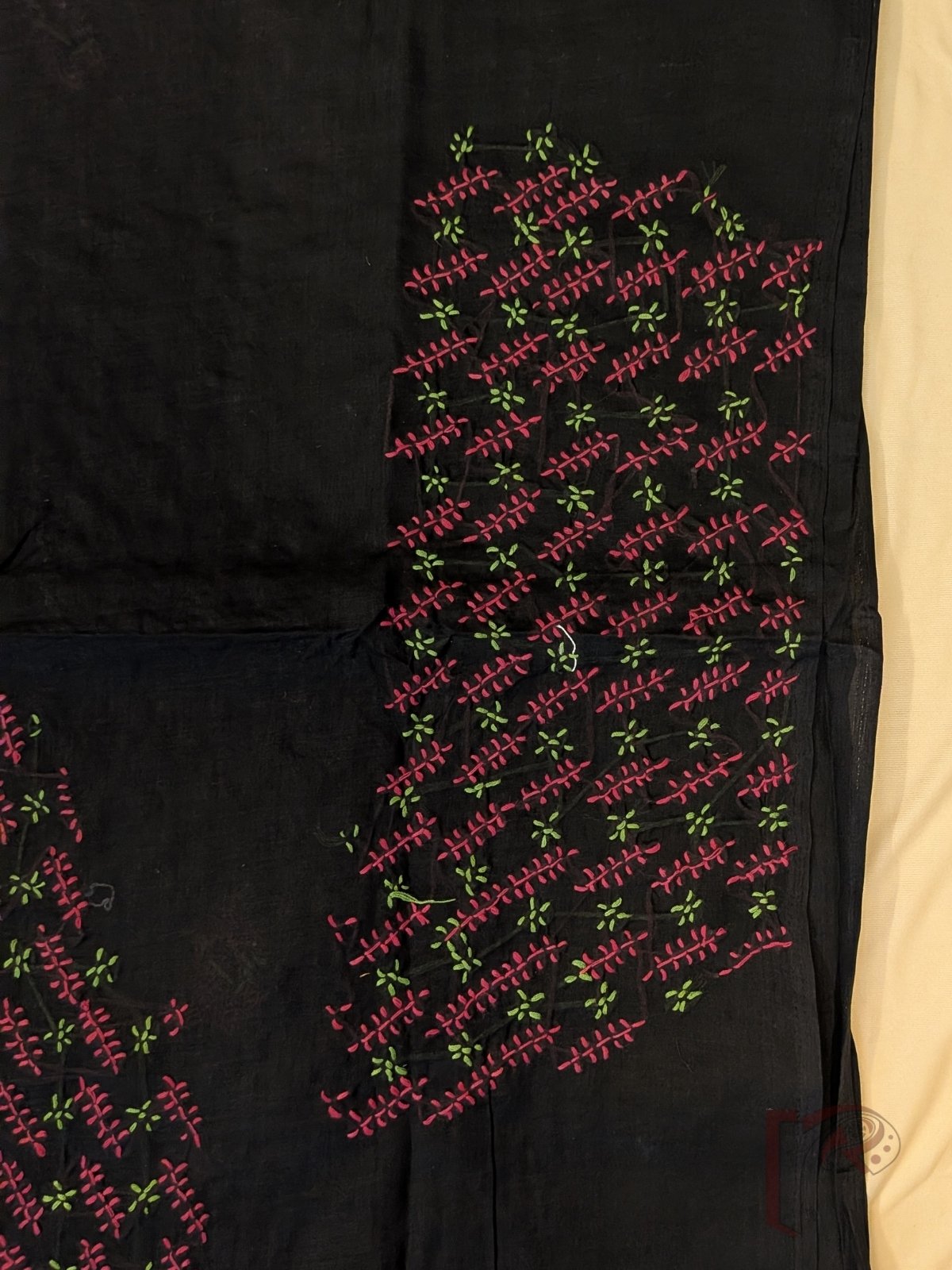 A graceful black cotton unstitched suit set adorned with delicate dual-tone Lucknowi chikankari embroidery in soft pink and light green threads. The front kurta panel features an emphasized embroidered neckline flowing into a fine jal pattern of stem and leaf motifs, creating a beautifully detailed surface. The sleeves continue the running stitch jal pattern, allowing for a coordinated short sleeve design. The back is kept subtle with spaced floral motifs, balancing the rich front panel. The bottom fabric carries a simple border with triangular floral motif placement, ensuring a polished stitched finish. The cotton dupatta is adorned with scattered floral motifs, making this ensemble lightweight, elegant, and perfect for refined everyday wear.