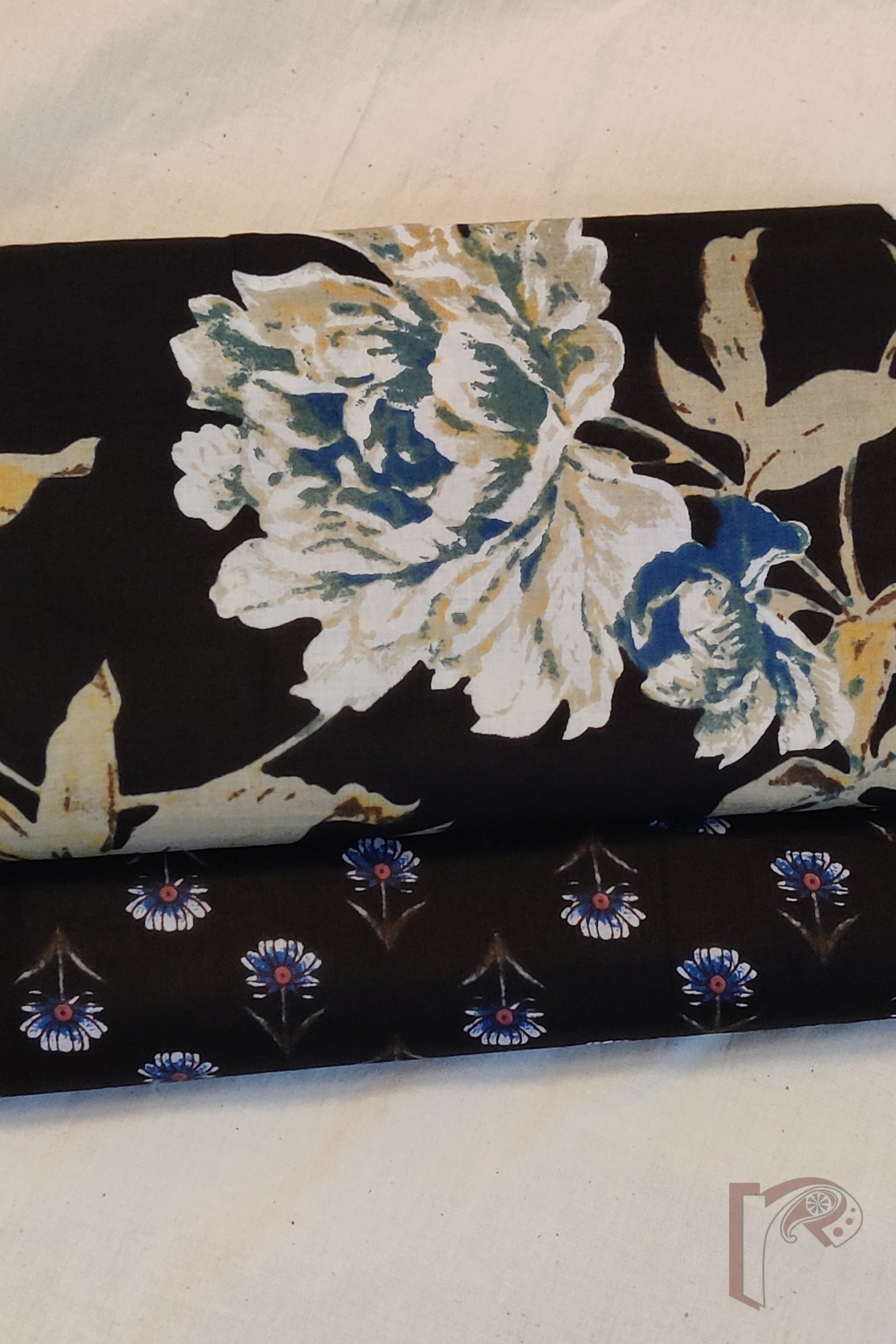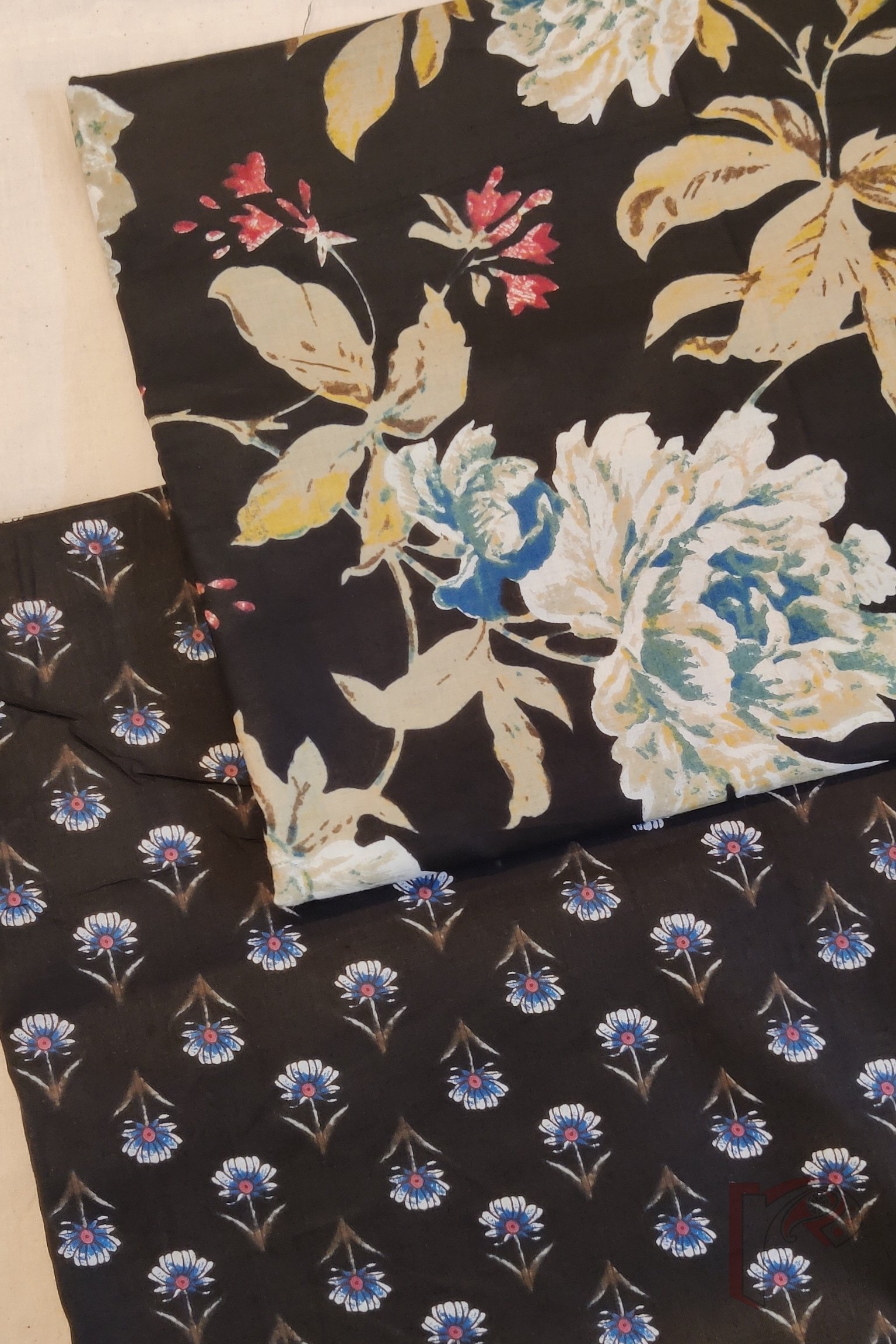 Suit stories – Black Mulmul Suit with Multicolour Floral Kurta and Black Bottom with Tiny Motifs