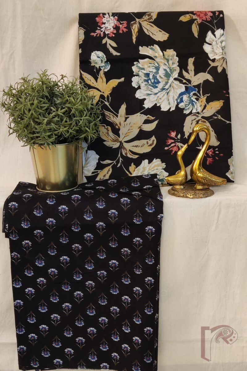 A vibrant take on monochrome, this black mulmul suit features bold multicolour floral and leaf motifs in shades of blue, grey, and pink, creating an eye-catching kurta full of artistic depth. The bottom complements it with small printed floral elements scattered across the black base. Soft, breathable, and full of personality, this set is perfect for days when you want to make a statement with comfort.