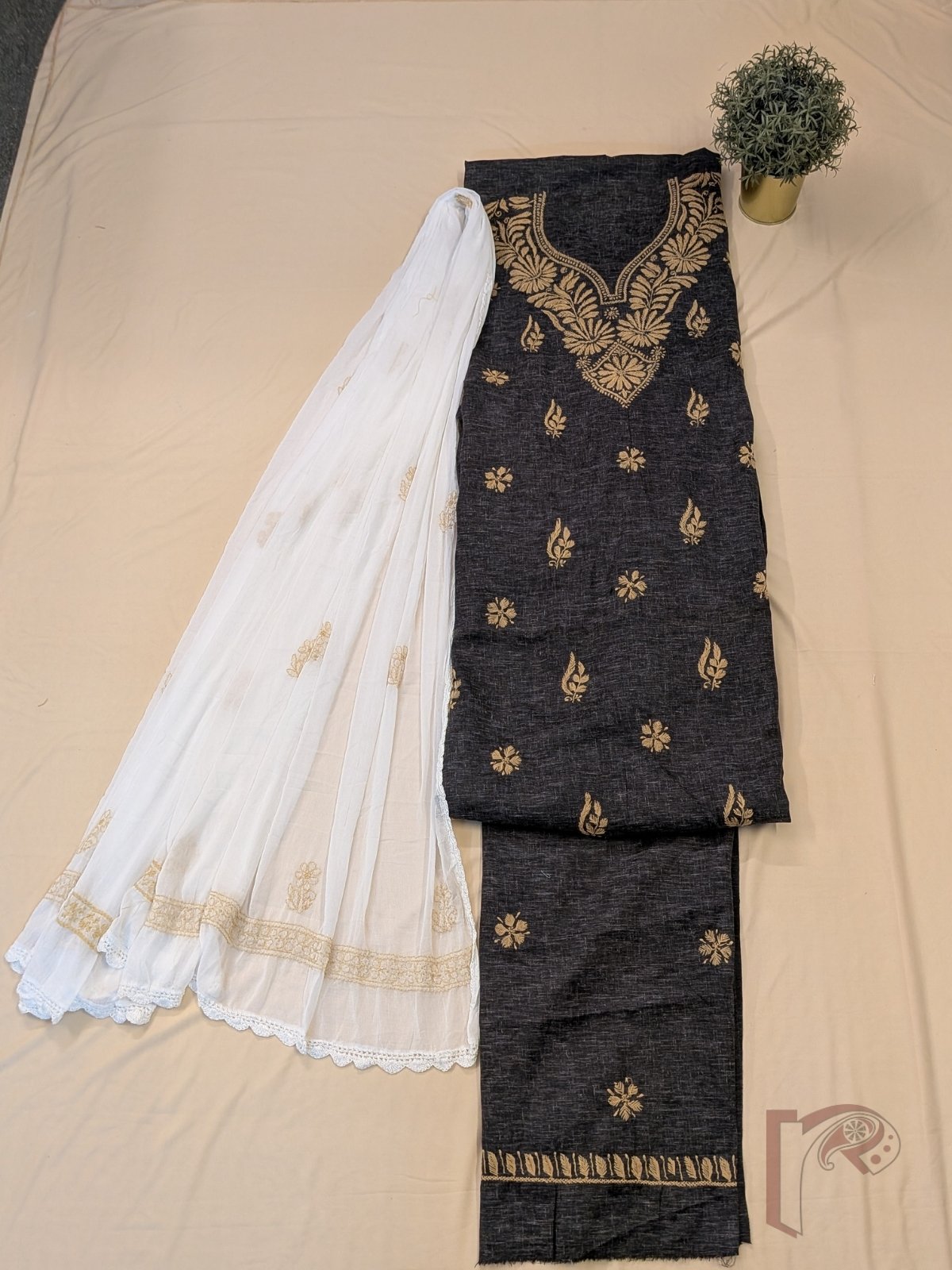 Suit Stories – Black Textured Khadi Cotton Lucknowi Chikan Embroidered Unstitched Suit with White Chiffon Dupatta and Fawn Thread Embroidery with Lace Border