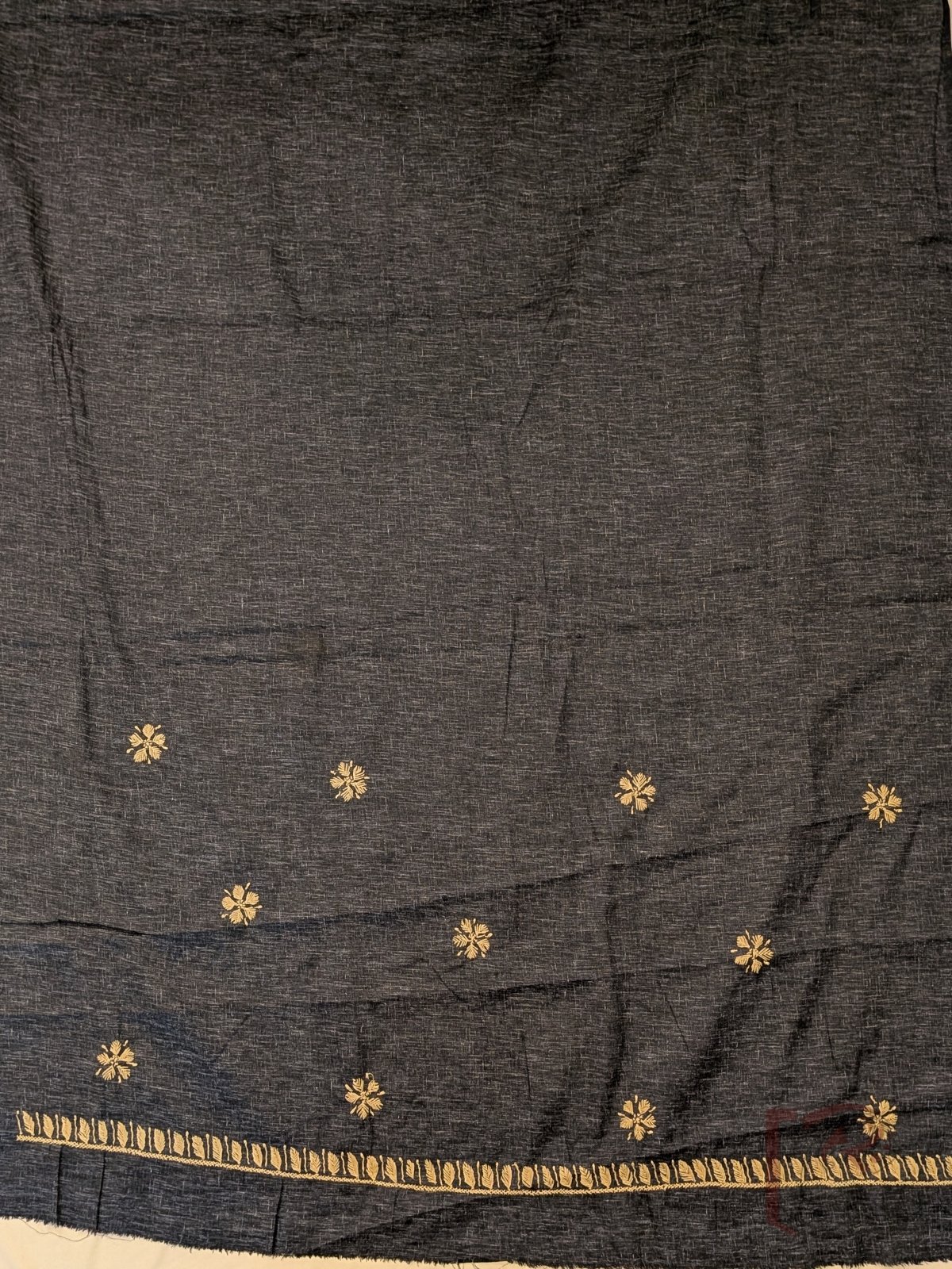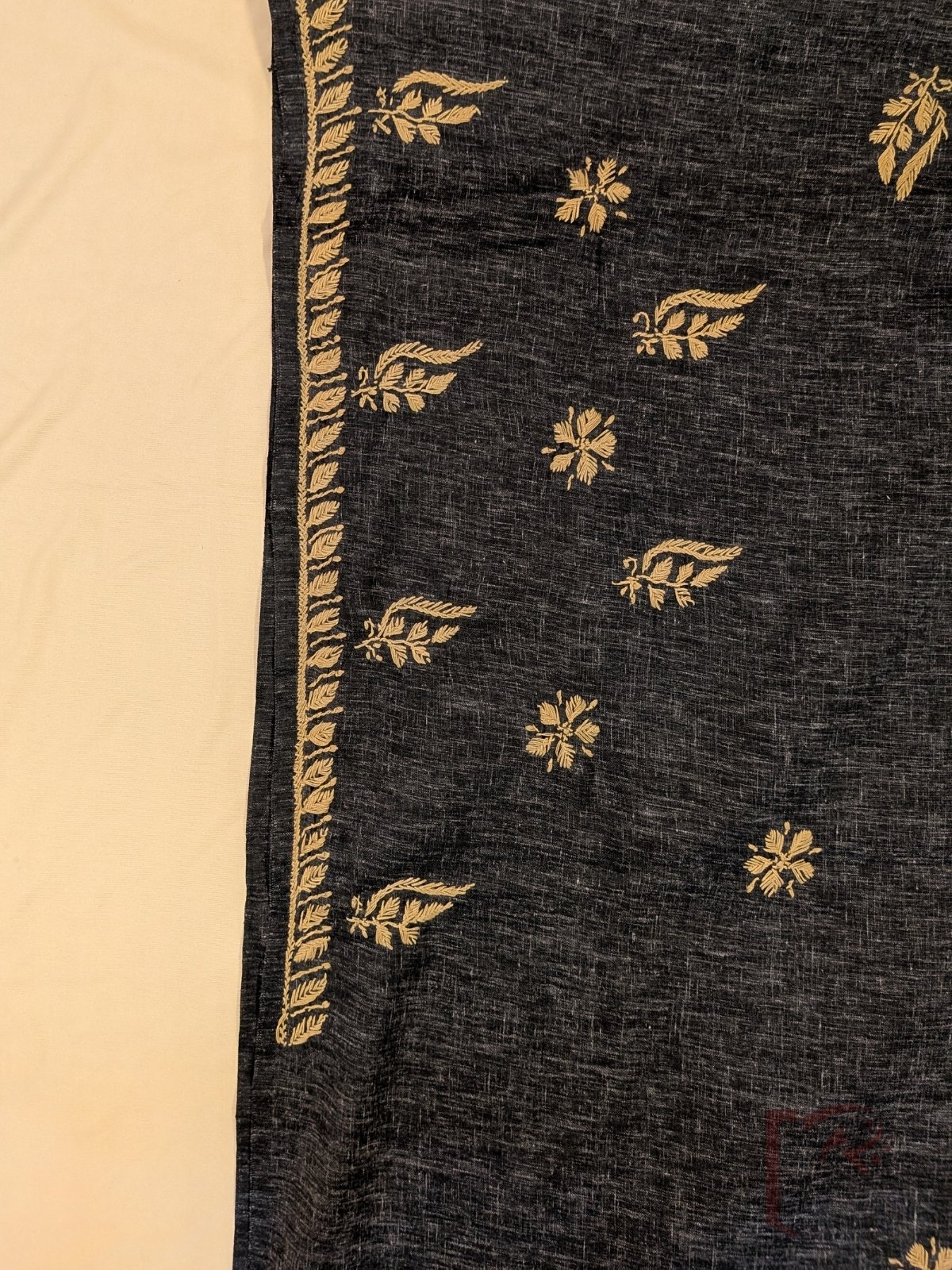 A striking textured black khadi cotton suit set elevated with elegant Lucknowi chikan embroidery in soft fawn brown thread. The beautifully crafted neckline features floral embroidery forming a graceful frame, while delicate leaf and flower motifs spread across the front panel adding depth and detail. The shaded black bottom fabric carries coordinated embroidery near the lower edge, making it ideal for a stylish tailored pant. The ensemble is paired with a white chiffon dupatta adorned with matching fawn thread embroidery and finished with a refined white lace border that adds sophistication and contrast. Comfortable yet statement-making, this unstitched suit blends classic tones, handcrafted embroidery, and airy elegance perfectly.