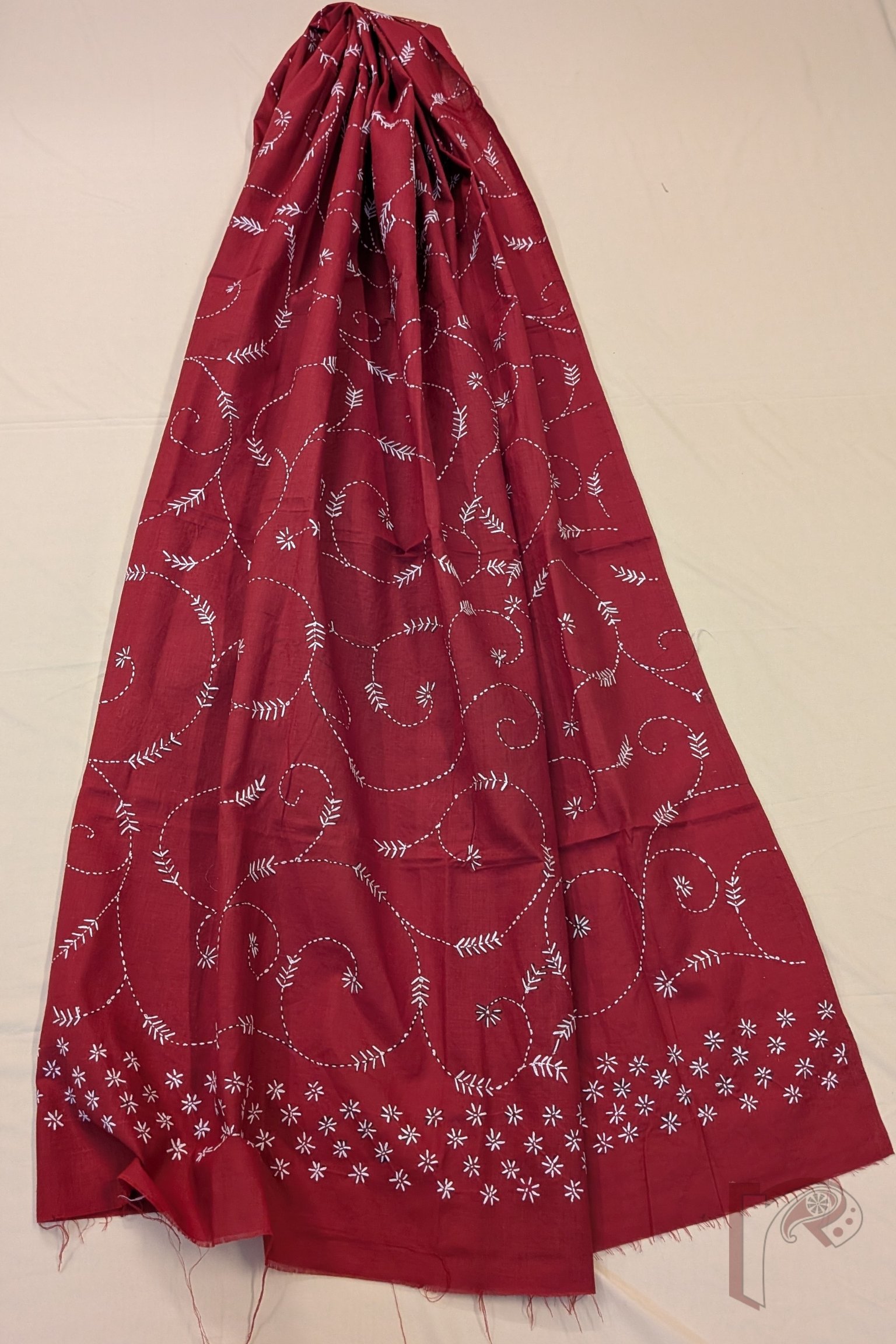 Rich and striking, this suit set features deep brick red cotton fabric enhanced with intricate Kantha hand embroidery in white thread, creating a beautiful contrast that highlights the craftsmanship of the piece. The kurta front panel is adorned with fine stick flower motifs embroidered across the fabric, while the neckline features denser floral petal patterns that add depth and elegance to the design. The dupatta is crafted from soft voile cotton decorated with delicate running stitch patterns forming graceful winding stems, along with rows of floral embroidery at the ends that echo the kurta’s motif. The combination of bold colour, delicate white embroidery, and lightweight cotton texture makes this suit set a striking yet graceful outfit for both casual gatherings and festive wear.
