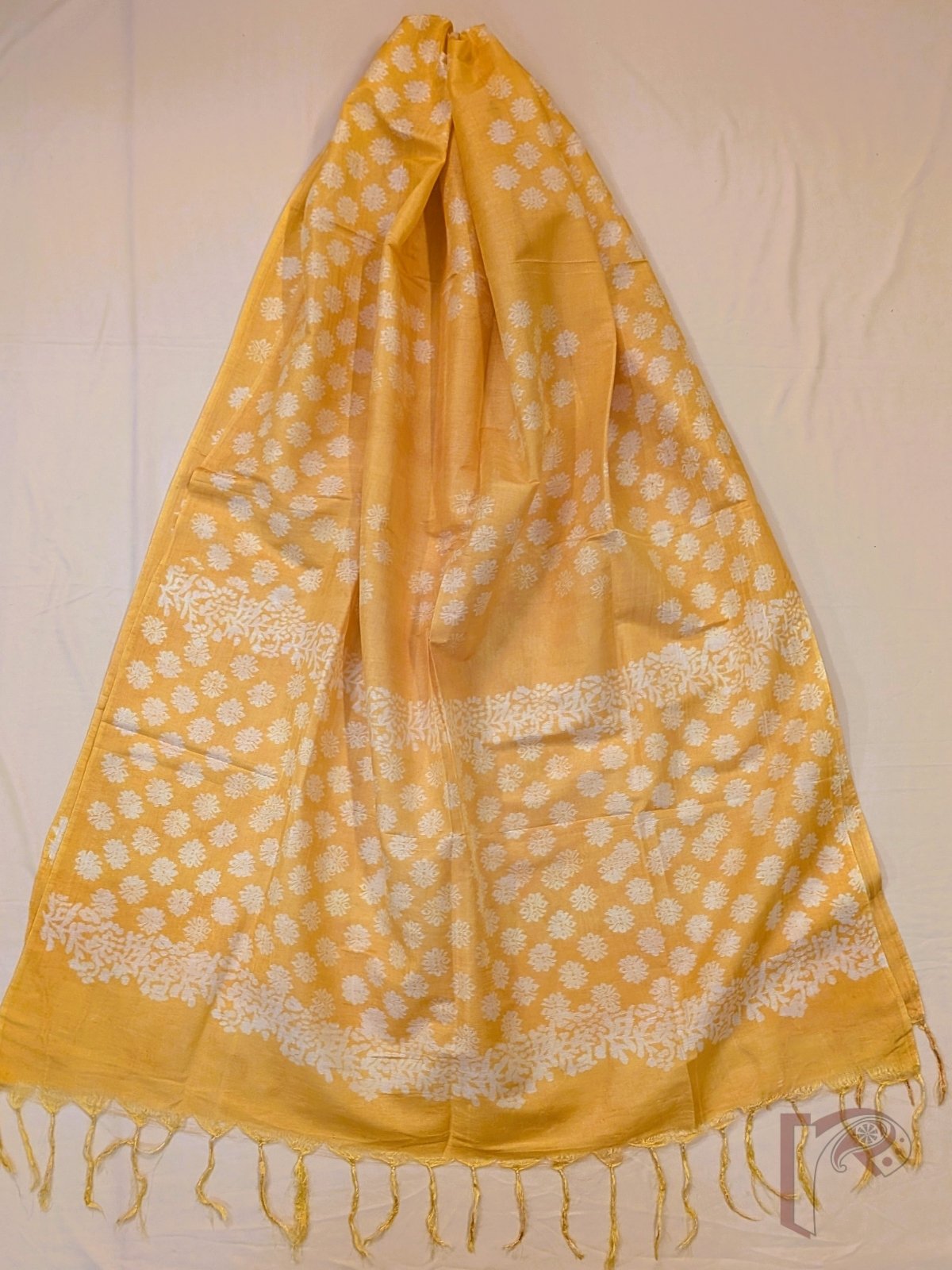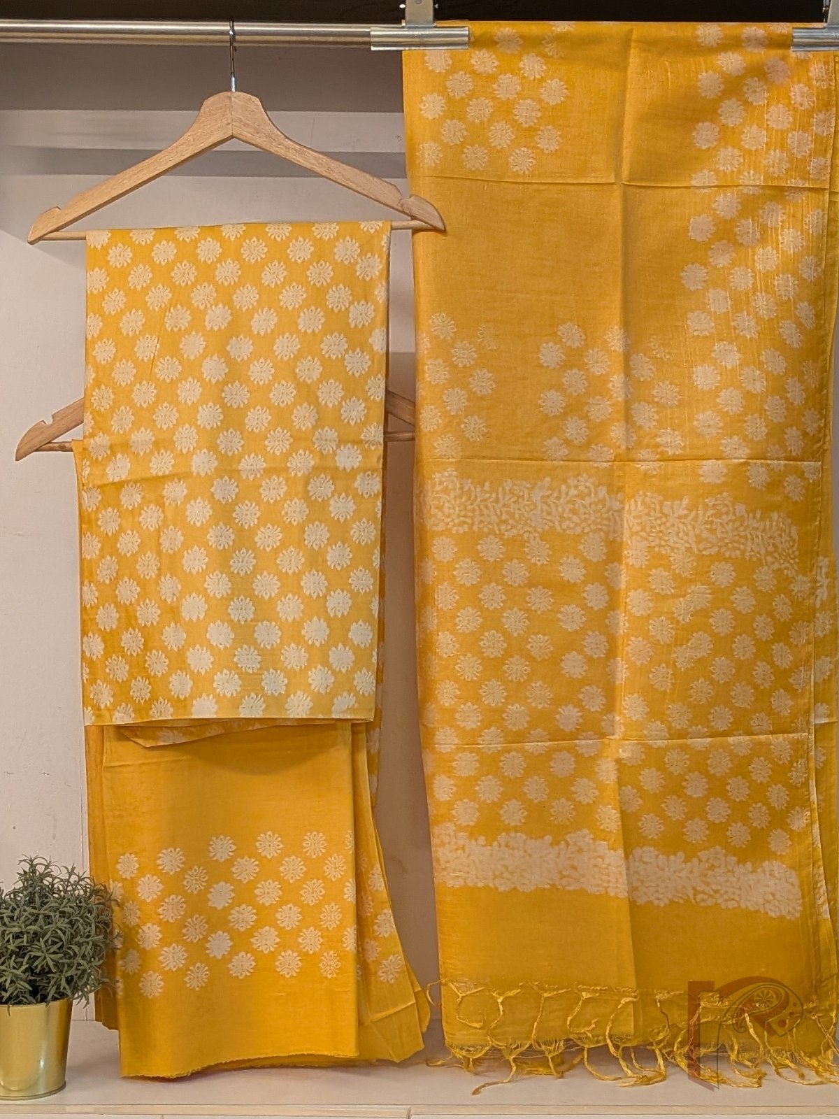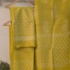 Radiating warmth and vibrance, this bright yellow suit set is a celebration of joyful elegance. The kurta fabric features tiny offwhite handblock floral motifs scattered gracefully, creating a lively yet refined look. Crafted in soft and breathable Chanderi cotton silk, it offers a perfect balance of comfort and sheen. The solid pant is accentuated with block printed detailing at the bottom, while the coordinated dupatta completes the look beautifully. Ideal for daytime gatherings, this ensemble brings together brightness, tradition, and effortless style.