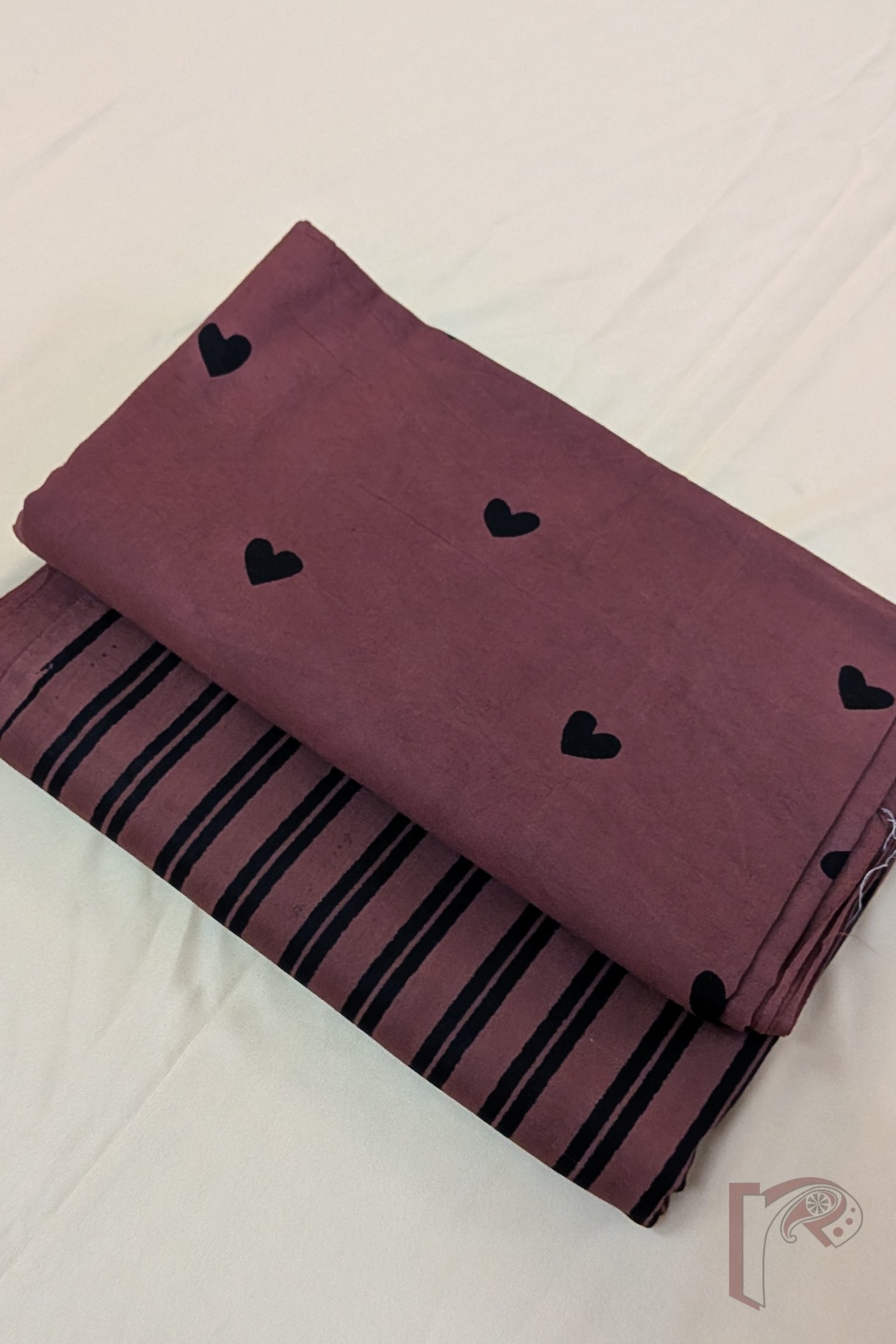 Subtle yet striking, this Brown & Black Mulmul Cotton Suit Set brings together earthy tones and playful detailing in a refined way. The kurta fabric is adorned with spaced black heart motifs printed at distant intervals, creating a clean and minimal pattern with a hint of charm. The bottom fabric complements the look beautifully with neat parallel black lines running across the rich brown base, adding structure and visual balance. Crafted from soft and breathable mulmul cotton, this set offers a lightweight, airy feel that keeps you comfortable throughout the day. Perfect for those who appreciate understated style, it blends minimal design, soothing colours, and effortless everyday elegance.