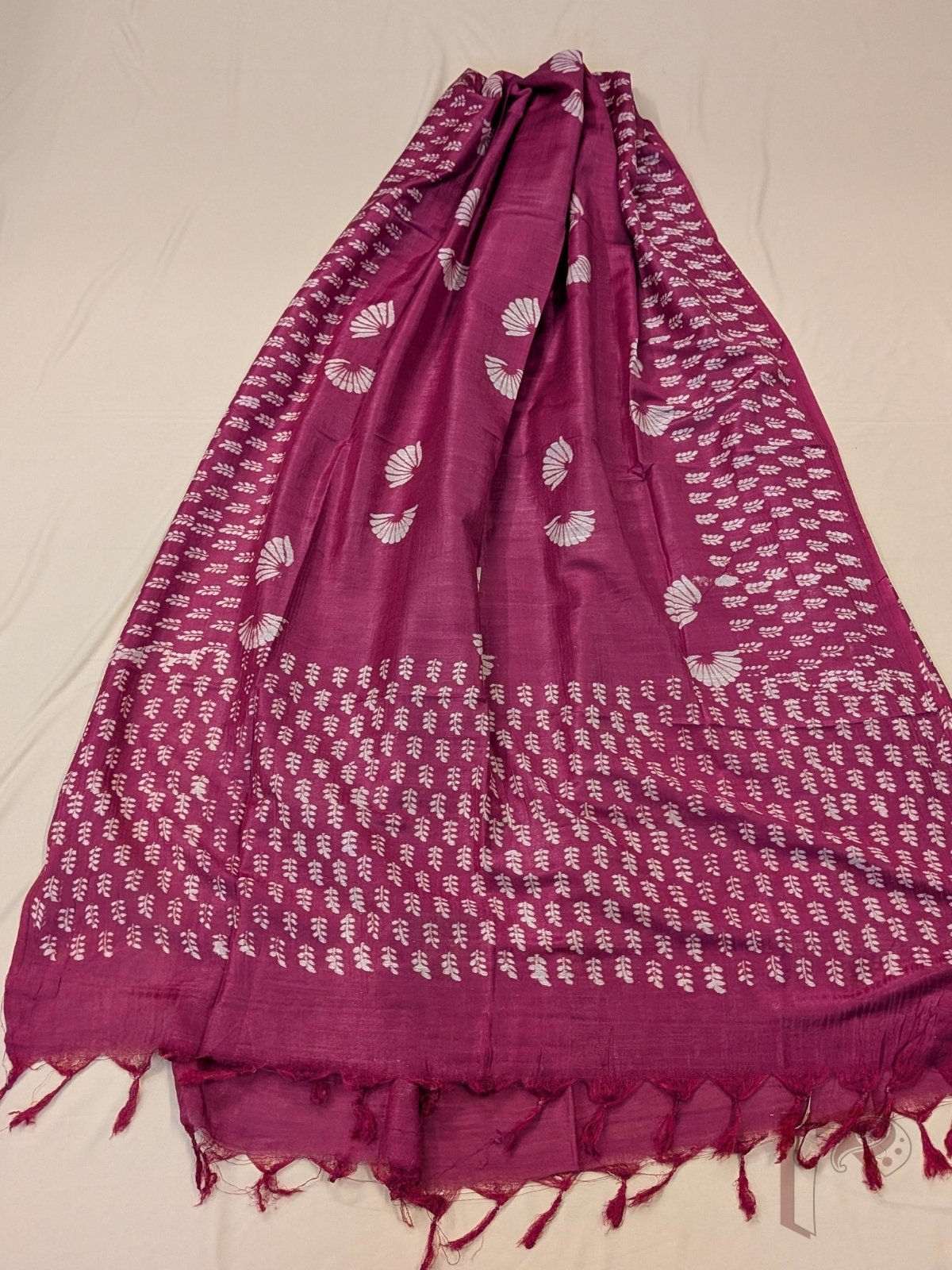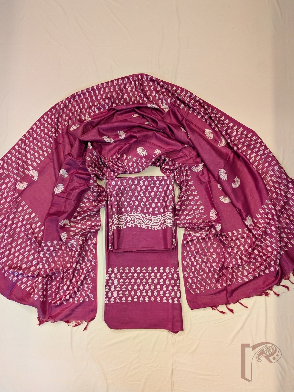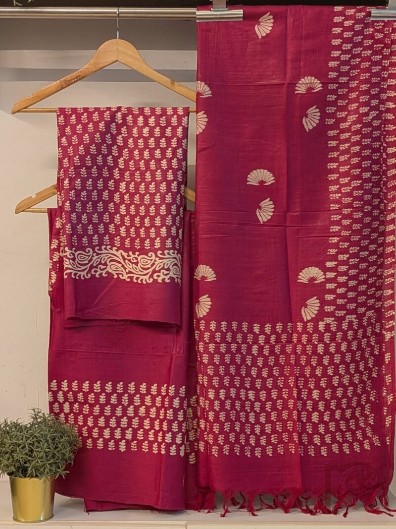Suit Stories – Dark Onion Pink Chanderi Cotton Silk Suit Set with Offwhite Stemmed Leaf Cluster Handblock Motifs and Dupatta