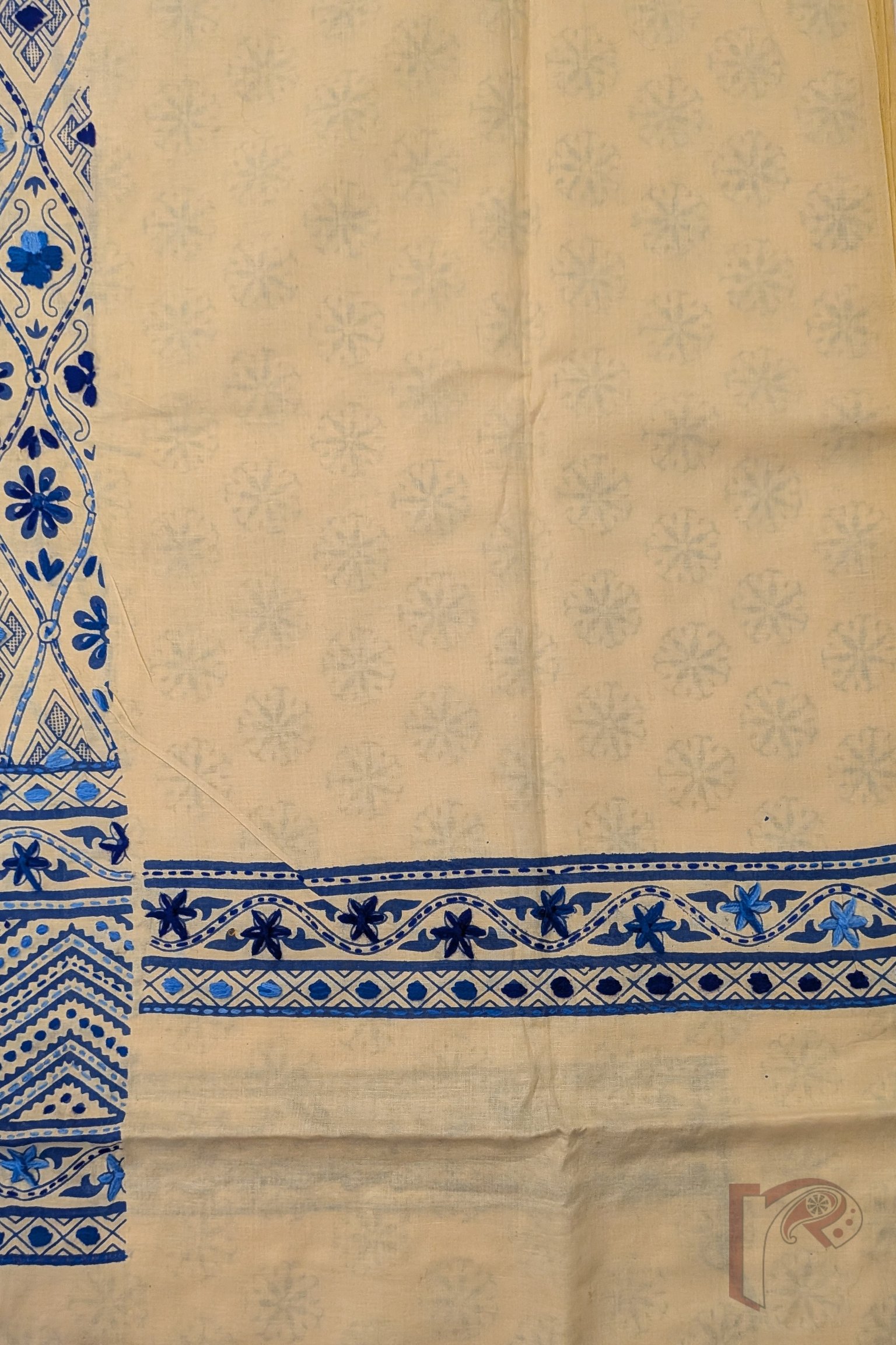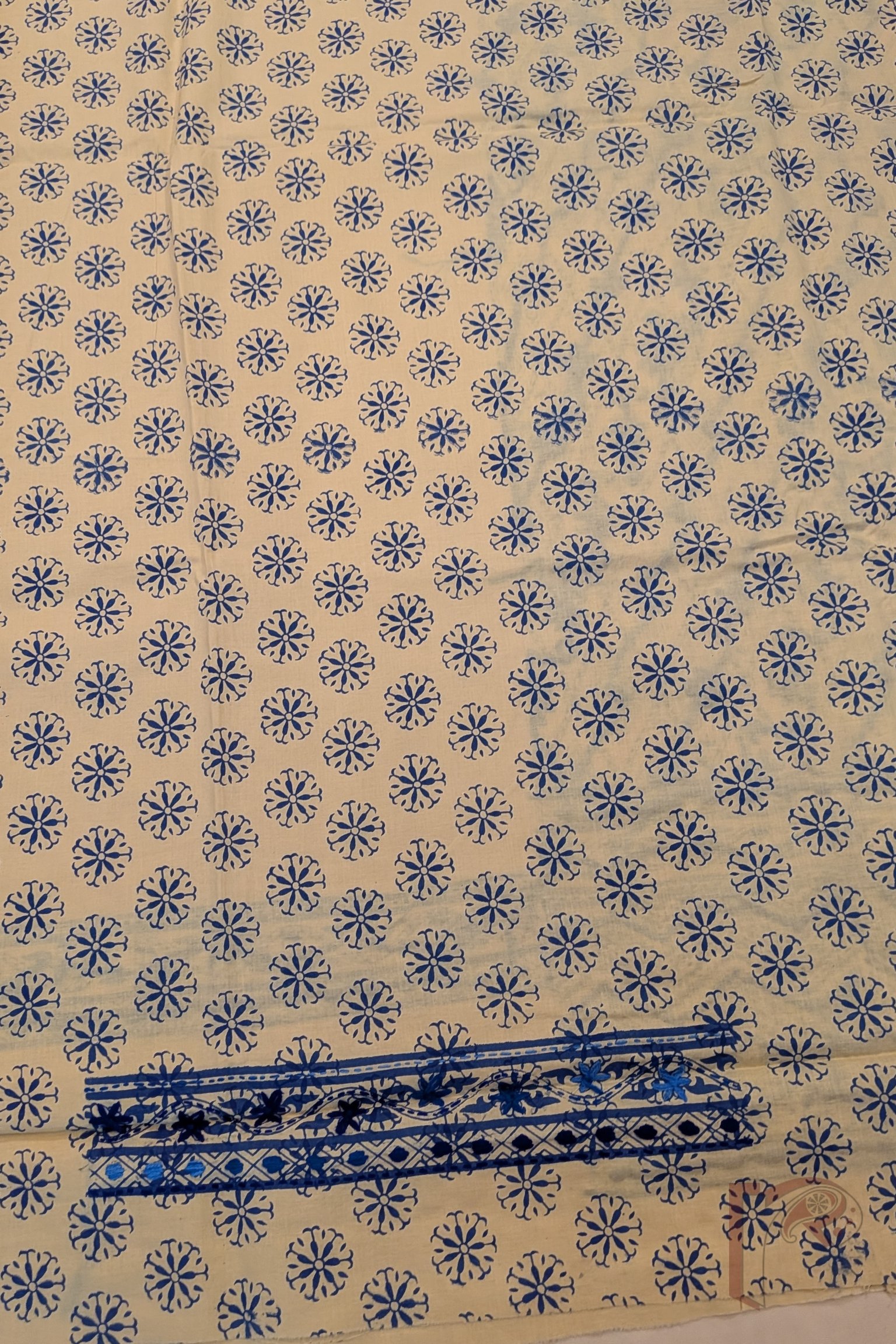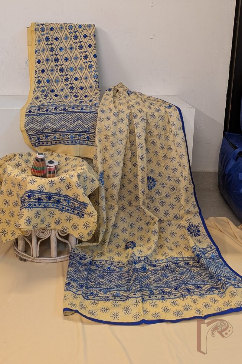 This elegant suit set features a soft fawn beige cotton fabric beautifully decorated with traditional hand block prints and delicate hand embroidery in shades of dark and light blue, creating a graceful and sophisticated design. The kurta front panel showcases floral and diamond motifs arranged diagonally, enhanced with fine embroidery that adds texture and visual richness to the design. A striking 7-inch embroidered border panel along the hem of the kurta further enhances its refined aesthetic, while the sleeves remain understated with a subtle printed and embroidered edge. The coordinated pant fabric carries charming coin-like floral block prints throughout with a delicate embroidered border, perfectly complementing the kurta. Completing the ensemble is a lightweight cotton dupatta adorned with matching block prints and larger embroidered floral motifs, finished with a neat blue border all around. The combination of handcrafted block printing, subtle embroidery, and breathable cotton fabric makes this suit set an elegant choice for both everyday wear and relaxed festive occasions.