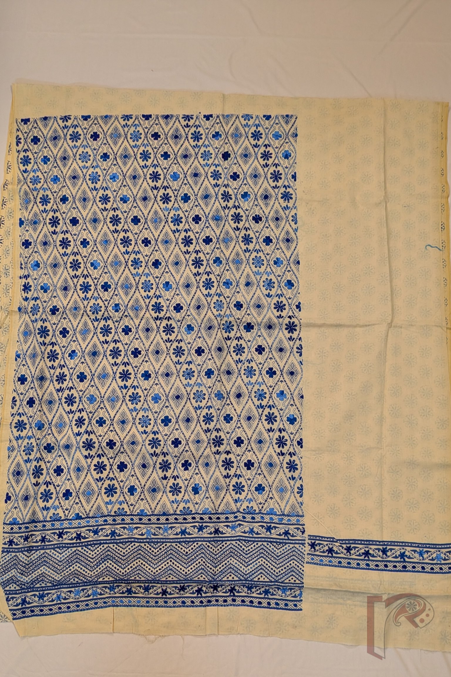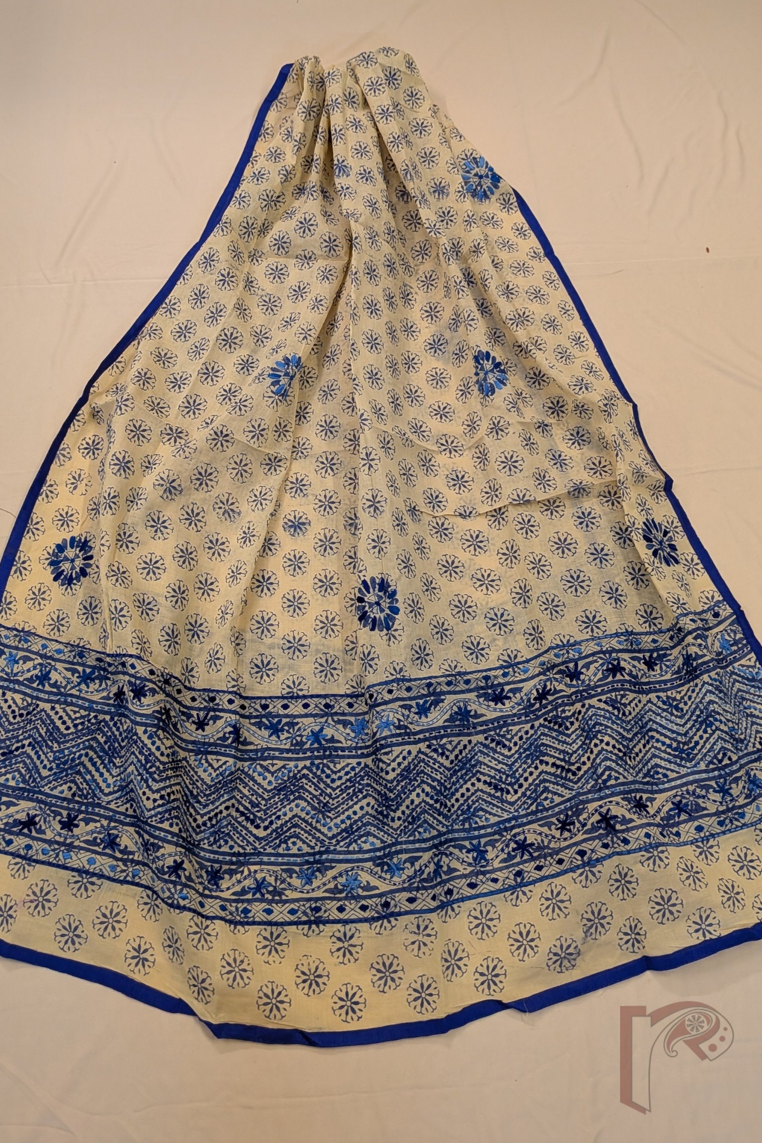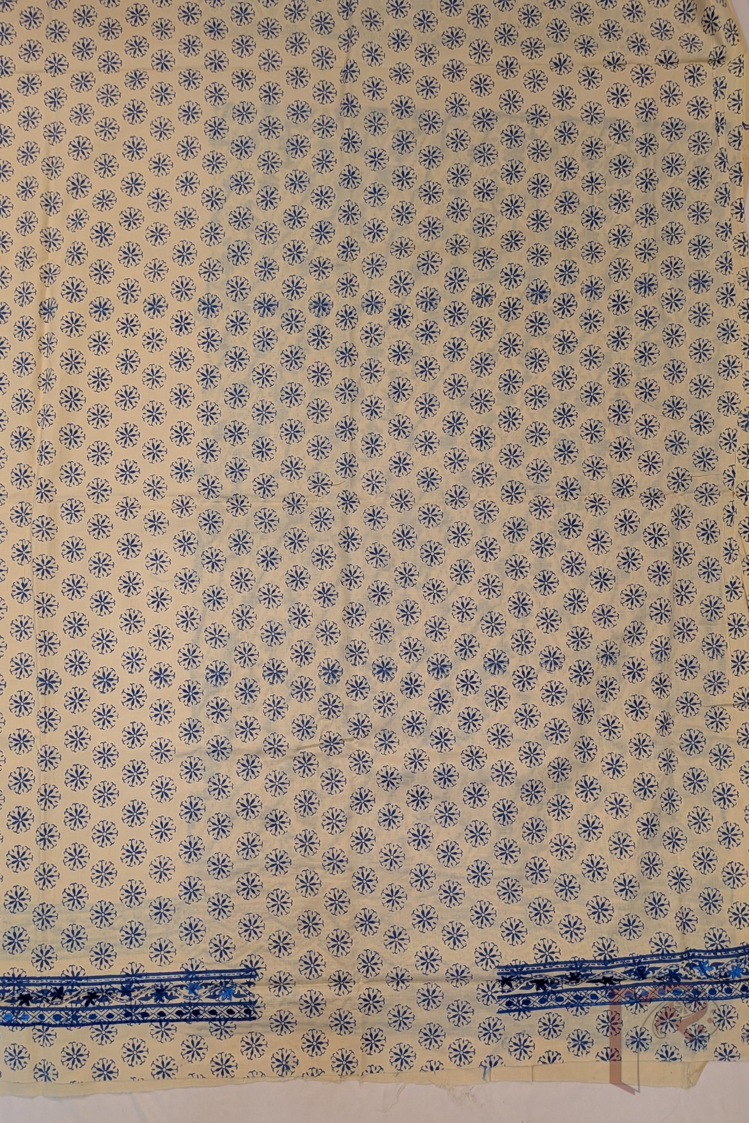 This elegant suit set features a soft fawn beige cotton fabric beautifully decorated with traditional hand block prints and delicate hand embroidery in shades of dark and light blue, creating a graceful and sophisticated design. The kurta front panel showcases floral and diamond motifs arranged diagonally, enhanced with fine embroidery that adds texture and visual richness to the design. A striking 7-inch embroidered border panel along the hem of the kurta further enhances its refined aesthetic, while the sleeves remain understated with a subtle printed and embroidered edge. The coordinated pant fabric carries charming coin-like floral block prints throughout with a delicate embroidered border, perfectly complementing the kurta. Completing the ensemble is a lightweight cotton dupatta adorned with matching block prints and larger embroidered floral motifs, finished with a neat blue border all around. The combination of handcrafted block printing, subtle embroidery, and breathable cotton fabric makes this suit set an elegant choice for both everyday wear and relaxed festive occasions.