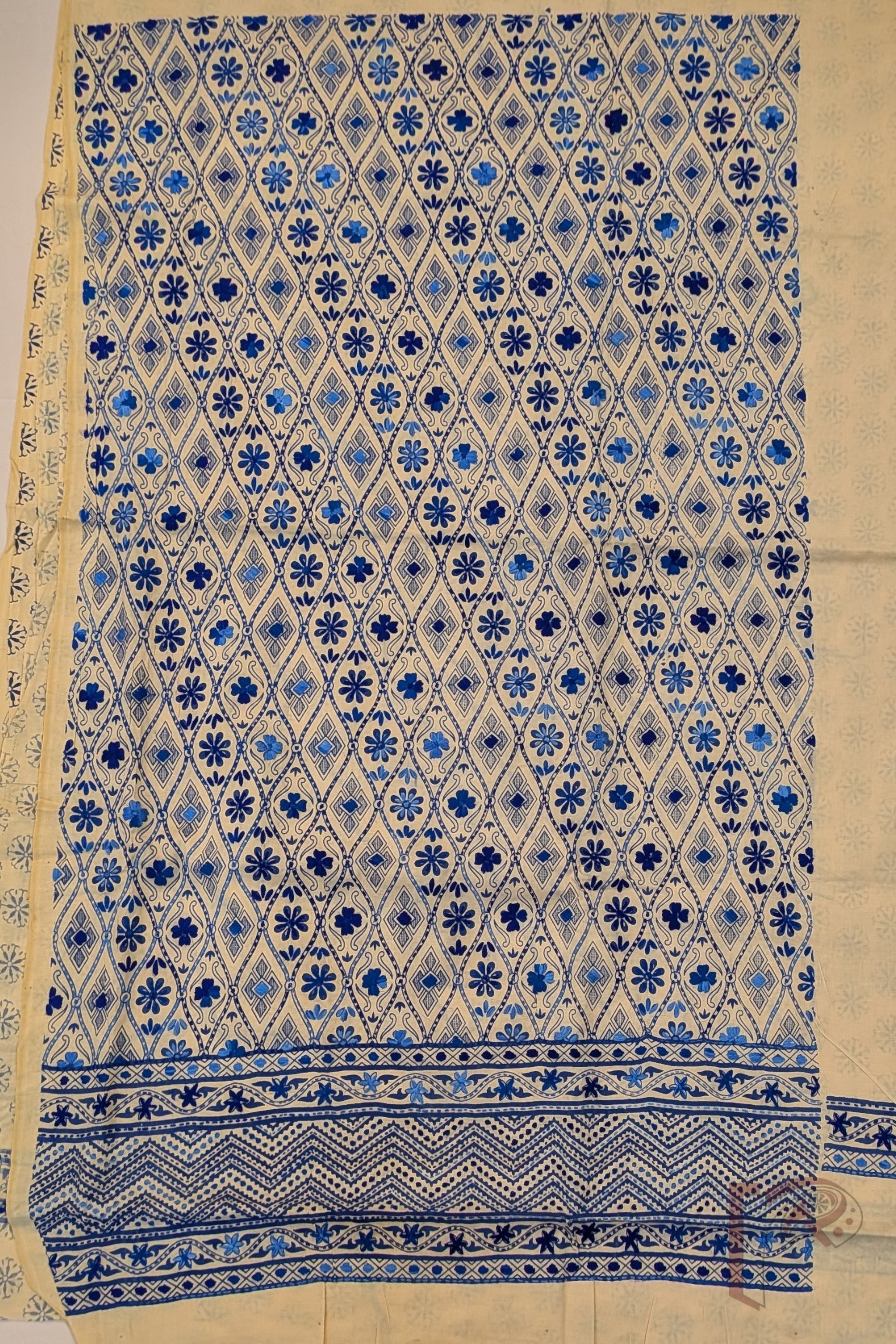 Suit stories – Fawn Beige Cotton Hand Block Printed Diamond and Floral Embroidered Suit Set with Blue Thread Embroidery and Cotton Dupatta