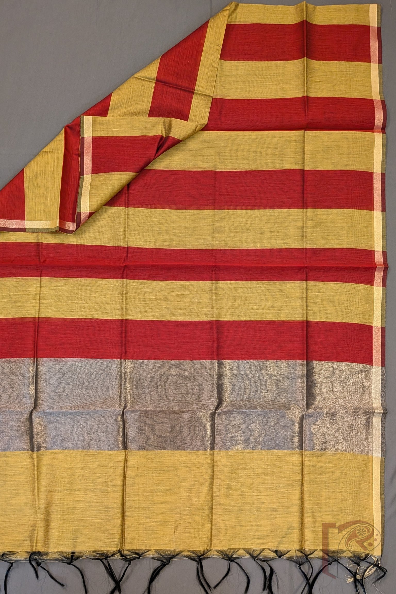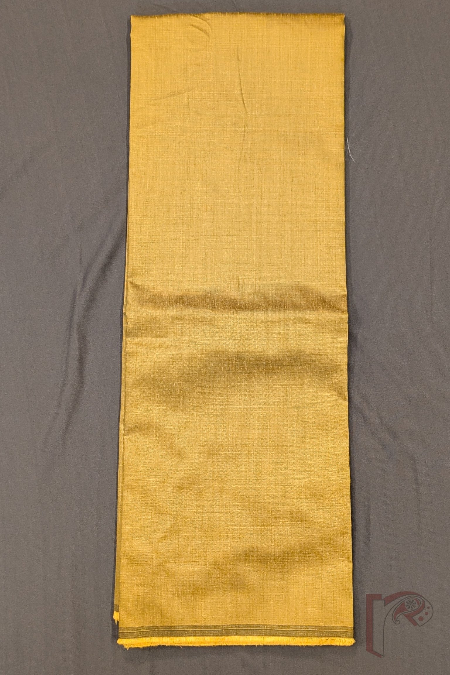 This regal gold-coloured suit material is designed for those who appreciate refined opulence, featuring a seamlessly woven gold 8-inch zari border on the kurta that enhances its luxurious look. The dupatta carries alternating gold and maroon stripes, finished with a glimmering zari trim that adds depth and tradition. Paired with a gold bottom fabric, the ensemble instantly looks festive and grand. The mercerised cotton enhances the piece with a radiant glow and elegant fall, making it perfect for special occasions.