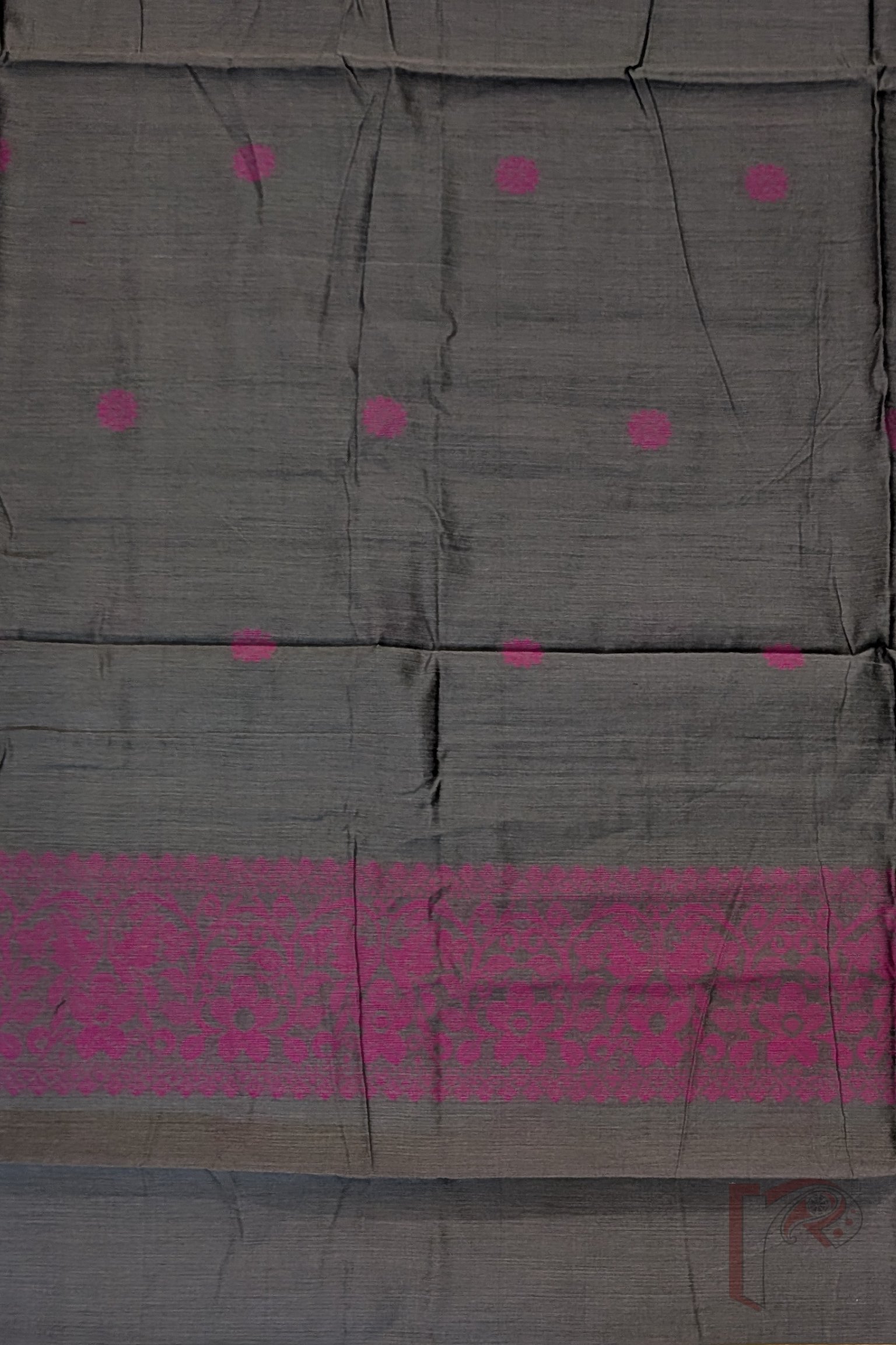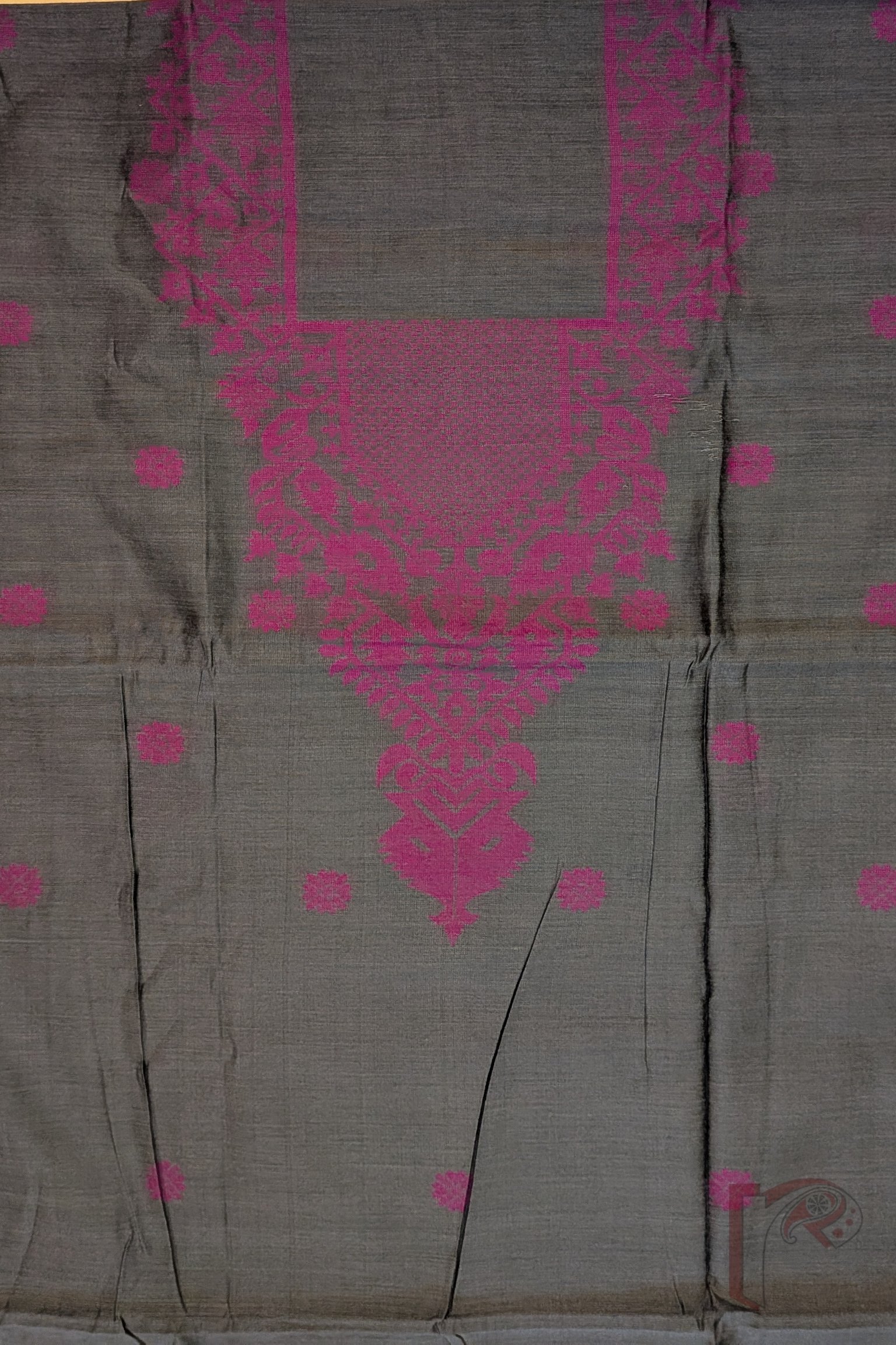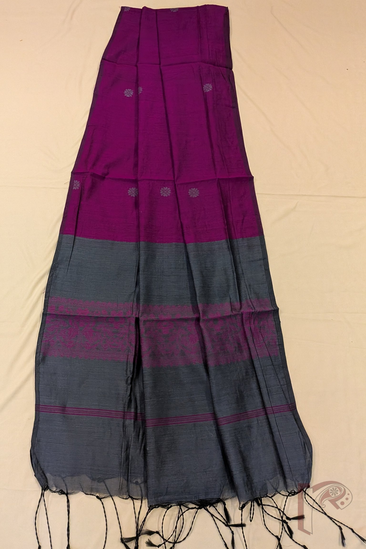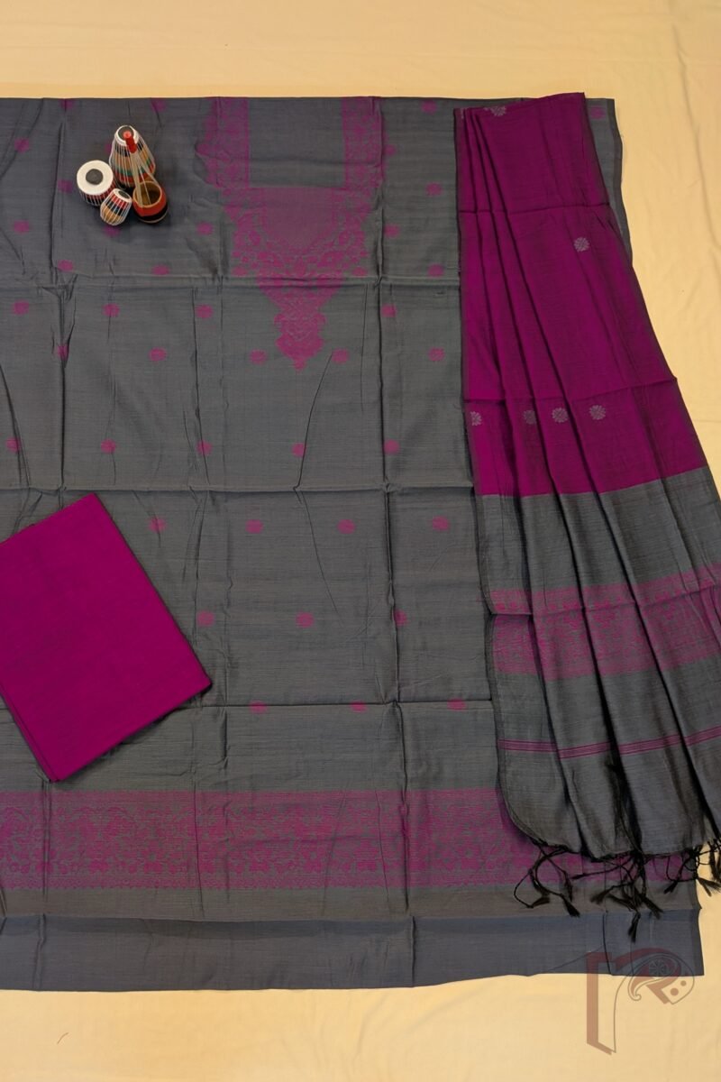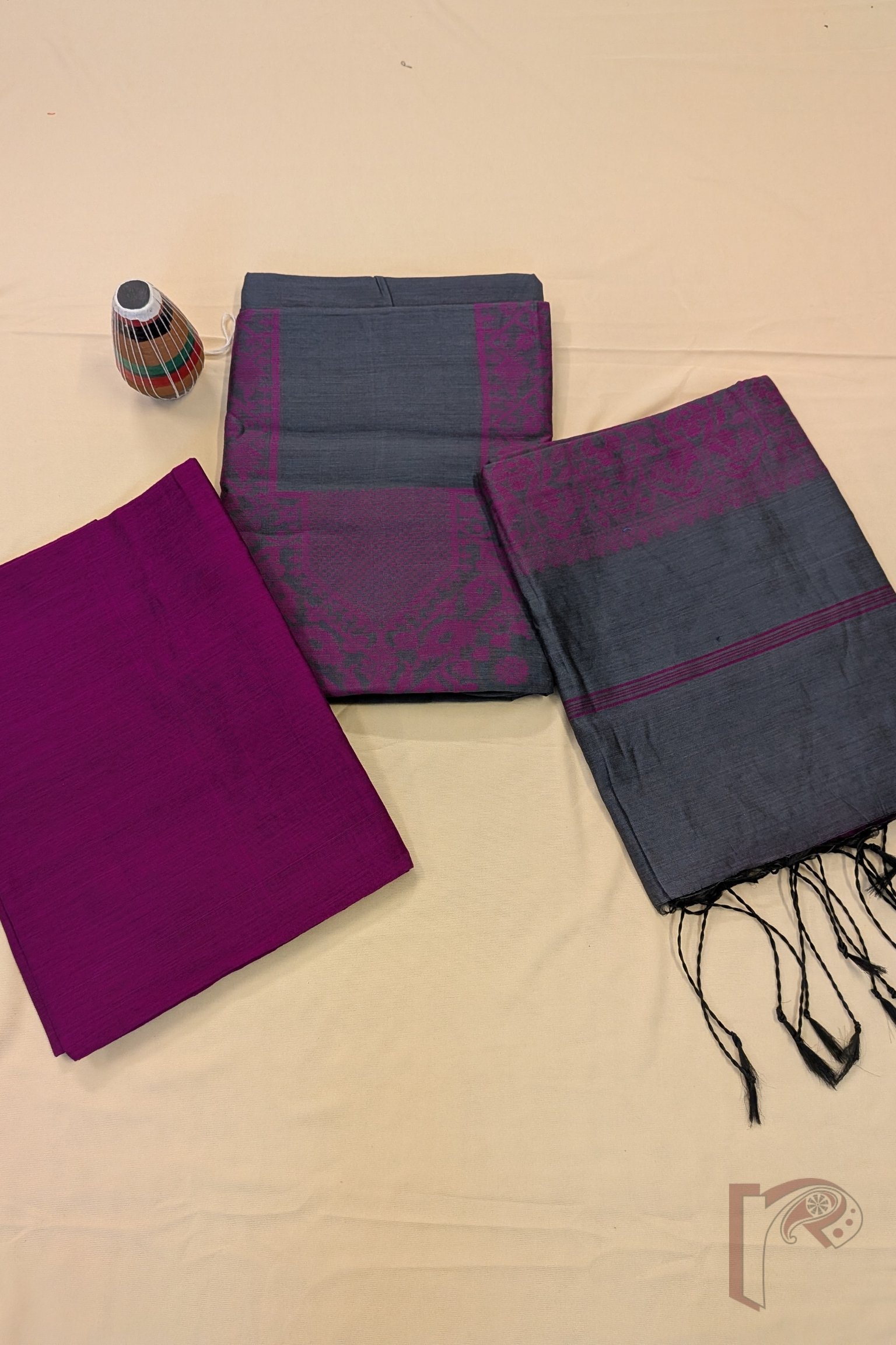 This contemporary suit set showcases a grey Jamdani cotton kurta with floral woven yoke detailing and small flower motifs spread across the body. A woven border near the hem adds definition, while the solid purple pant introduces depth. The dupatta plays with purple and grey Jamdani weaves in inverted tones, making this set a modern interpretation of traditional Jamdani.