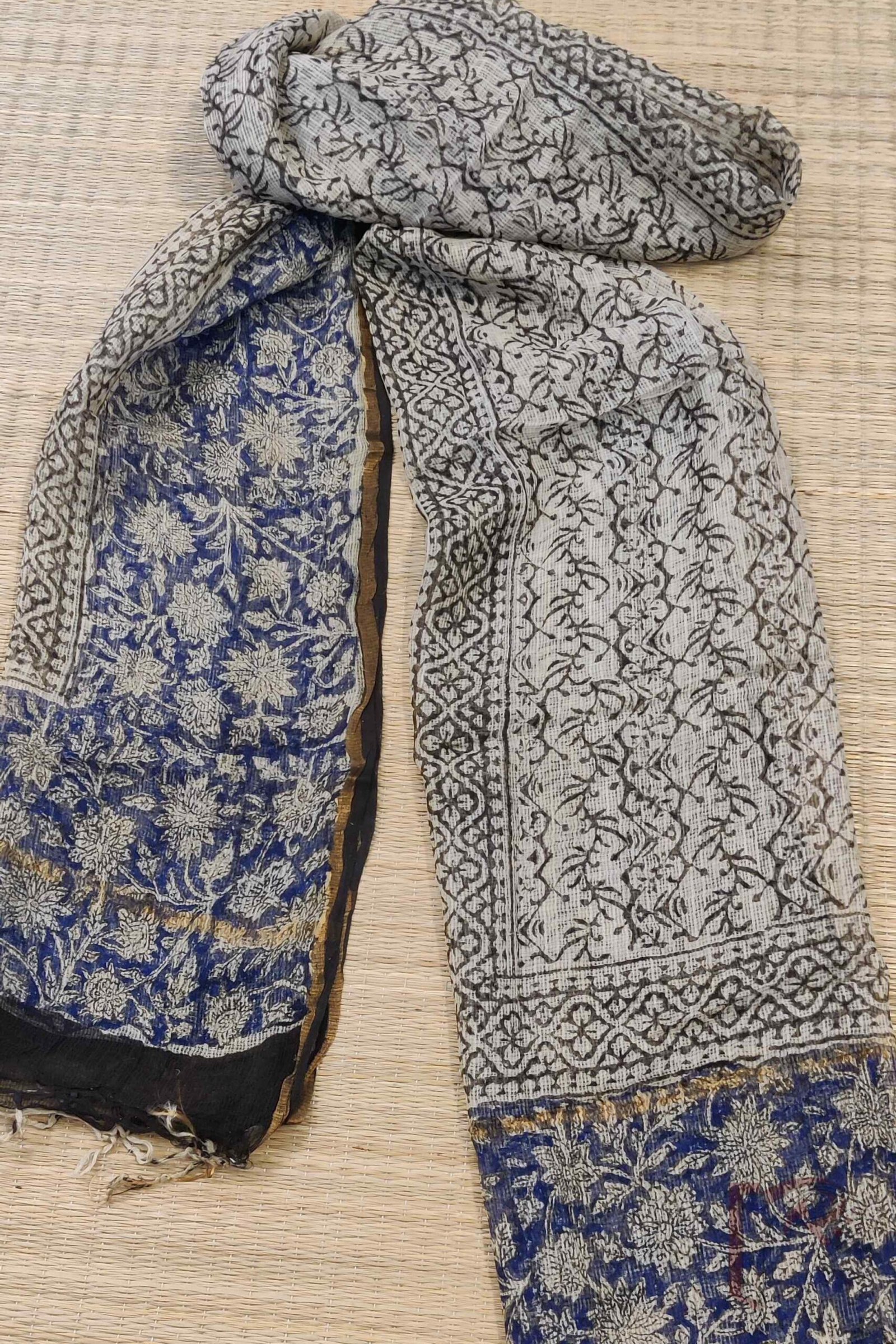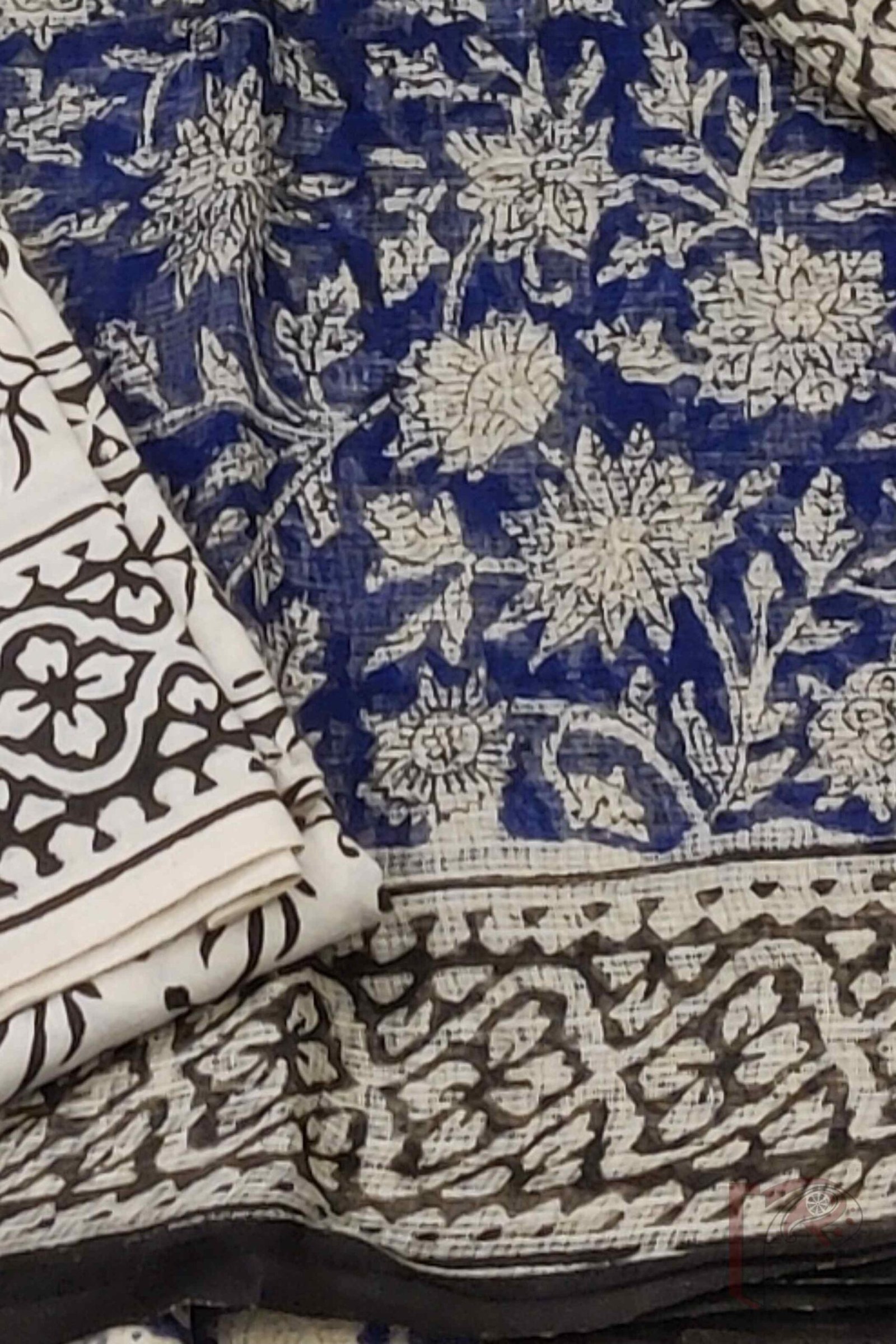 An indigo Kota kurta printed with offwhite kalamkari-style flowers outlined in black gives this set its artistic soul. The offwhite bottom with black motifs and the matching offwhite–indigo Kota dupatta create a balanced, earthy palette that feels rooted, graceful, and thoughtfully handcrafted.