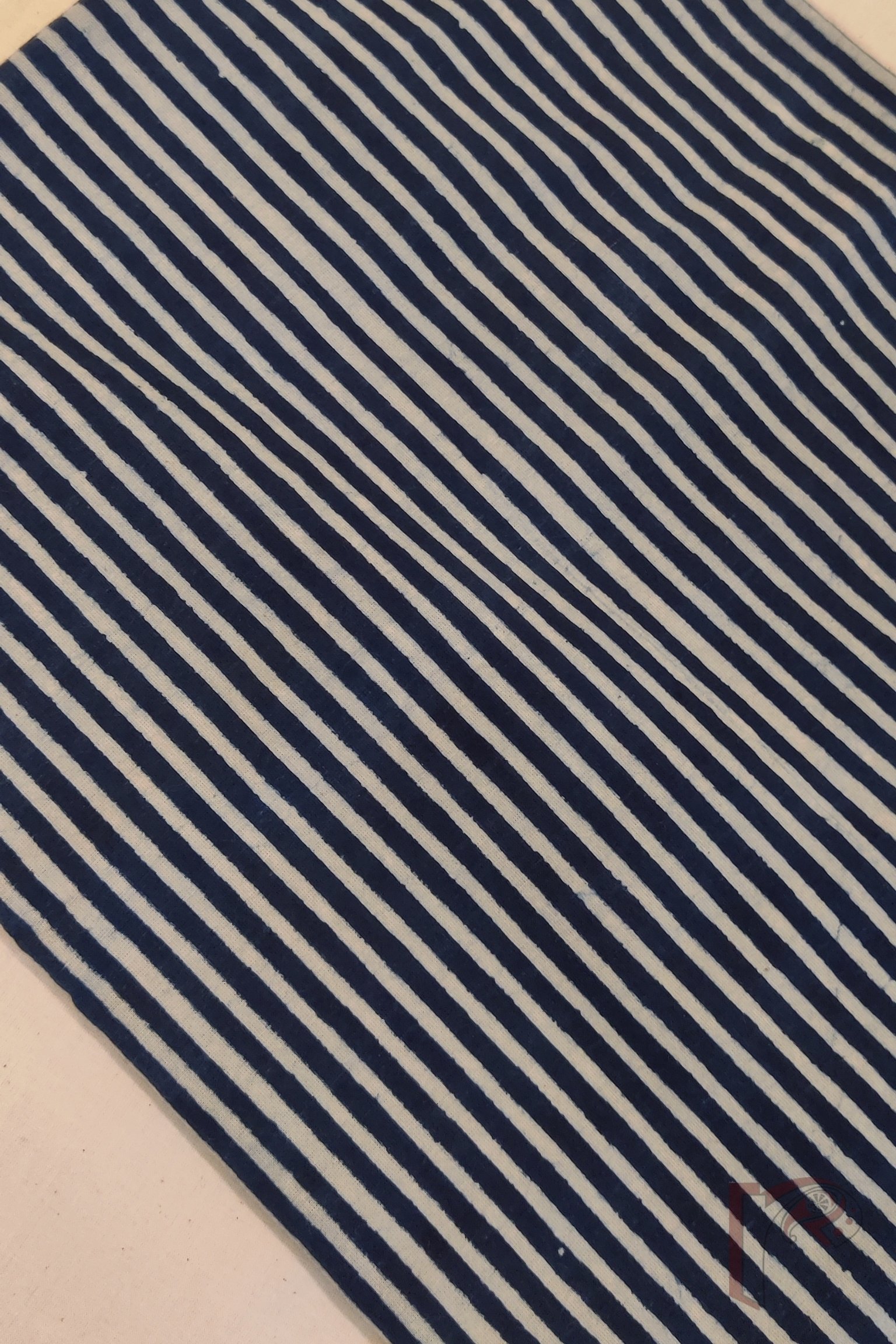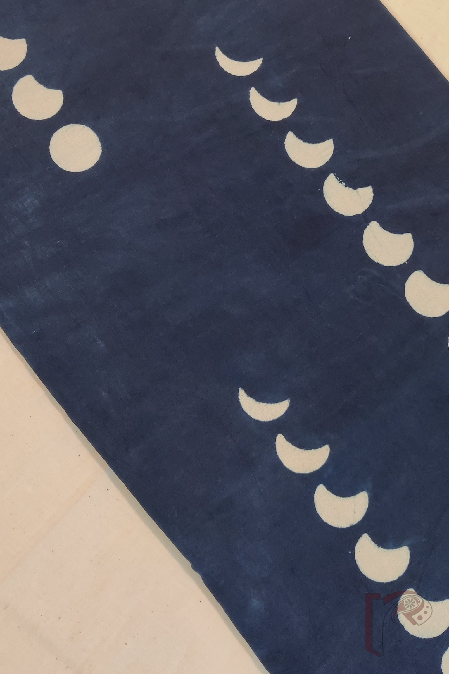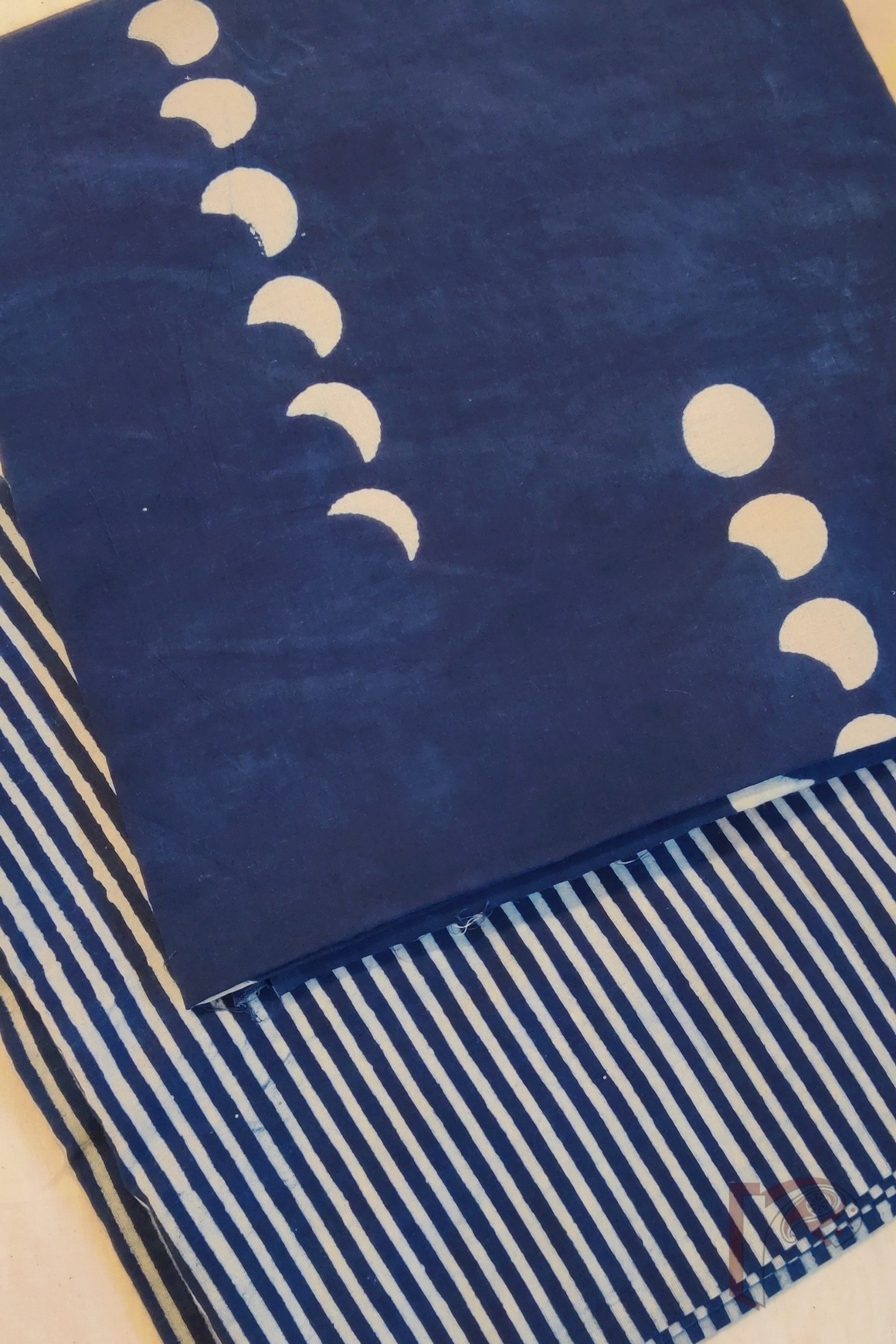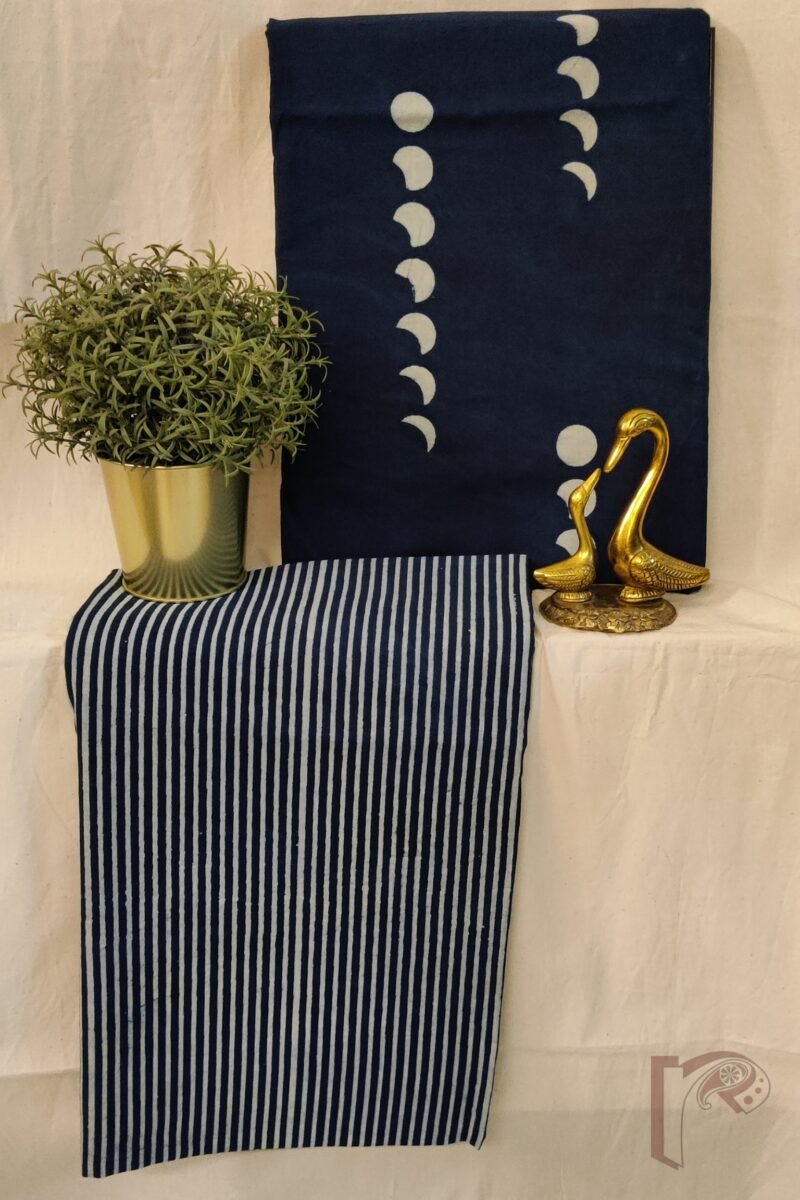 This deep indigo mulmul suit is decorated with cream crescent-to-full moon motifs, creating an enchanting night-sky effect across the kurta. The matching indigo bottom features neat cream pinstripes, lending a refined balance to the ensemble. With its airy mulmul weave and artistically symbolic print, this suit is perfect for anyone who loves rich colours paired with storytelling patterns.